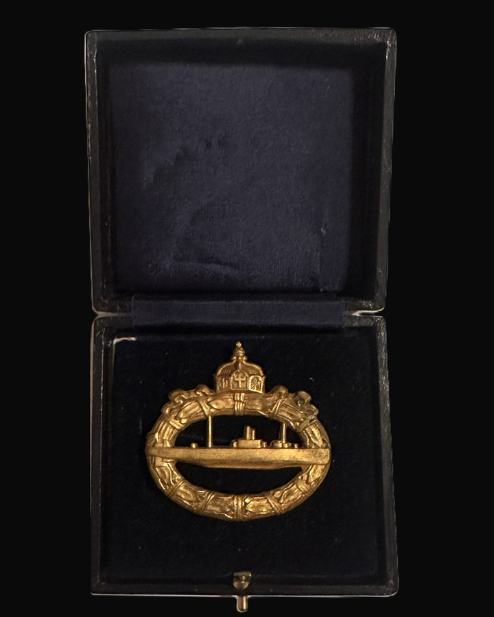 Condition-wise, the badge shows honest age and handling: gilt remains present but is muted and rubbed at the high points, with darker toning in recesses and along edges. Detail is readable across crown, wreath, and submarine, though the overall impression is more utilitarian than razor-struck. The reverse hardware appears intact; function (spring tension, catch security) cannot be guaranteed from photos alone. The case shows typical surface scuffs and age wear, with the velvet presenting some flattening and handling marks consistent with storage and repeated opening over time.