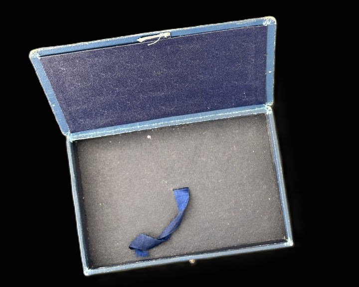 This authentic Imperial German War Memory Case, or “Kriegs-Erinnerungen,” is a remarkable artifact designed to house medals, documents, or keepsakes from the First World War. The case exterior is covered in a sturdy blue fabric, featuring an enamel-like depiction of the Imperial German tricolor flag in black, white, and red. Below the flag, “Kriegs-Erinnerungen” is embossed in elegant gold lettering, signifying its purpose as a container for war memories.