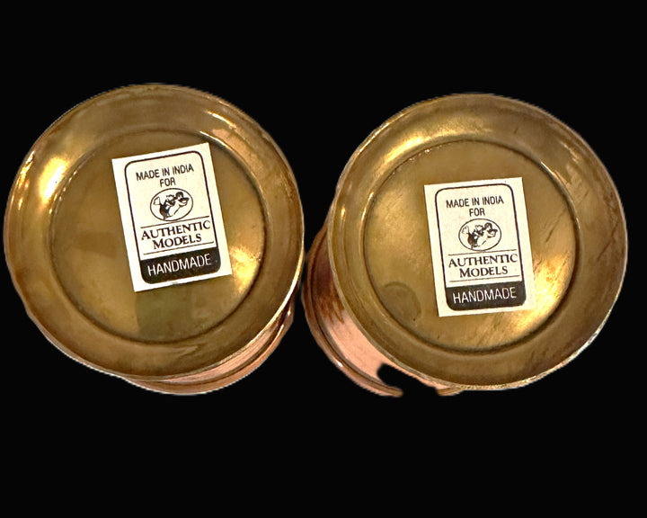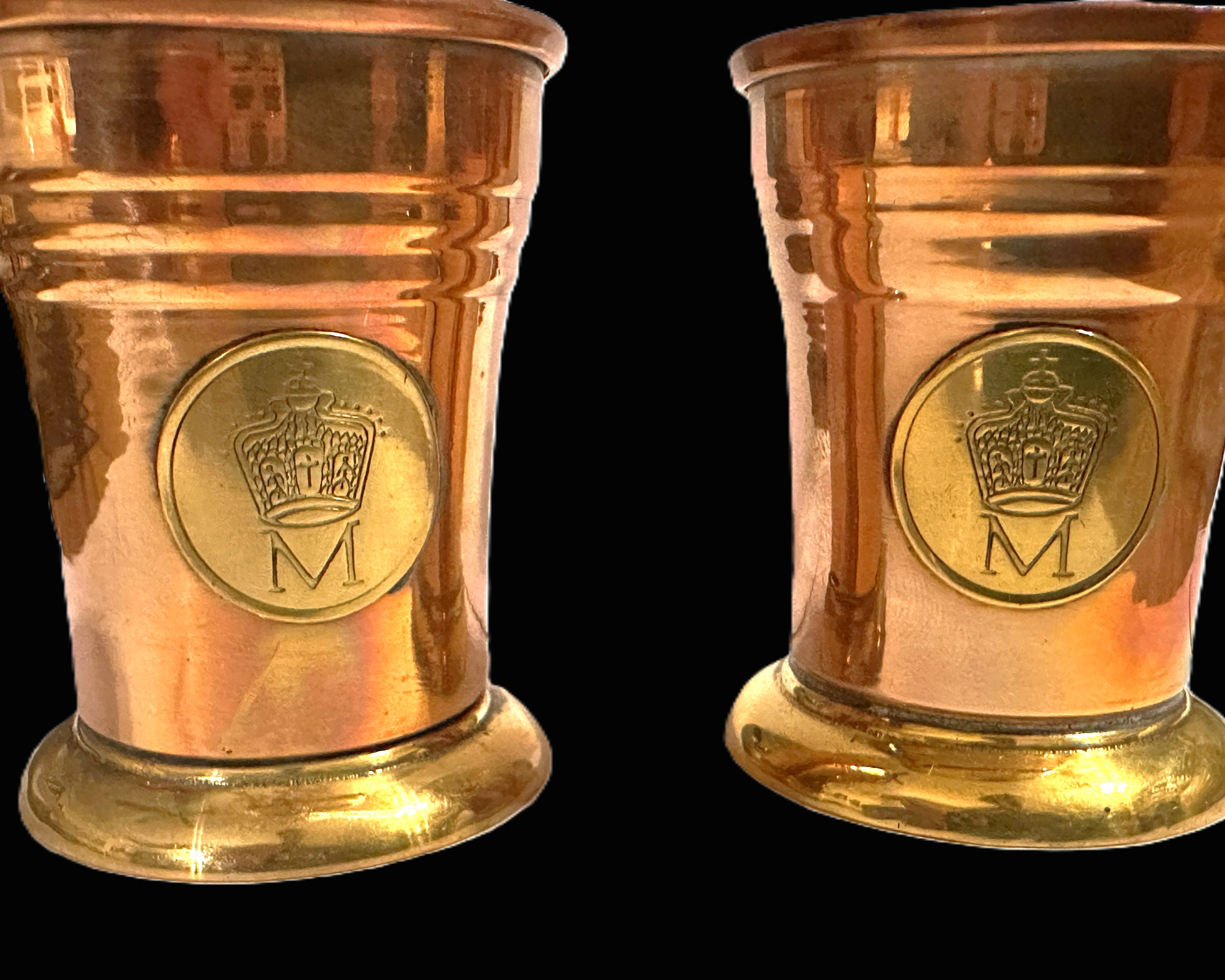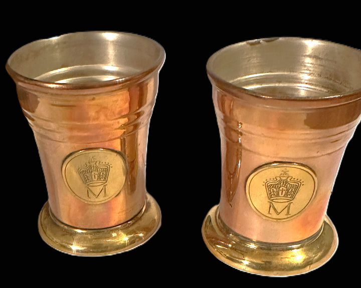 This set consists of two small display cups fashioned in bright copper with silverplated interiors, each standing roughly shot-glass height and fitted with a circular medallion bearing a crowned “M.” The finish is smooth with hand-hammered irregularities that reflect their artisanal manufacture. Both cups sit in a pine presentation box lined with a dark blue drawstring cloth bag, accompanied by a printed card portraying sailors and referencing “German Imperial Navy” rum traditions. Undersides retain matching factory labels reading “Made in India for Authentic Models – Handmade.”