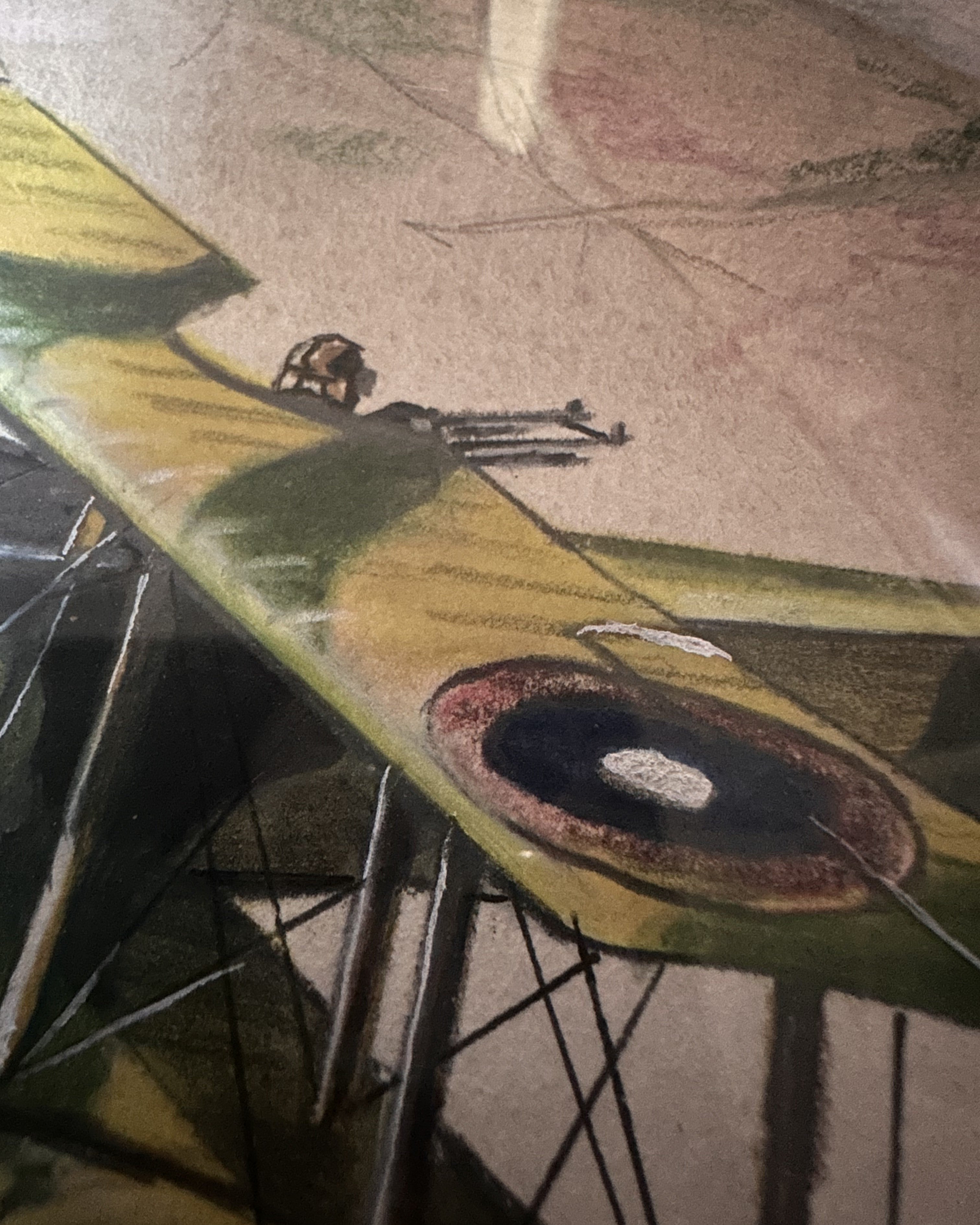 The vivid scene shows the American crew fending off the German attack, with the Pfalz trailing smoke from an oil fire and a seized engine. The pilot, unable to continue the fight, is forced to break off and attempt a landing—an authentic reflection of the desperate duels fought in the closing months of the war.