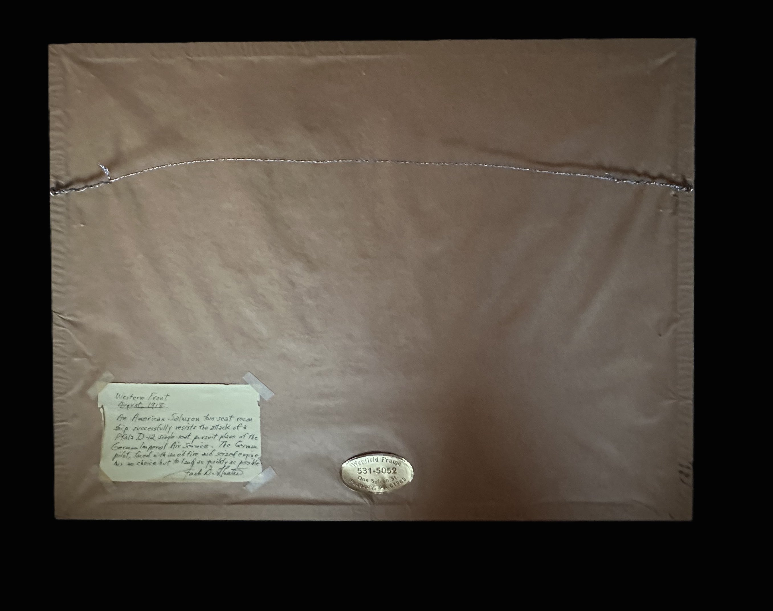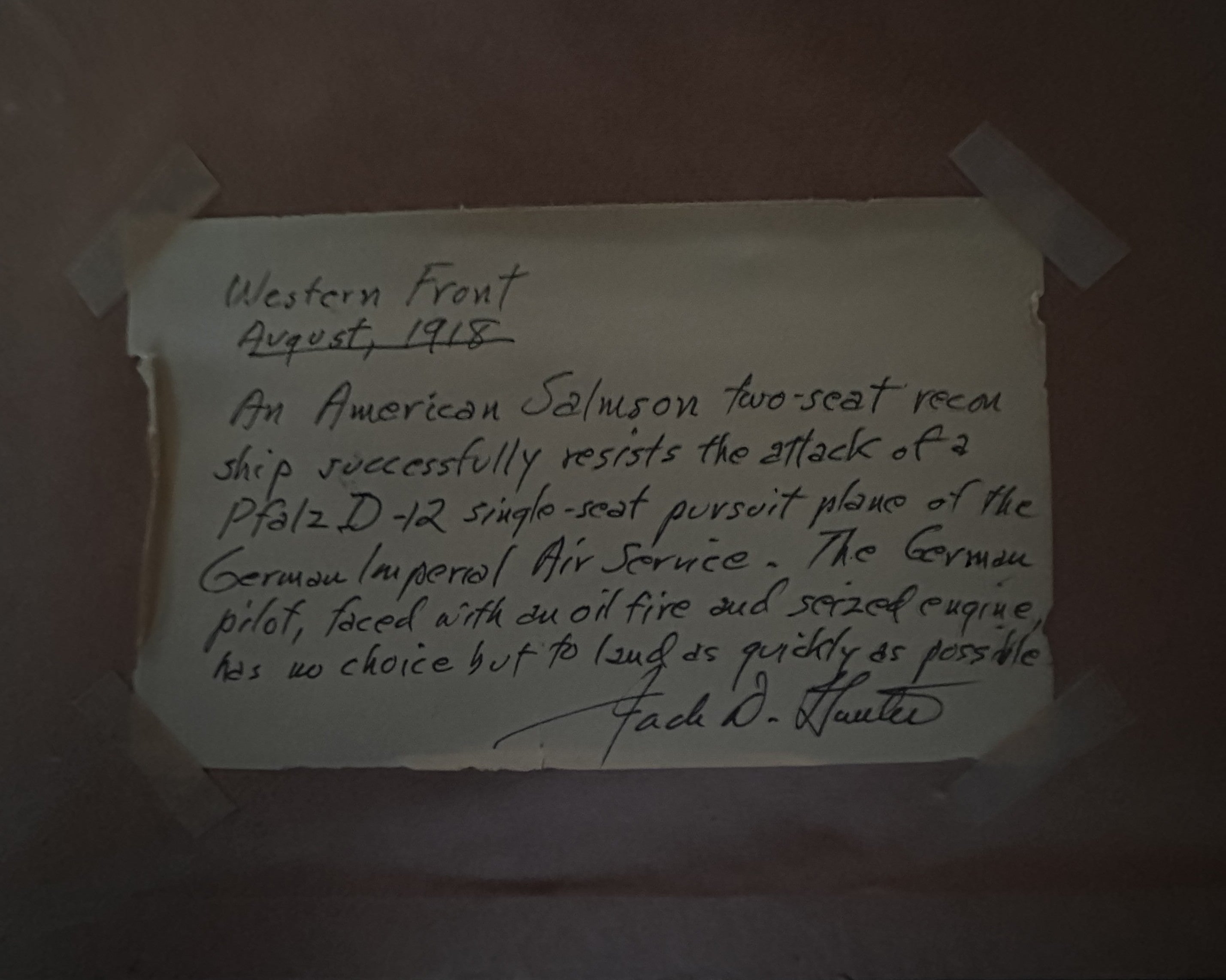 “Western Front, August 1918. An American Salmson two-seat recon ship successfully resists the attack of a Pfalz D-12 single-seat pursuit plane of the German Imperial Air Service. The German pilot, faced with an oil fire and seized engine, has no choice but to land as quickly as possible.” – Jack D. Hunter