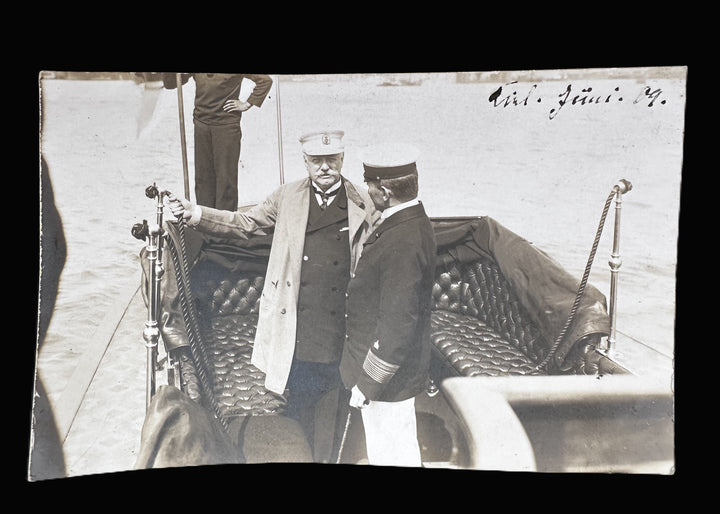 This vintage photograph captures Kaiser Wilhelm II in a candid moment aboard an officer's launch, accompanied by high-ranking naval personnel. The image, dated "Juni 19," showcases Wilhelm II in a tailored overcoat and naval-style hat, exuding his commanding presence as a central figure of the German Empire and its navy. The plush seating in the launch and the intricate details of the craft reflect the elegance of imperial naval vessels.