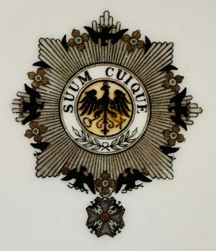 - Central Emblem: The plate’s centerpiece features the Order of the Black Eagle, Germany’s highest order of chivalry. Encircled by the motto “Suum Cuique” (“To Each His Own”), the emblem is meticulously rendered with gold, black, and silver detailing, underscoring its royal connections.