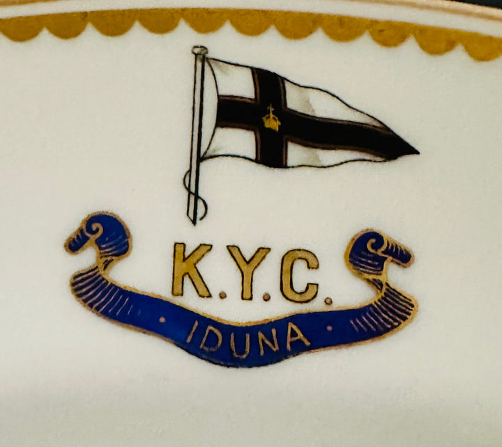 - Club Crest: The top of the plate is adorned with the KYC’s insignia—a striking club burgee (flag) in black and white, with a bold blue ribbon bearing the text “K.Y.C.” and “Iduna,” which references the famous Imperial yacht.