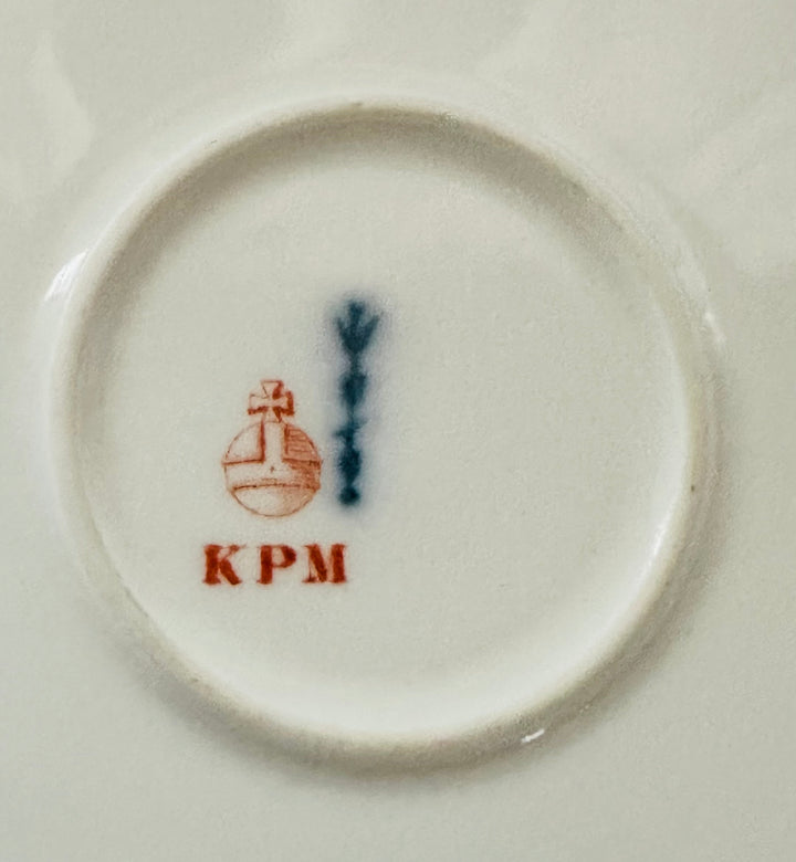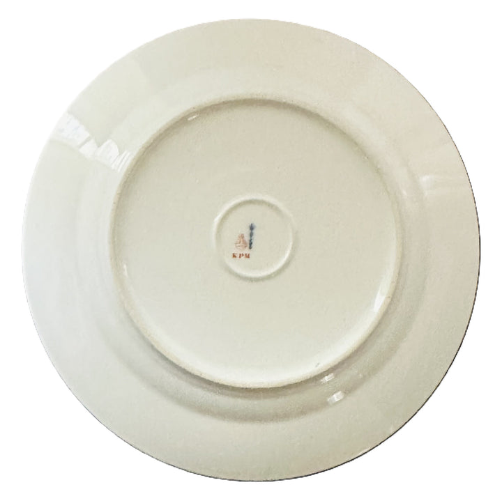 The underside of the plate bears the distinctive KPM hallmark, including the red orb and blue scepter, confirming its manufacture by the Königliche Porzellan-Manufaktur. This mark signifies the highest quality porcelain, used exclusively for royal and noble commissions during the late 19th and early 20th centuries.