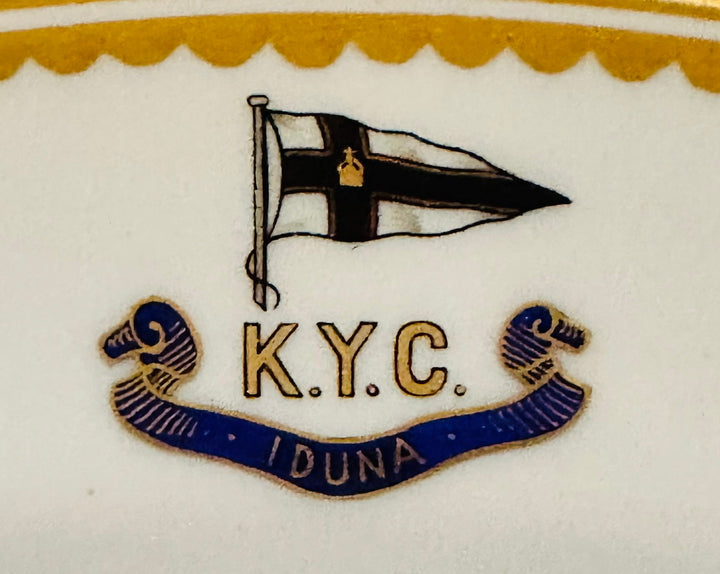 - Club Crest: The upper rim features the KYC insignia, including a burgee (club flag) in black and white and a blue ribbon with the inscription “K.Y.C.” and “Iduna,” referencing the famed yacht associated with the club.