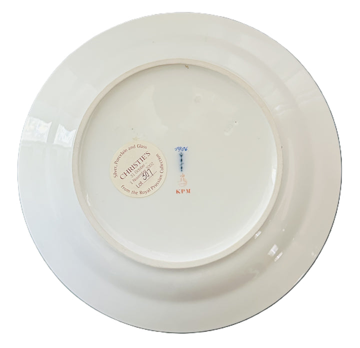 The underside of the plate bears the hallmark of KPM, including the red orb and blue scepter, certifying its royal origins. The plate also includes the date 1906, stamped in blue, marking its production year. Additionally, a Christie’s auction sticker from the 2002 sale of the Royal Prussian Collection adds further historical significance and provenance.
