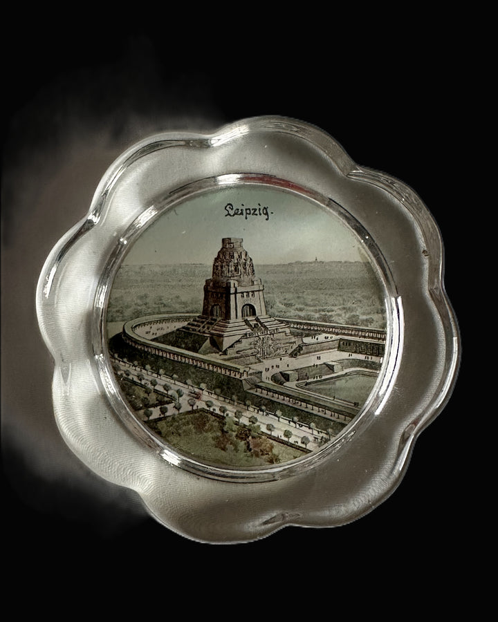 This finely made glass paperweight commemorates the monumental Völkerschlachtdenkmal (Monument to the Battle of Nations) in Leipzig, Germany. Measuring approximately 3.5 inches (9 cm) in diameter, it features a domed, scalloped-edge form enclosing a vivid printed and hand-tinted image of the memorial viewed from above, captioned simply “Leipzig.” The underside retains its original black paper backing.
