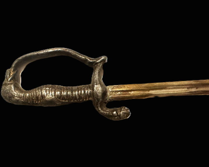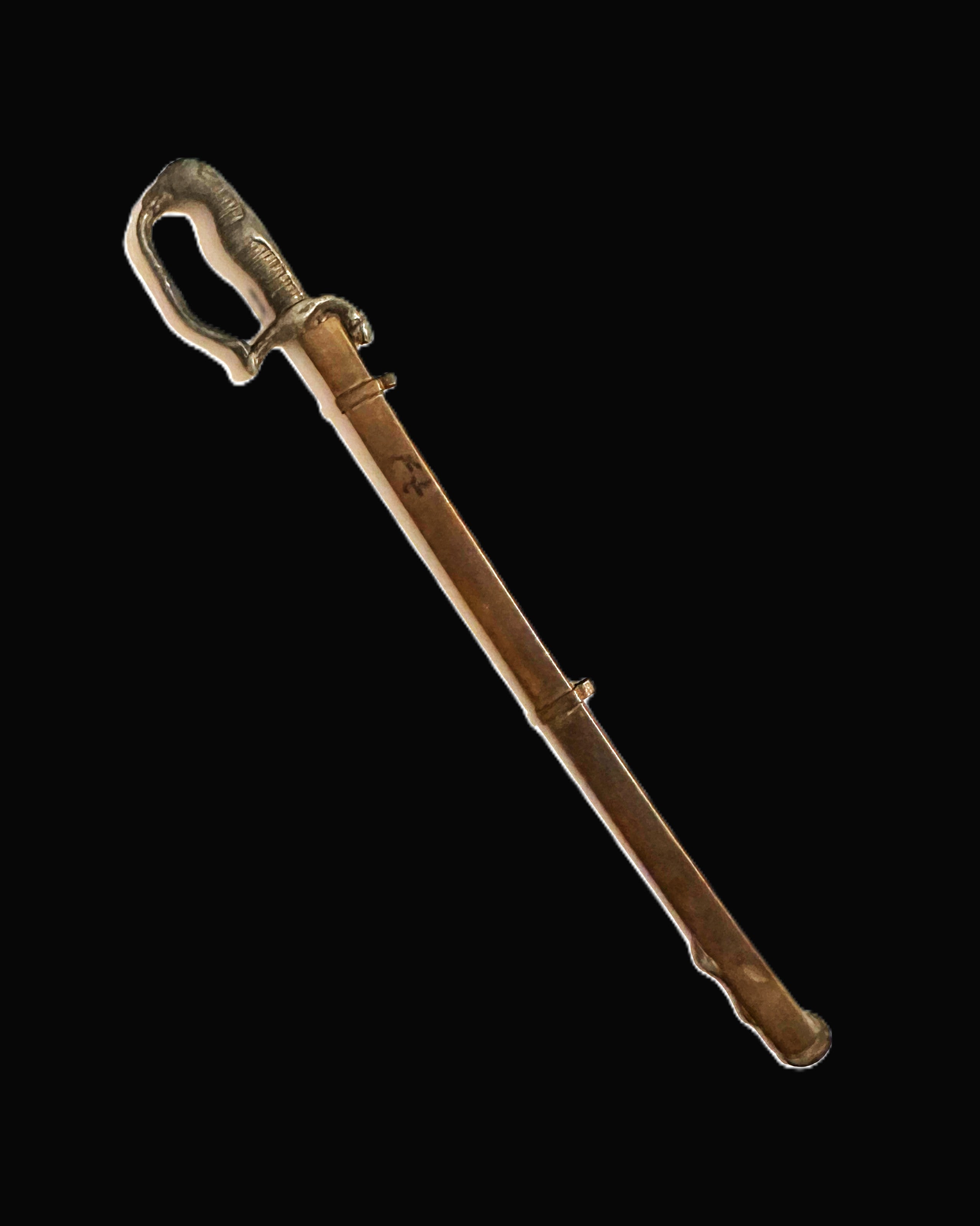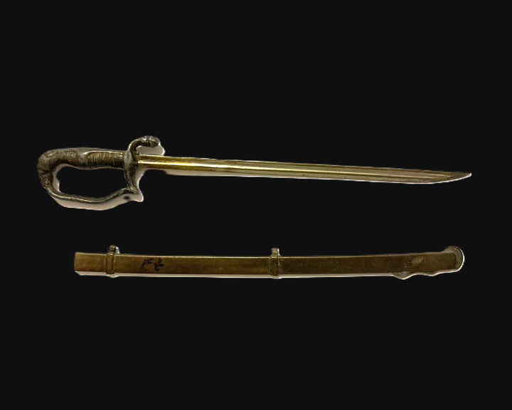 This diminutive 8.5-inch letter opener is fashioned in the form of an Imperial German officer’s sword, complete with a companion scabbard and unmistakable period styling. Cast in a brass-based alloy with a silvered hilt, the piece mirrors the silhouette of the pre-1914 Kavallerie and Infanterie officers’ sabers, including the fully enclosed knuckle bow, ribbed grip, and langet-like quillon. The blade is straight with a defined central ridge and a slightly clipped spear-point profile. Its scabbard features two integral suspension bands and a rounded drag, all rendered in miniature but consistent with full-sized German sabers of the Kaiserzeit.