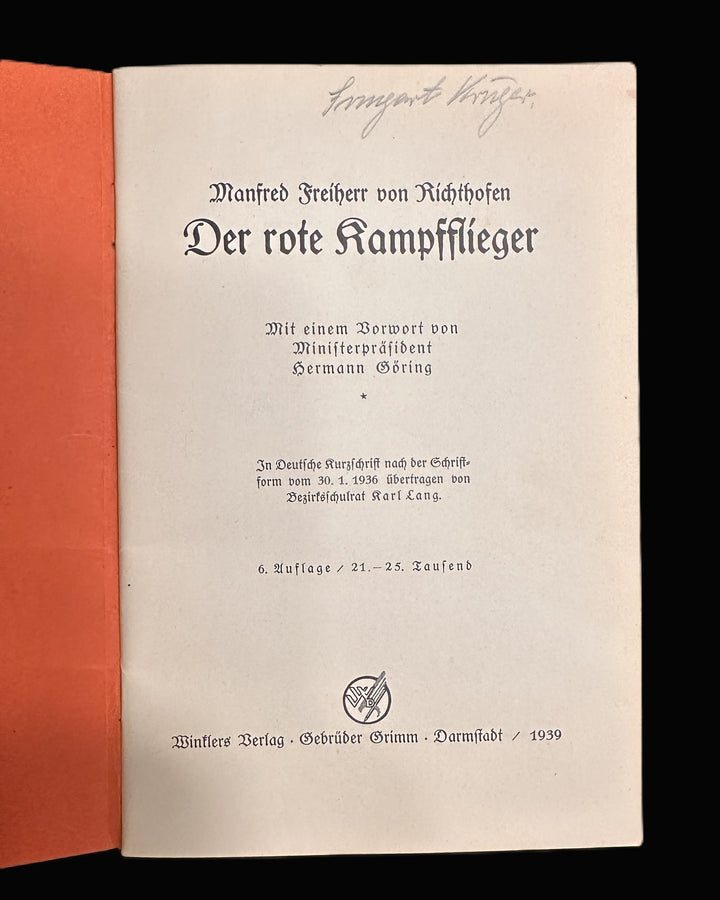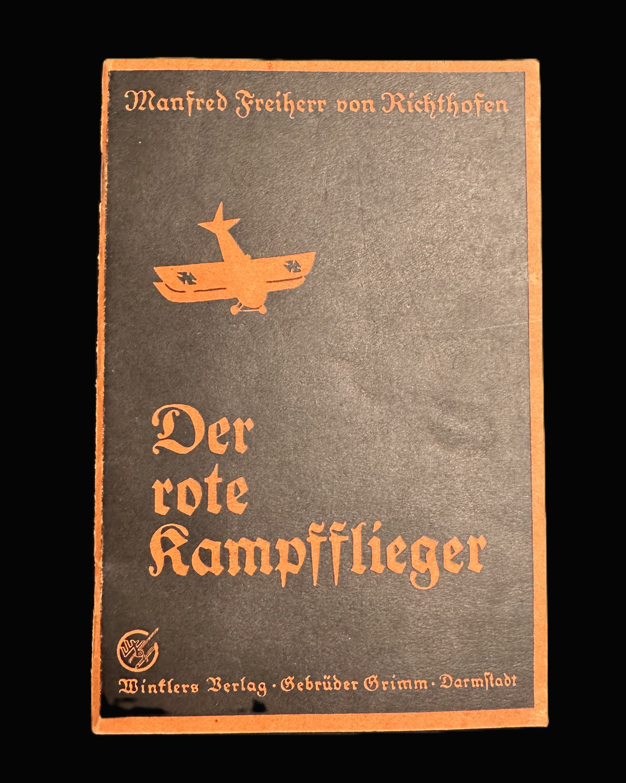 This item is a German-language edition of Der rote Kampfflieger by Manfred Freiherr von Richthofen, the celebrated First World War fighter ace known as the “Red Baron.” The book shown is the sixth edition, identified on the title page as “6. Auflage / 21.–25. Tausend,” and published in 1939 by Winklers Verlag, Gebrüder Grimm, Darmstadt. It is a later interwar/early Third Reich reissue of Richthofen’s wartime memoir rather than a contemporary WWI printing.