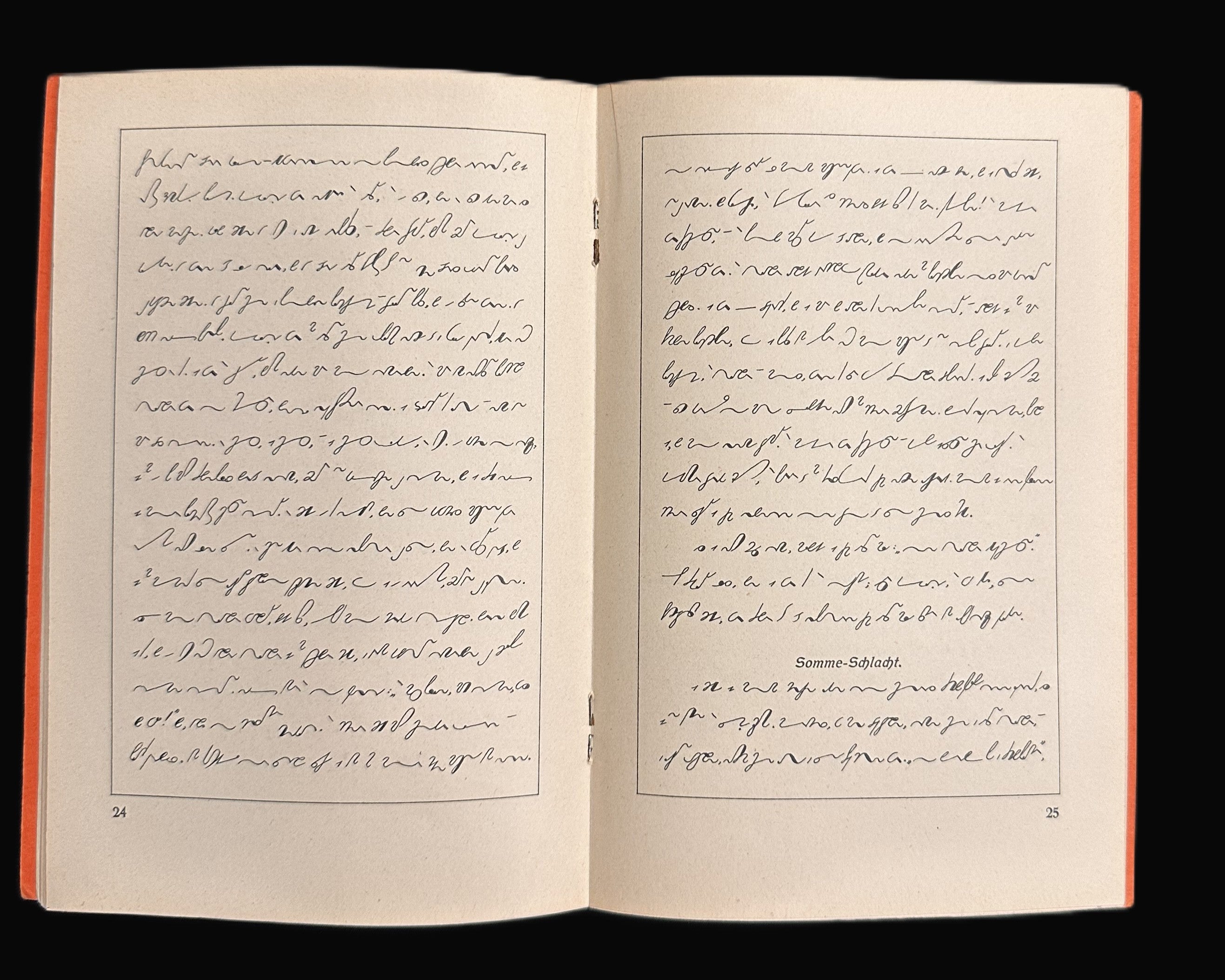 The book is bound in a softcover format with a black front cover bordered in red-orange, featuring the title Der rote Kampfflieger in Gothic script, Richthofen’s name at the top, and a stylized aircraft emblem bearing Eisernes Kreuz markings. The rear cover is plain red-orange. Internally, the title page confirms that the text has been rendered into Deutsche Kurzschrift according to the standardized script form of 30 January 1936, transferred by Bezirksjustizrat Karl Lang. A notable political feature of this edition is the foreword credited to Ministerpräsident Hermann Göring, linking the publication directly to the Luftwaffe-era cult of WWI aviation heroes. The interior includes printed reproductions of Richthofen’s handwritten shorthand pages, presented as facsimiles within bordered frames, emphasizing authenticity and personal authorship.