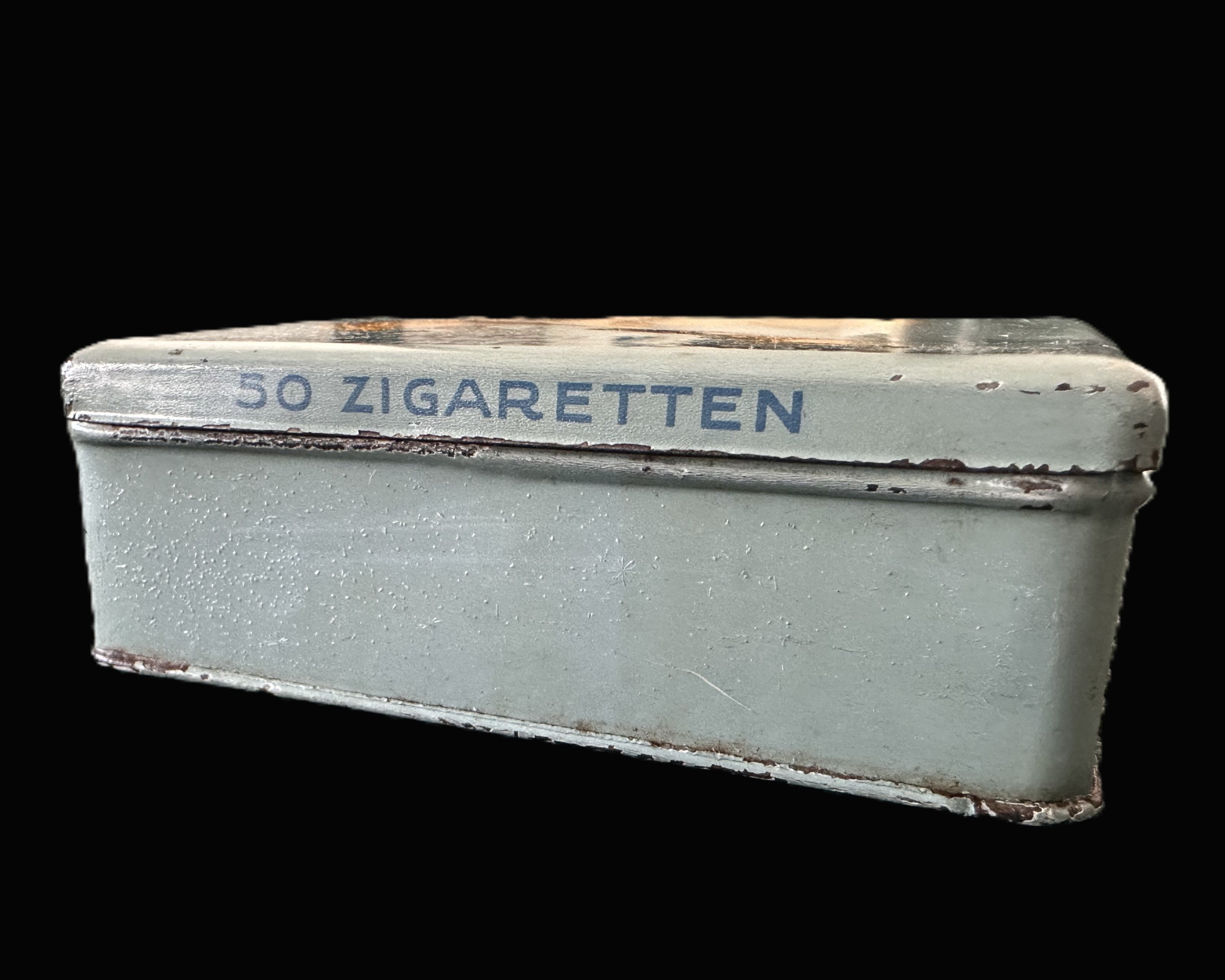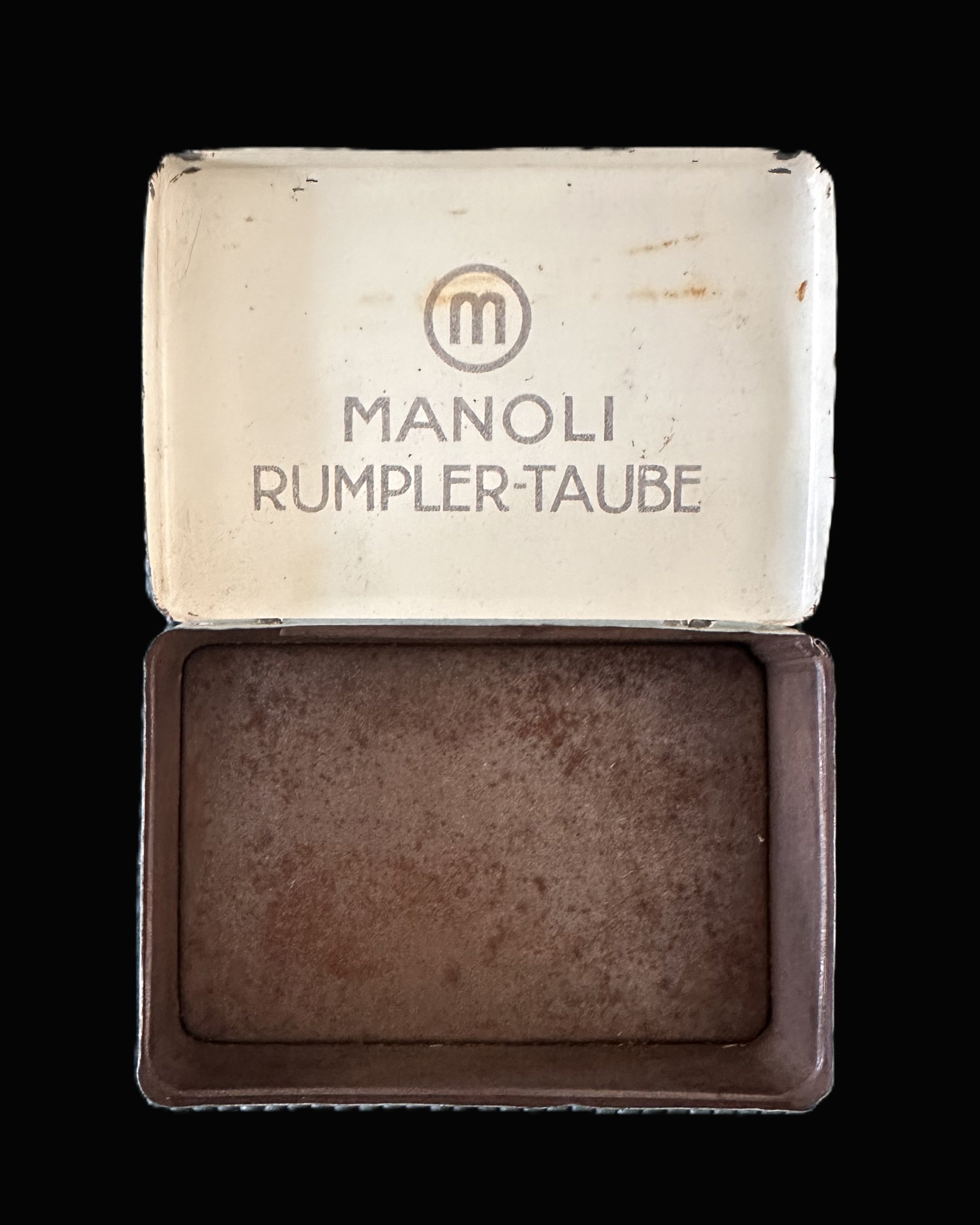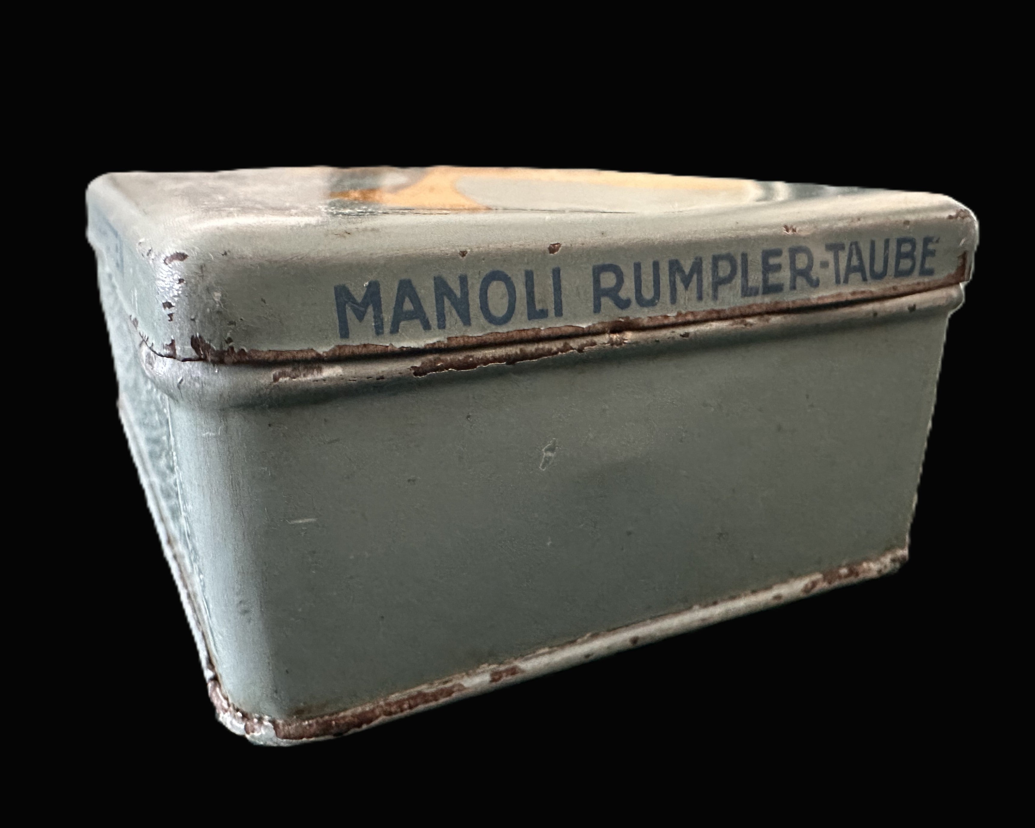 Along the tin’s front and sides, the branding “MANOLI RUMPLER-TAUBE” is crisply stenciled in blue lettering, while the phrase “50 ZIGARETTEN” identifies the original contents. These tins were marketed as premium patriotic packaging, appealing both to smokers and supporters of the German military aviation effort during the war. Today, they represent a rare and highly collectible piece of WWI militaria and tobacco memorabilia.