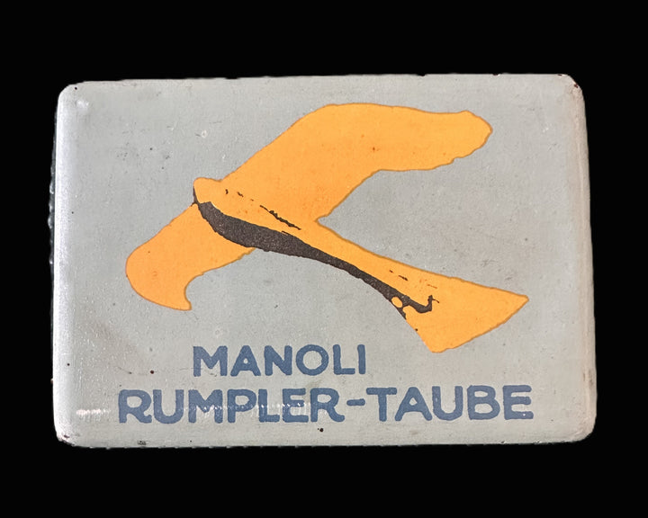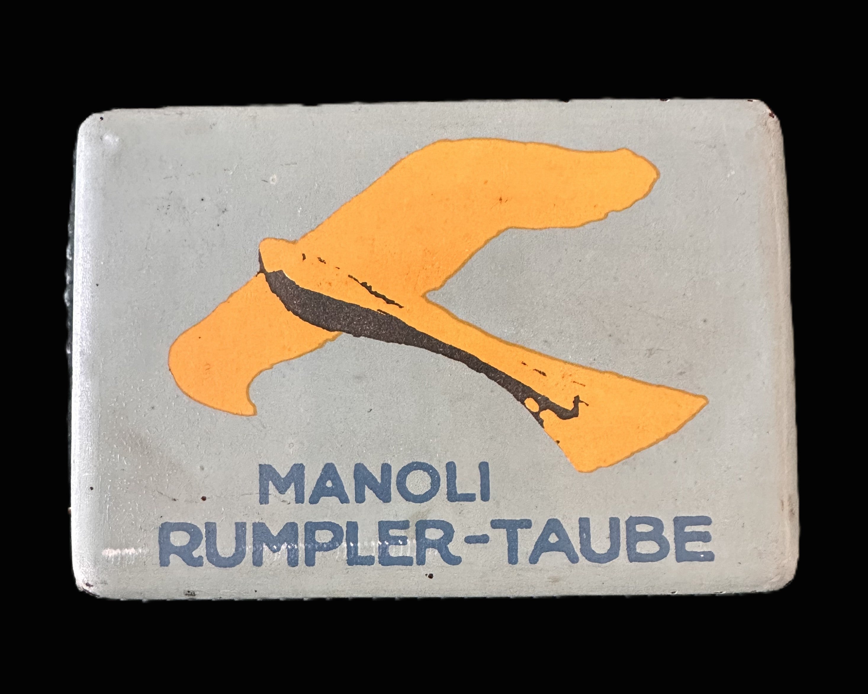This original World War I-era cigarette tin, manufactured for the German tobacco company Manoli, captures the spirit of early aviation through its striking design. The top of the tin features a bold, stylized silhouette of the Rumpler-Taube, a pioneering monoplane used by the Imperial German Army in the early stages of the Great War. The aircraft’s distinctive bird-like shape is rendered in vivid orange and black against a soft gray background, a minimalist yet effective nod to its role in aerial reconnaissance and early dogfighting.