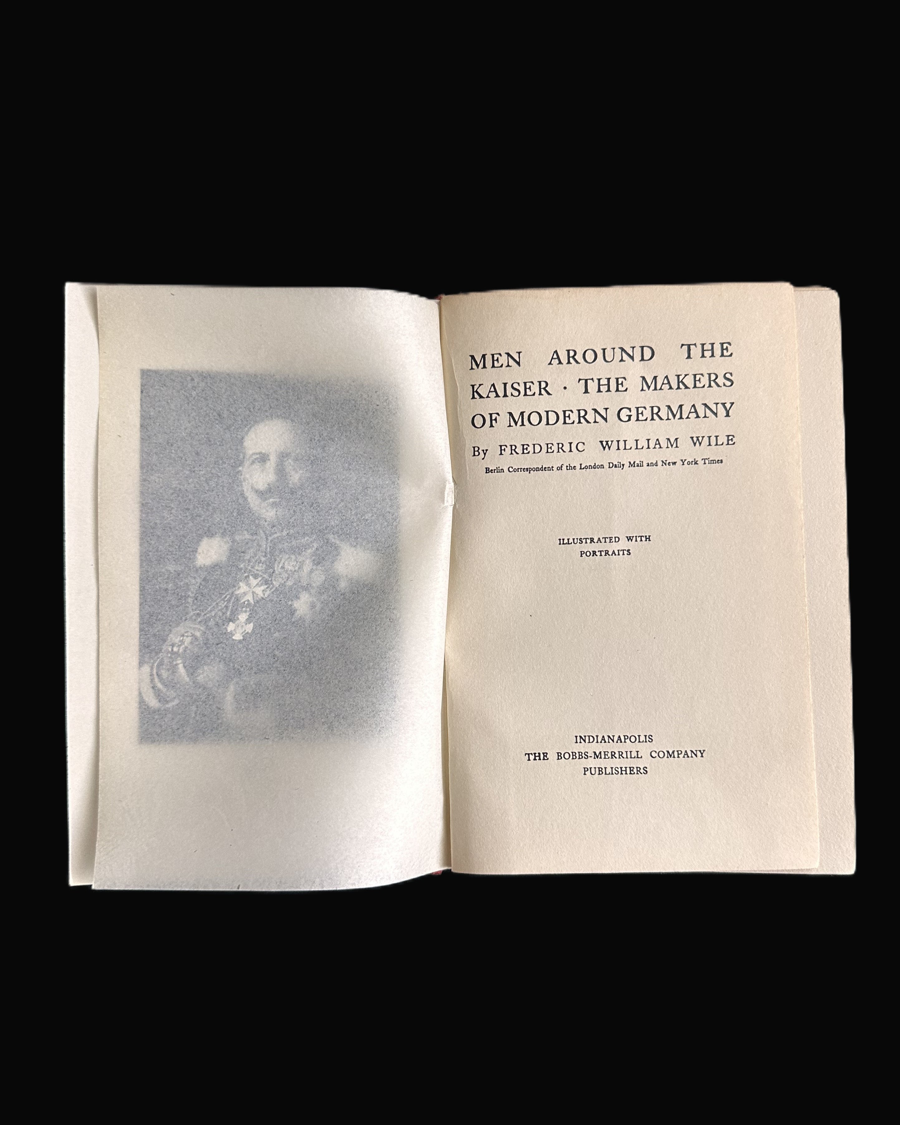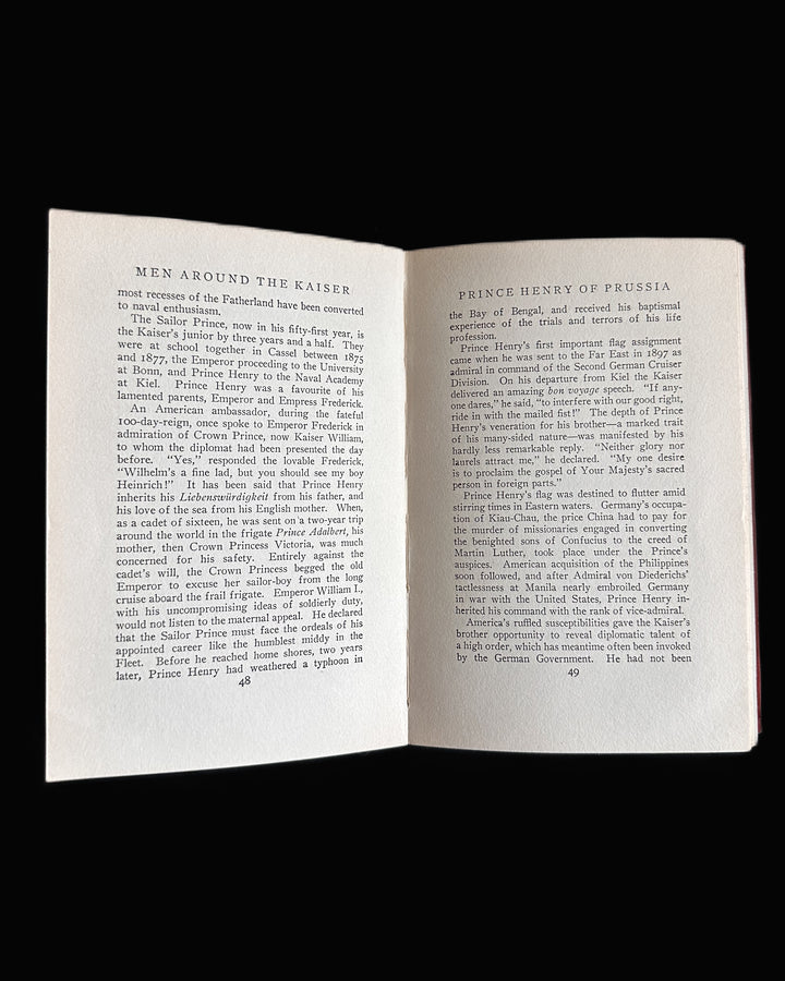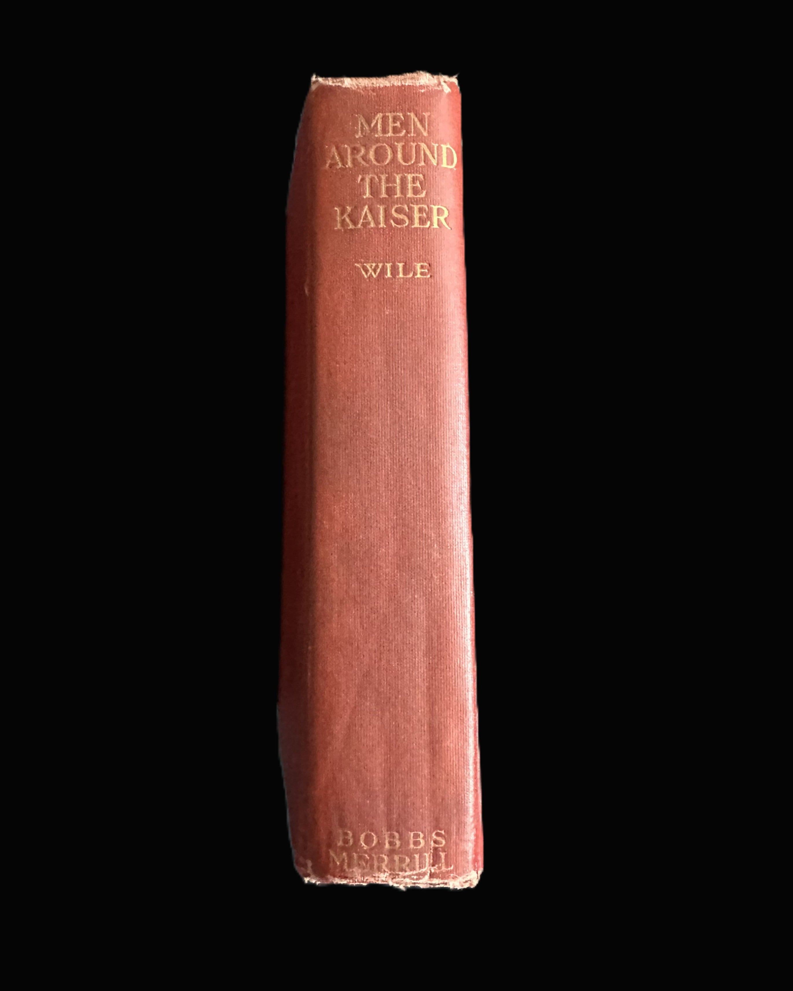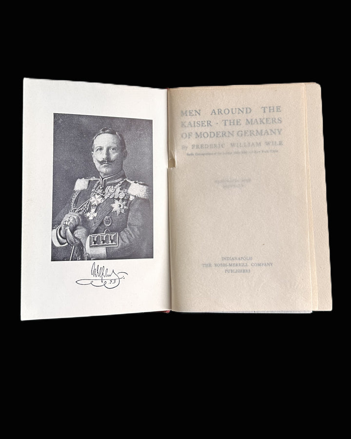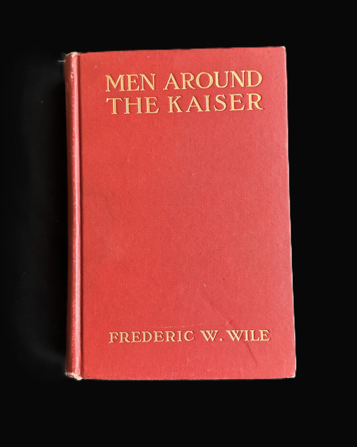 Original early 20th-century hardcover edition of Men Around the Kaiser: The Makers of Modern Germany by Frederic W. Wile, published by The Bobbs-Merrill Company (Indianapolis). Bound in bright red cloth with gilt titles to spine and front cover.