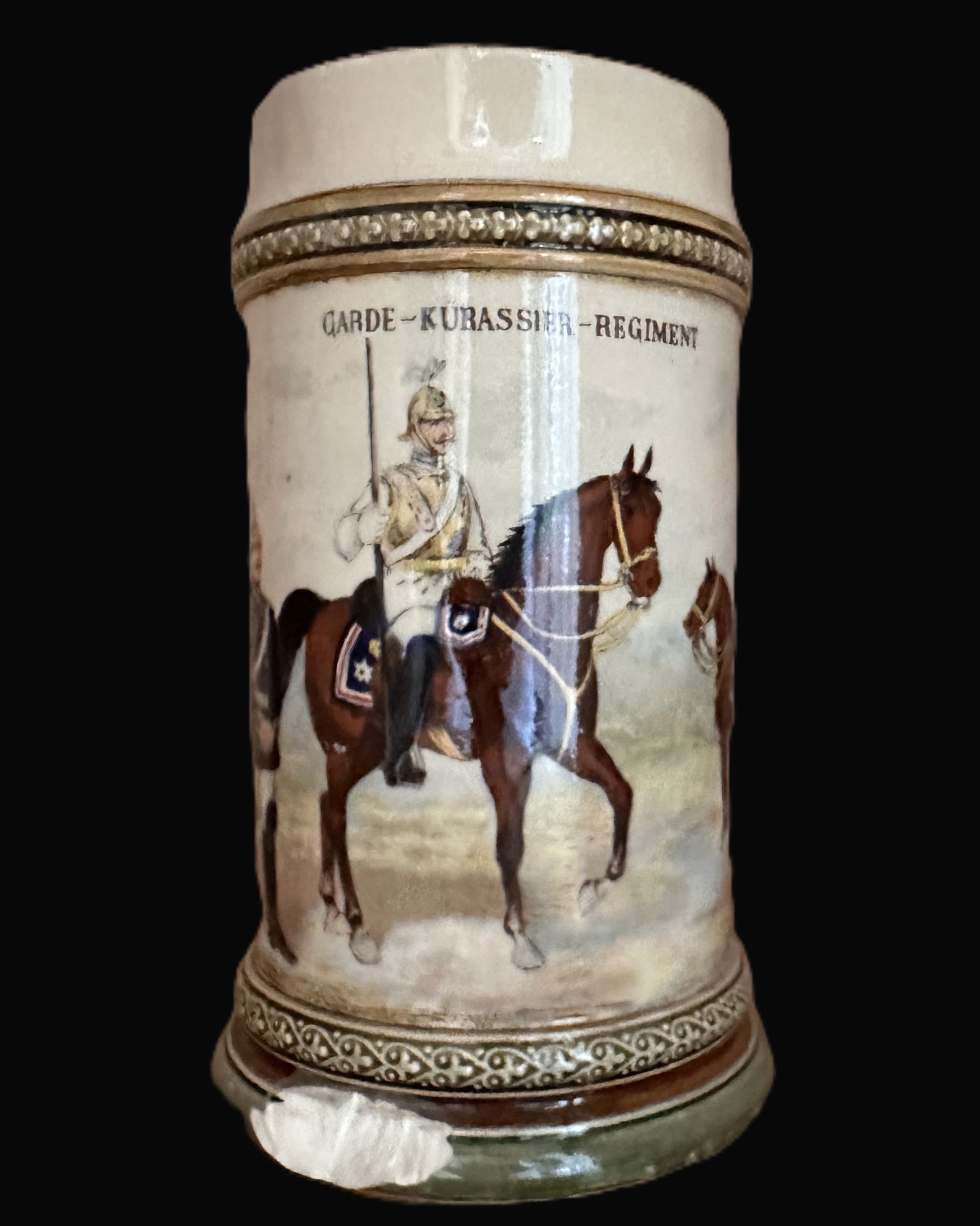 The Garde-Kürassier-Regiment was part of the elite Prussian Guard Cavalry, known for their ceremonial splendor and battlefield discipline. These Mettlach steins were often commissioned or purchased by soldiers or given as presentation pieces. The mold number 2140 is part of a celebrated Mettlach series illustrating military pride and service.