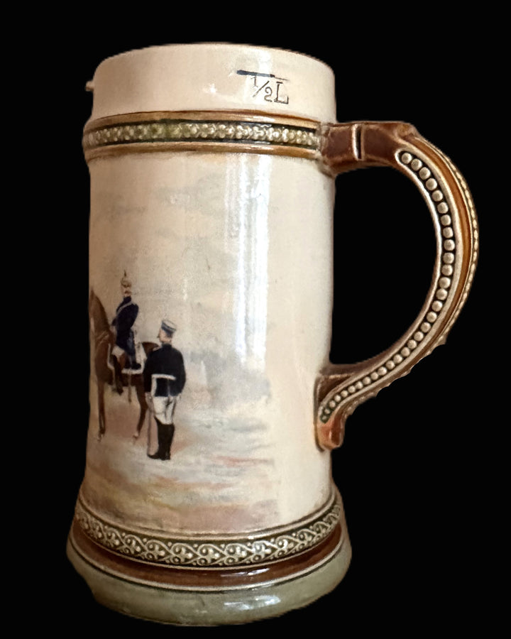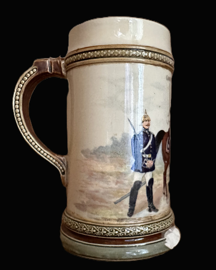 This stein is an excellent example of military-themed Mettlach ware and would appeal to both German militaria collectors and advanced stein enthusiasts, especially those with a focus on the Imperial cavalry. Its open-top format makes it a standout variant in contrast to the more commonly encountered pewter-lidded versions.