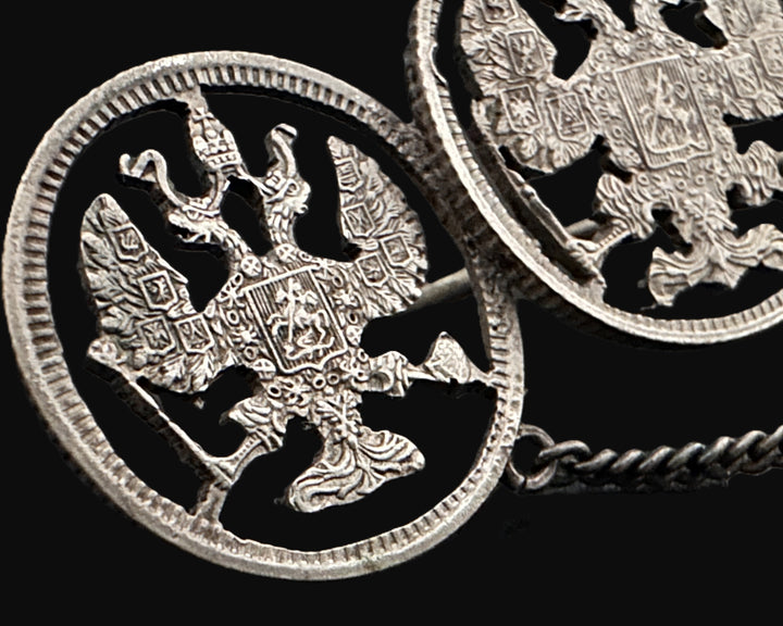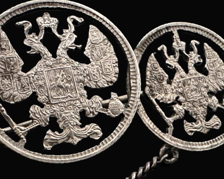 Crafted with exceptional detail, each eagle bears intricate heraldry that hints at its imperial roots. The finely cut filigree work captures the grandeur of 19th or early 20th-century craftsmanship, while the design's layered symbolism invites a deeper investigation.