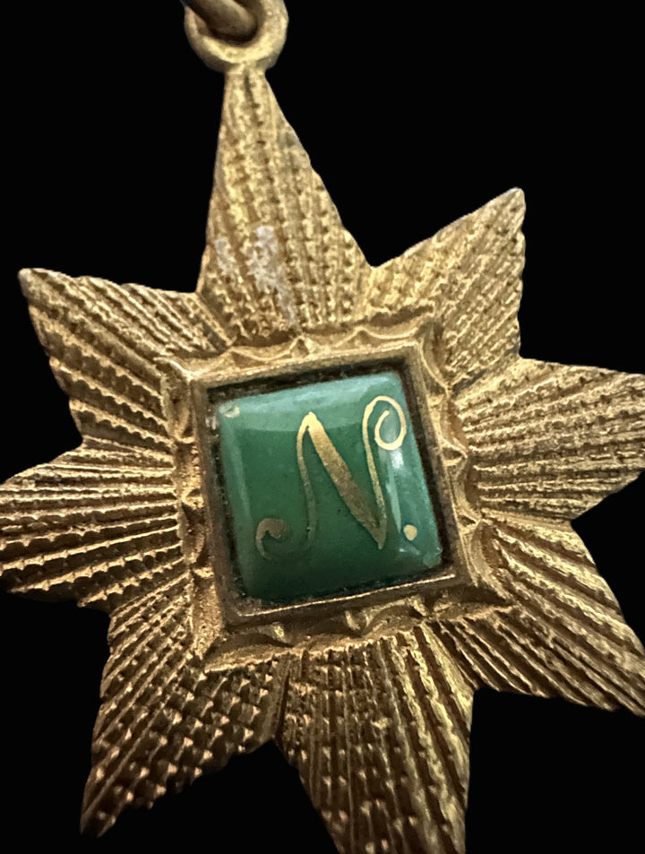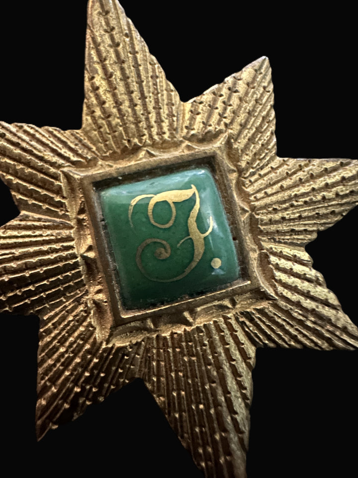 An intriguing little mystery from the 19th century—this finely made gilt-bronze star features a brilliant green enamel tablet at its center, bearing a gilt “N” on one side and an ornate “F” on the reverse. At just an inch across, its craftsmanship is remarkable, suggesting that it once adorned a uniform or watch chain as a miniature badge of honor or loyalty. The meaning behind the monograms, however, remains uncertain. Could the “N” stand for Napoleon, linking it to the many privately commissioned commemoratives that flourished during the French Imperial revival? Or might it represent a German noble initial, given the distinctly Continental style of its eight-pointed rays and gilt finish—features seen in 19th-century house orders from small German principalities?