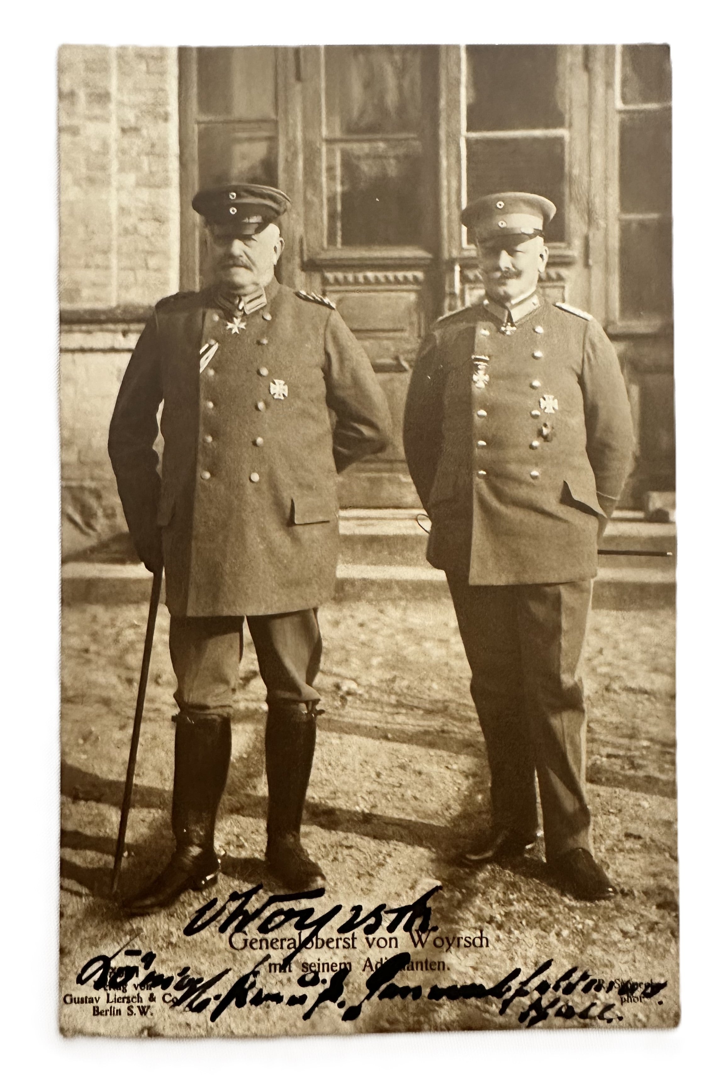 This autographed postcard captures Generalfeldmarschall von Woyrsch in full military regalia. His stern yet composed demeanor reflects his authoritative presence and strategic mind. The postcard, never mailed, is preserved in excellent condition, showcasing von Woyrsch's bold signature in black ink.