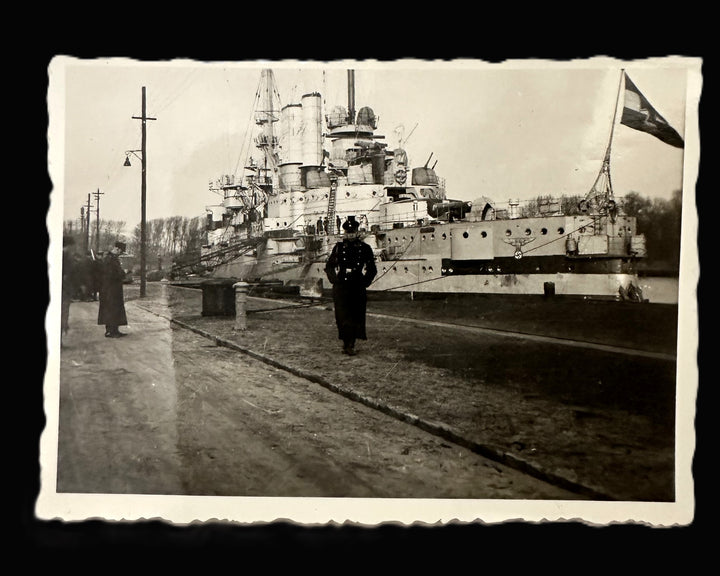 - Historical Context: Likely taken during the early 20th century, this photograph provides insight into the daily operations and presence of German naval power before or during World War I. The officers in uniform add to the image's authenticity and appeal for collectors of military history.