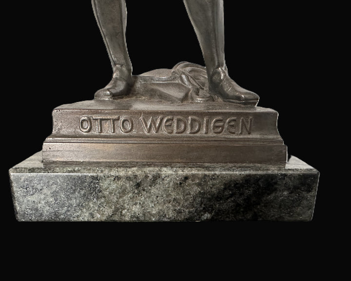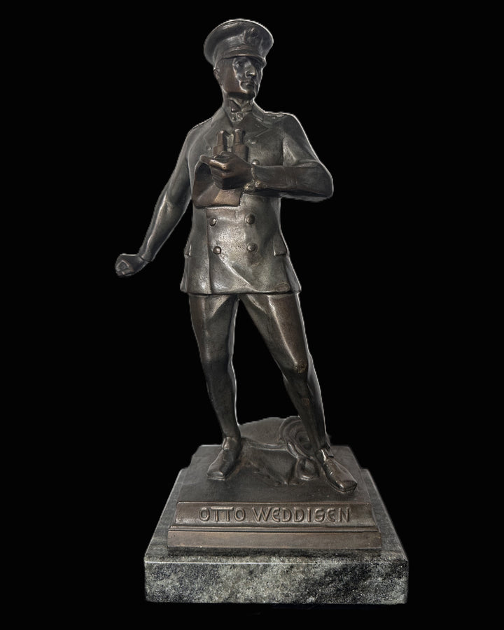 This is an exceptional bronze statue of Otto Weddigen, a renowned German U-boat commander during World War I, whose daring exploits with U-9 cemented his place in naval history. The statue stands proudly atop a solid marble base, with “OTTO WEDDIGEN” prominently engraved on the front of the pedestal, emphasizing its commemorative nature.