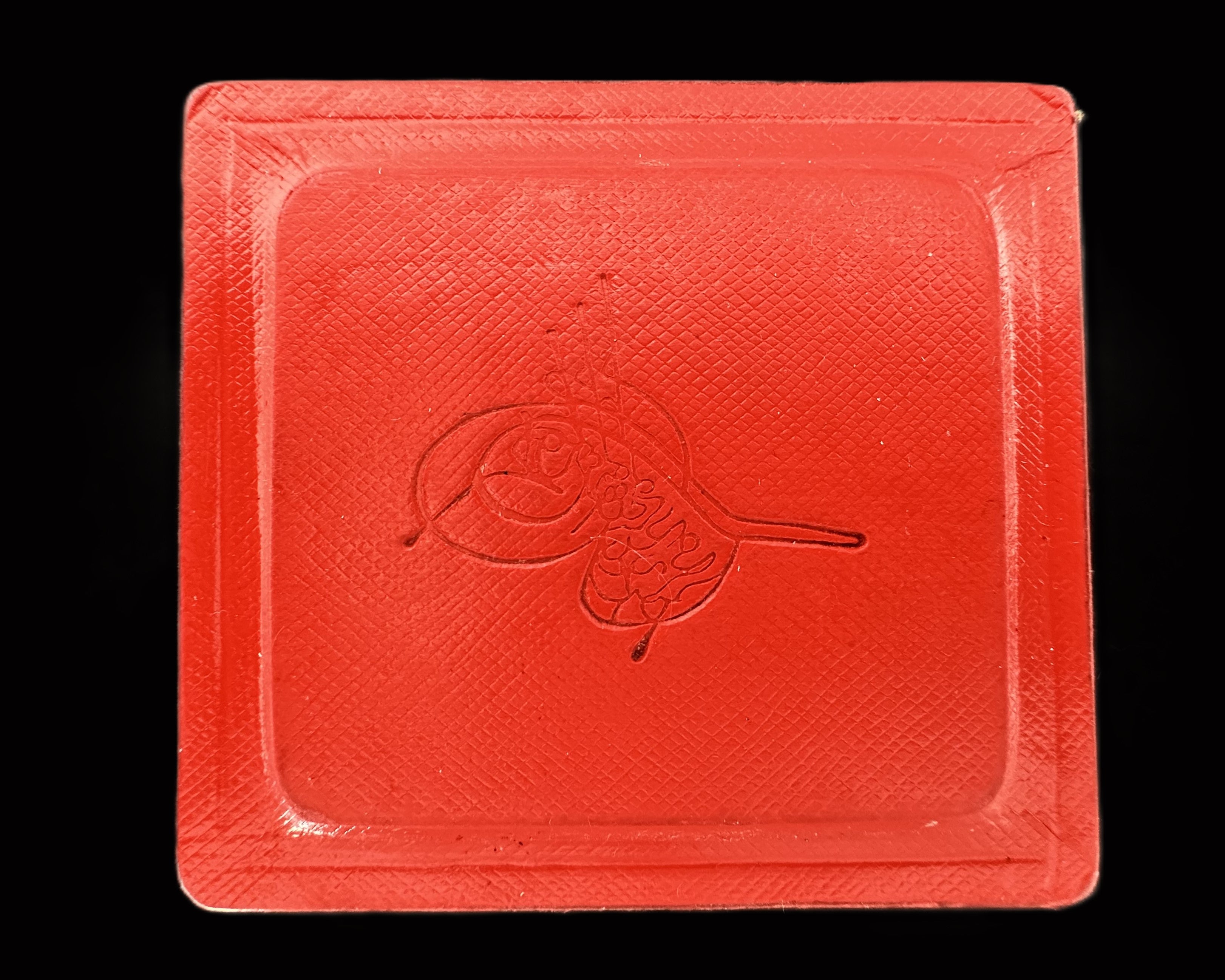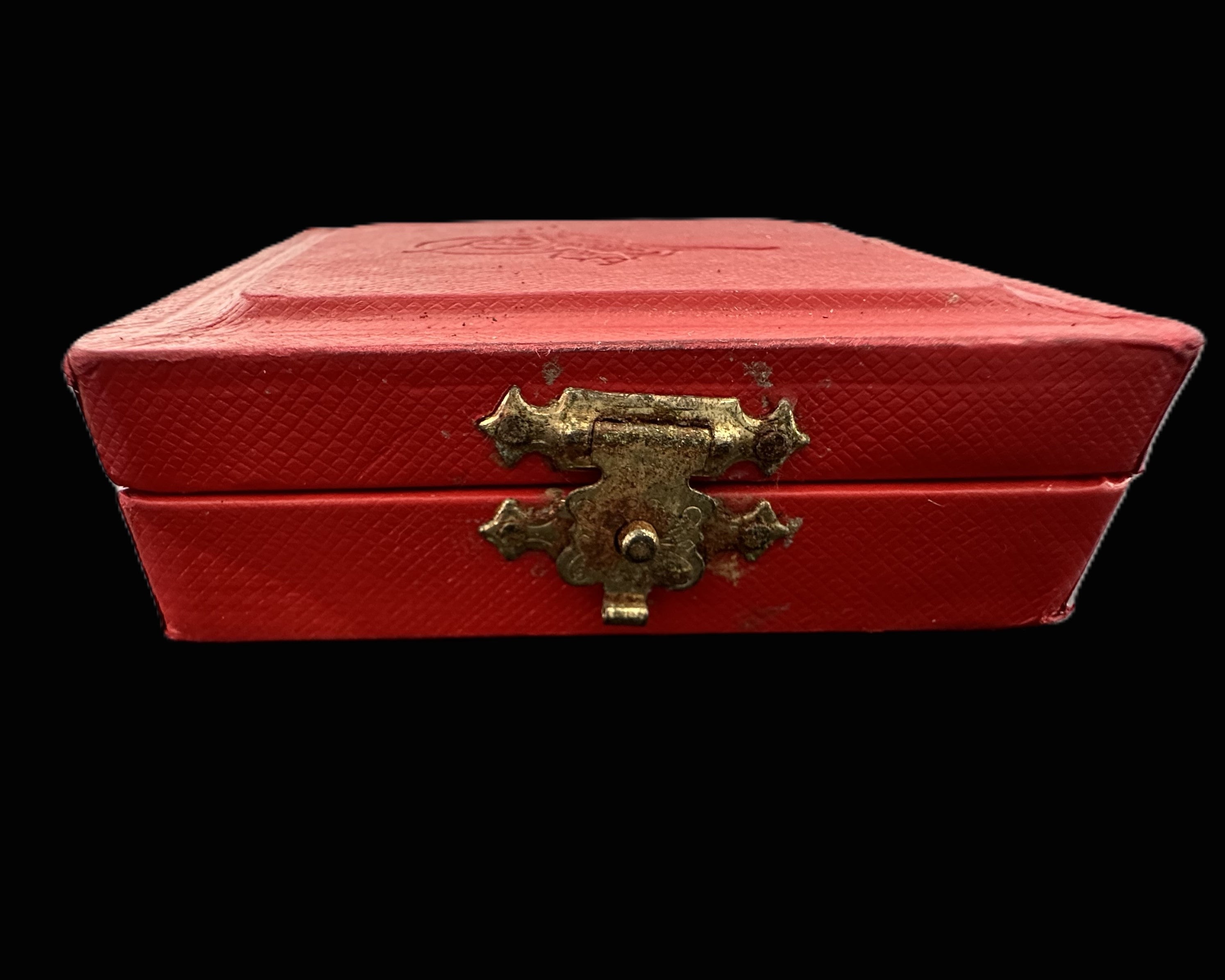 Exterior: The original red presentation case bears the Ottoman crescent and star insignia. The hinge and clasp are functional, with some wear on the edges, reflecting its age.