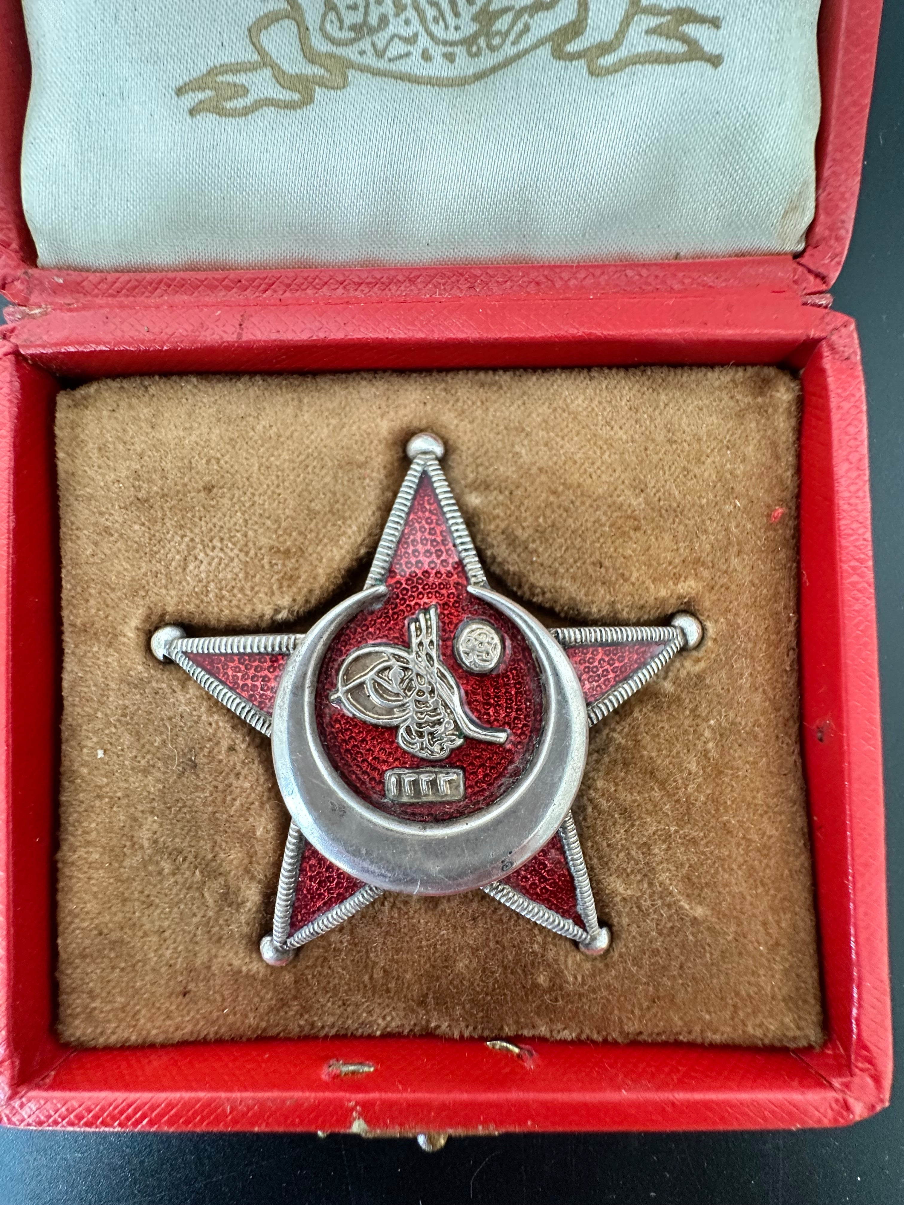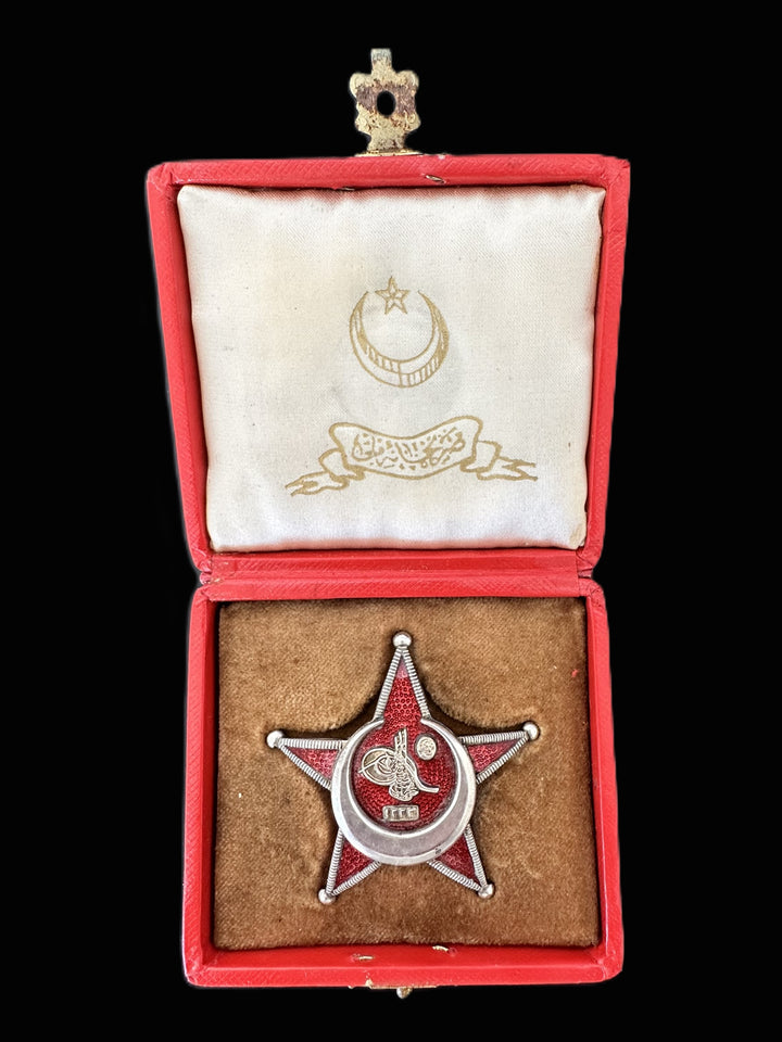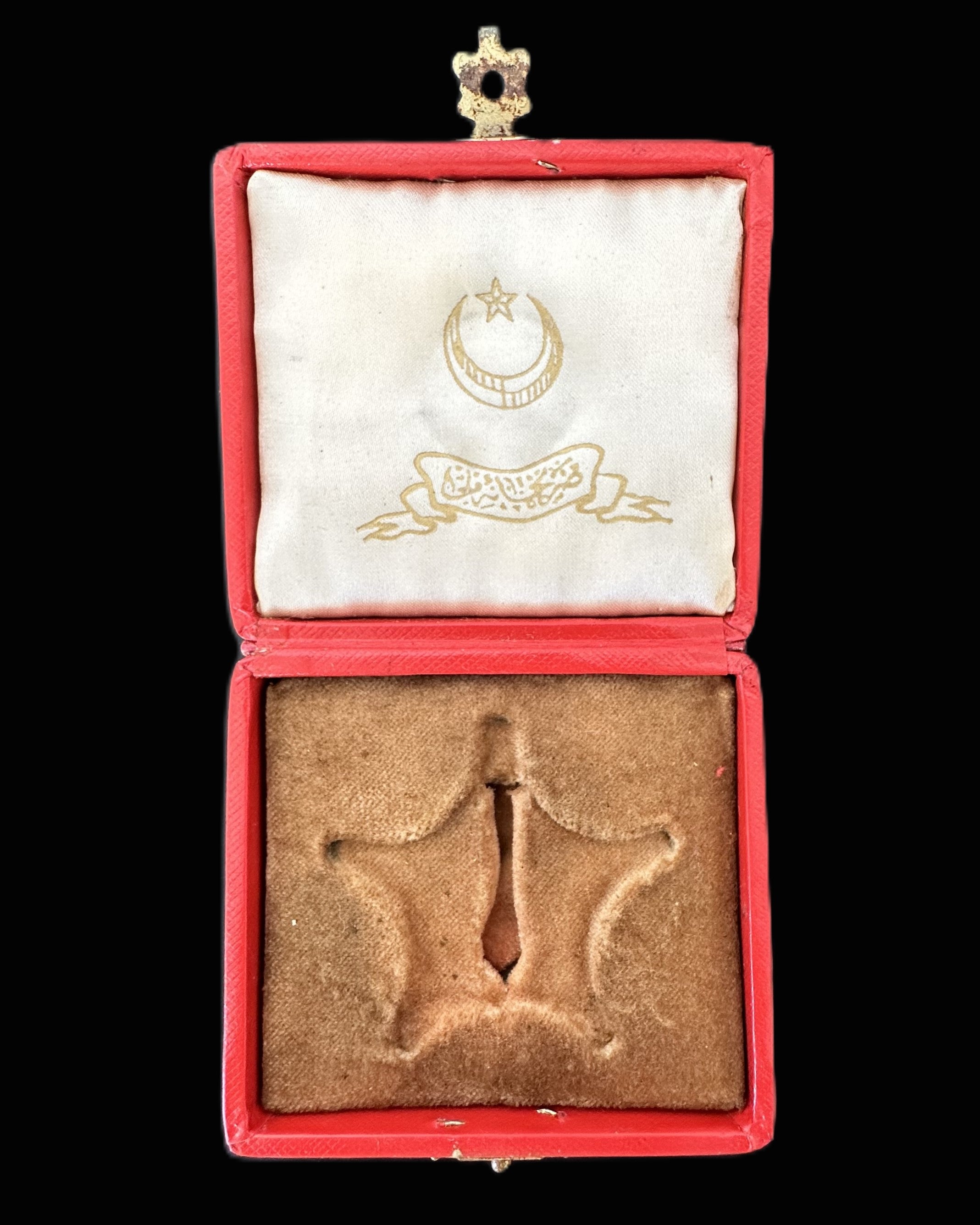 Interior: Lined with satin-like fabric featuring the Ottoman crescent and star insignia in gold on the lid, and a fitted felt insert designed to securely house the badge.