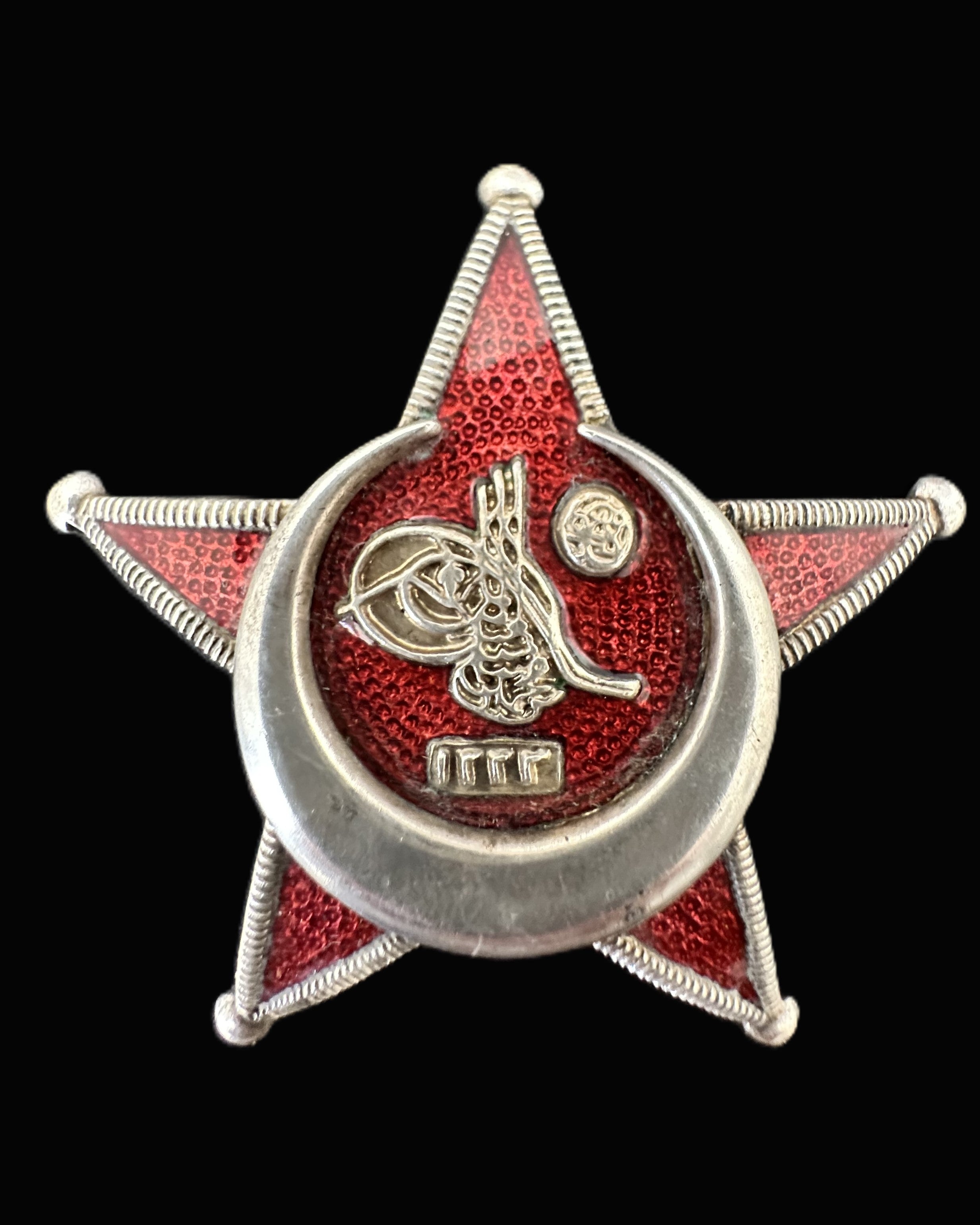 Design: The badge features a five-pointed star with red enamel arms, bordered by silver beading. At the center is a crescent and star motif, emblematic of Ottoman symbolism, with the tughra (signature) of Sultan Mehmed V. The reverse side includes a pin-back fastening mechanism, fully intact and operational.