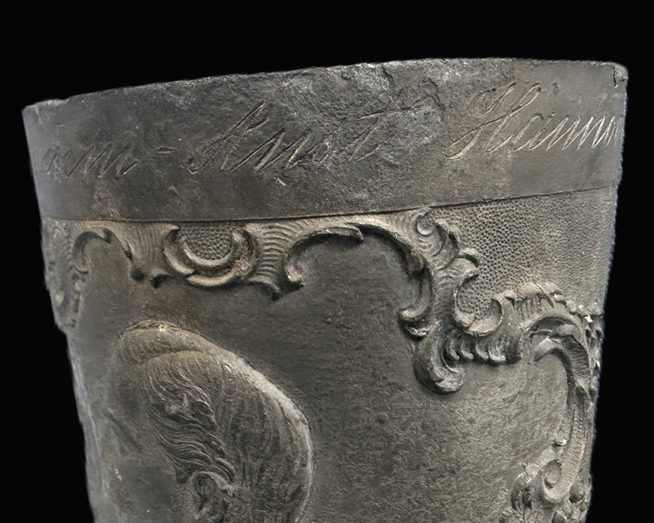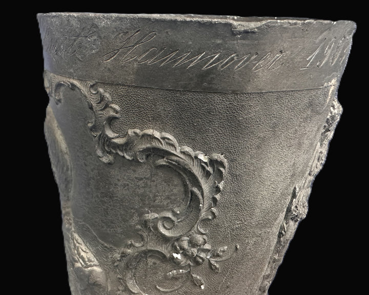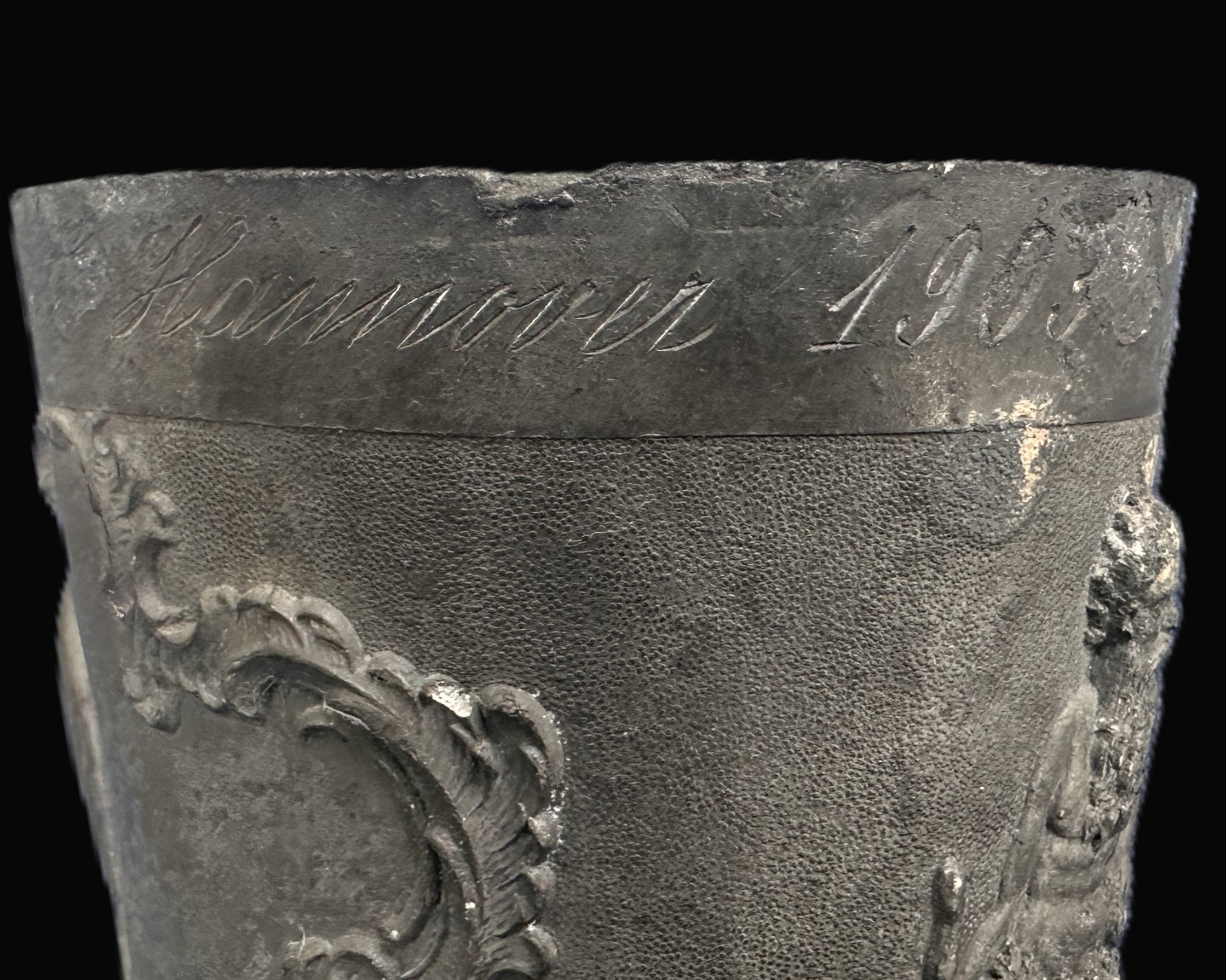 This impressive Imperial German pewter drinking cup dates to 1903 and commemorates a military event or service in Hanover involving the Garnison-Schützen Korps (Garrison Rifle Corps). The cup's detailed and raised decoration showcases both exceptional craftsmanship and strong national symbolism tied to the Kingdom of Württemberg within the German Empire.