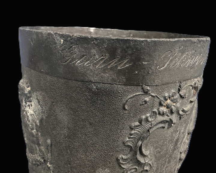 The cup shows signs of its age, including minor oxidation and wear, with a few edge chips and dents around the rim and base, all consistent with a pewter item over 120 years old. The engraved script remains legible and adds important provenance.