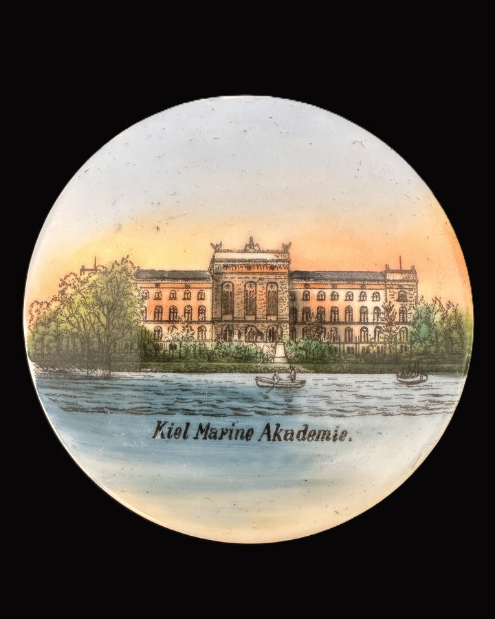 The Kiel Marine Akademie was a prominent naval institution during Imperial Germany, playing a significant role in training officers for the Kaiserliche Marine. The academy symbolized Germany's growing naval power and commitment to maritime excellence during the late 19th and early 20th centuries. Items such as this trinket box would often serve as souvenirs, showcasing national pride and the era's artistic achievements.