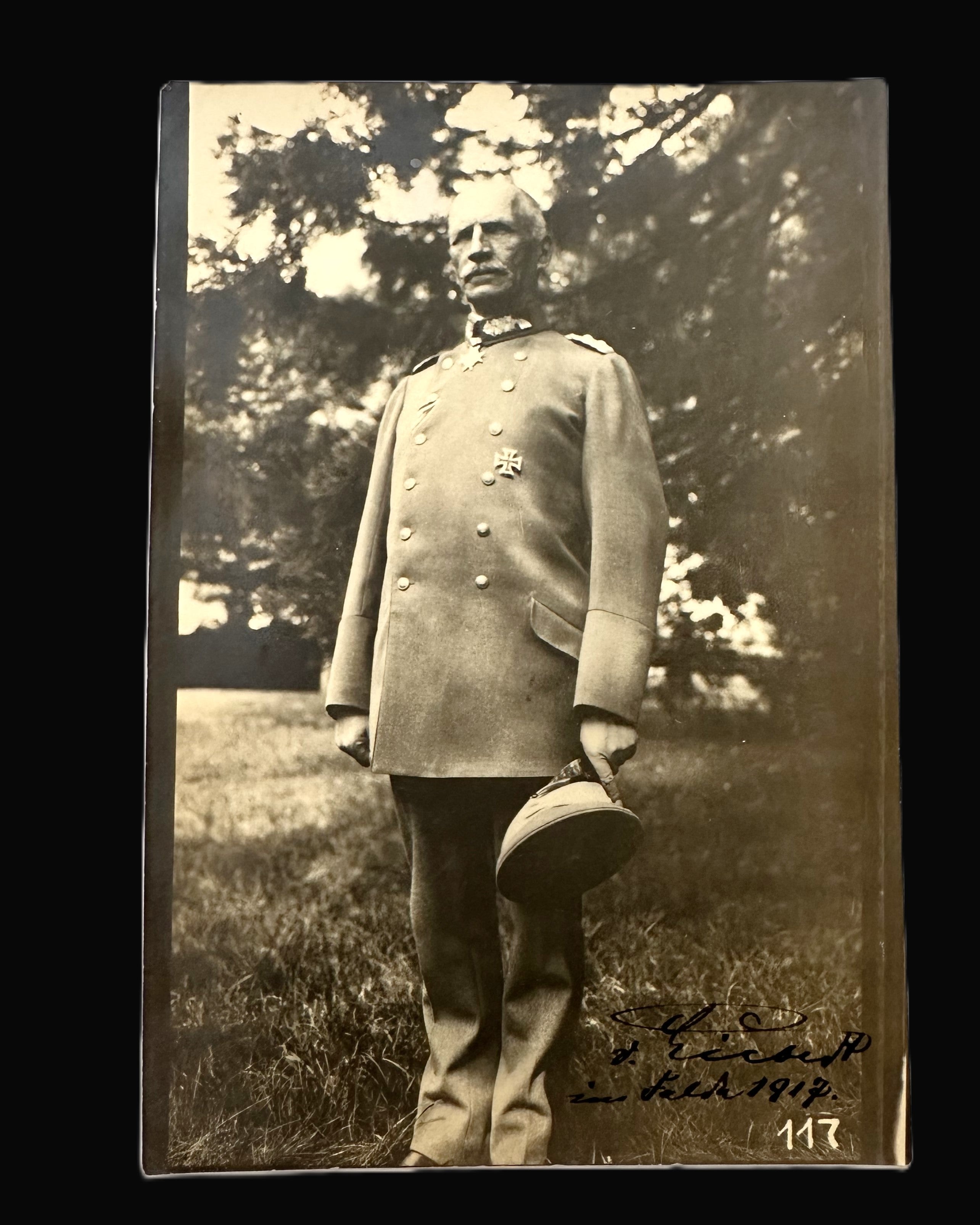 This is an original black-and-white photograph of a German officer, dated February 1917, as indicated by the handwritten inscription on the lower front corner. The officer is depicted in full military uniform, complete with decorations, standing in an outdoor setting, holding his visor cap. The photograph exudes a sense of formality and dignity, capturing the essence of German military traditions during the First World War.