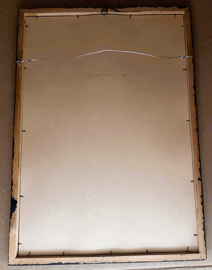 Very good antique condition. The print shows minor foxing along the edges but remains vibrant. The frame shows scattered chips and edge wear consistent with age. The paper is securely held with period-appropriate tacking on the back.