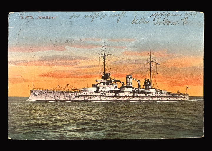 This historical postcard features a striking colorized image of the SMS Westfalen, one of the first German dreadnought battleships, sailing under a vivid sunset. The SMS Westfalen was part of the Nassau-class battleships, a significant step in naval power for the Imperial German Navy.