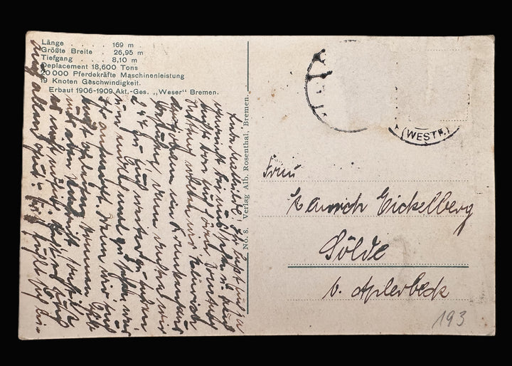 The reverse side contains handwritten correspondence in German, showcasing the card's authenticity as a period piece. Additional printed text provides detailed specifications of the Westfalen: