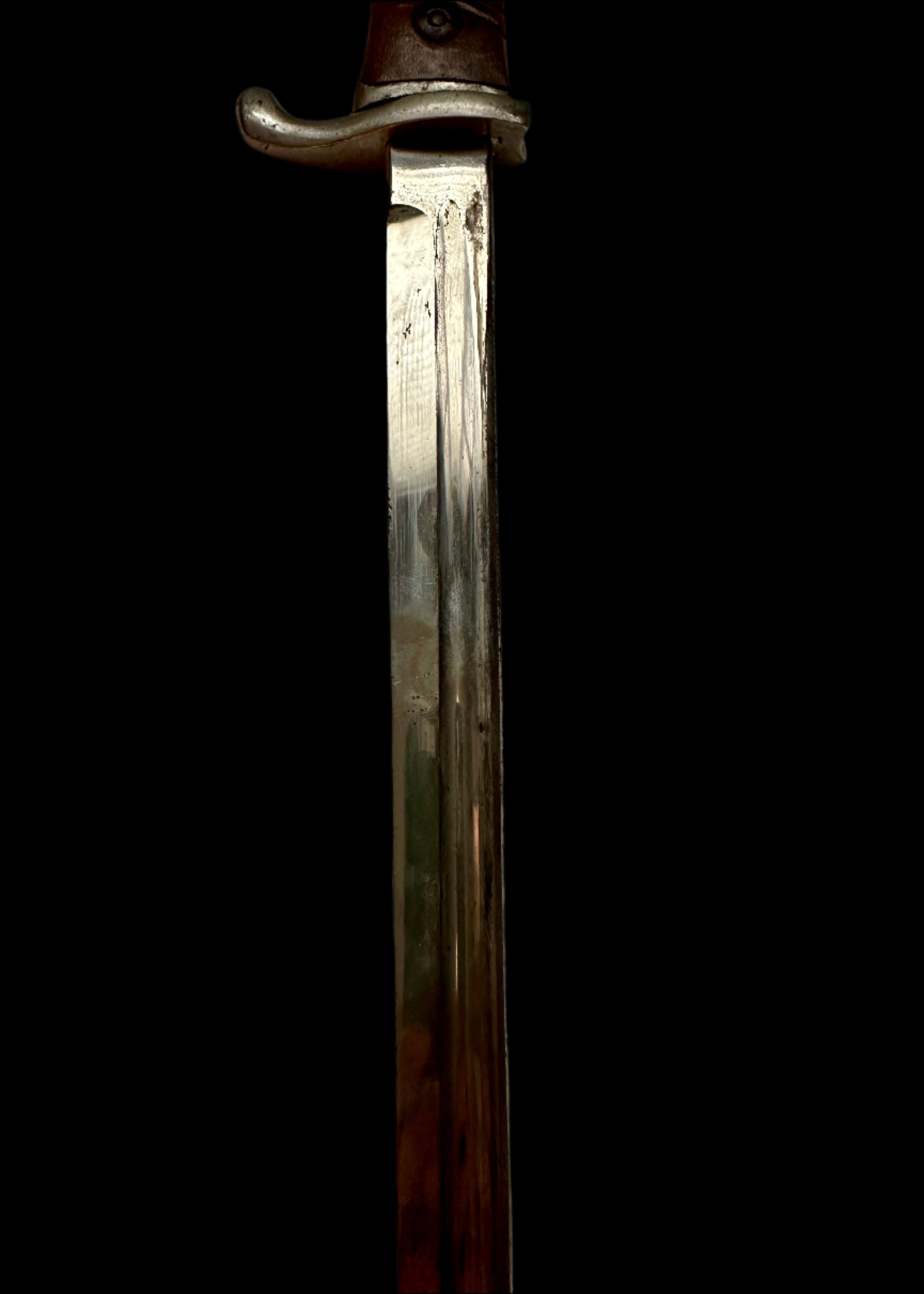 The hilt features wood grip panels with diagonally grooved relief and steel pommel and guard. The steel surfaces show honest age patina and light oxidation, but no active corrosion. The bayonet's press-stud mechanism appears complete, and the mortise slot is intact.