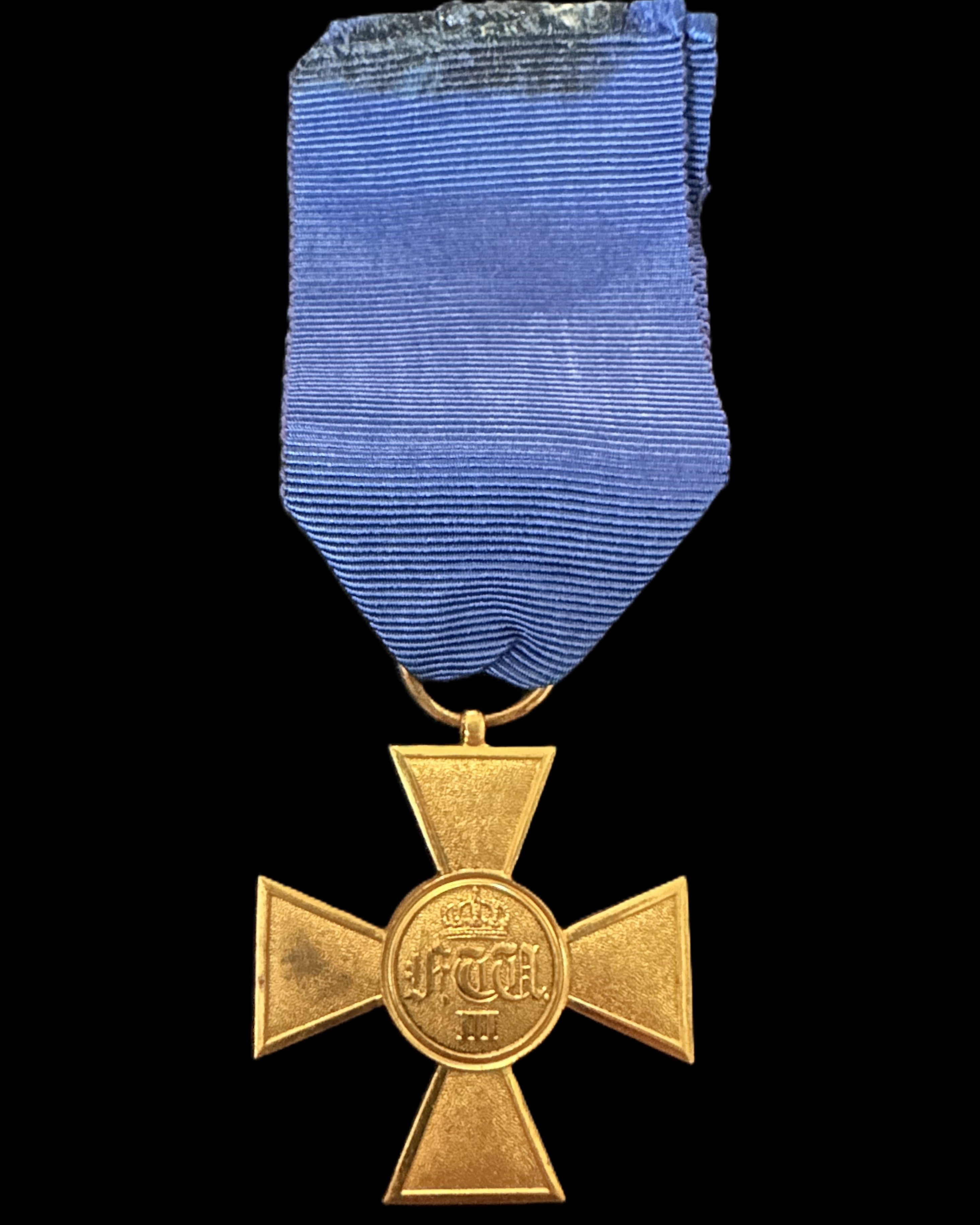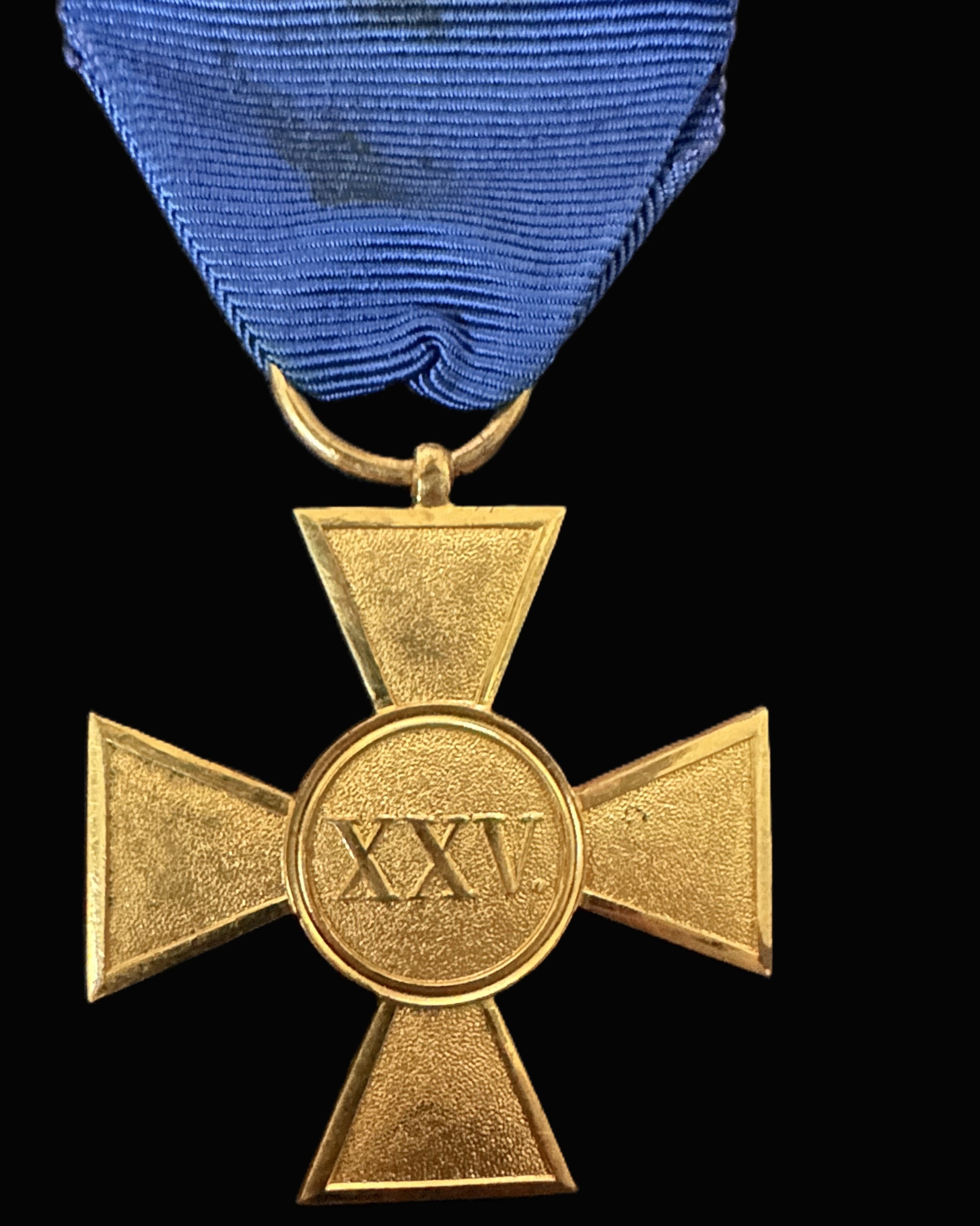 The decoration is a finely struck gilt cross, with the obverse showing the crowned royal cypher “FW III” (Friedrich Wilhelm III, King of Prussia, r. 1797–1840). The reverse is inscribed with “XXV”, denoting 25 years of loyal service.