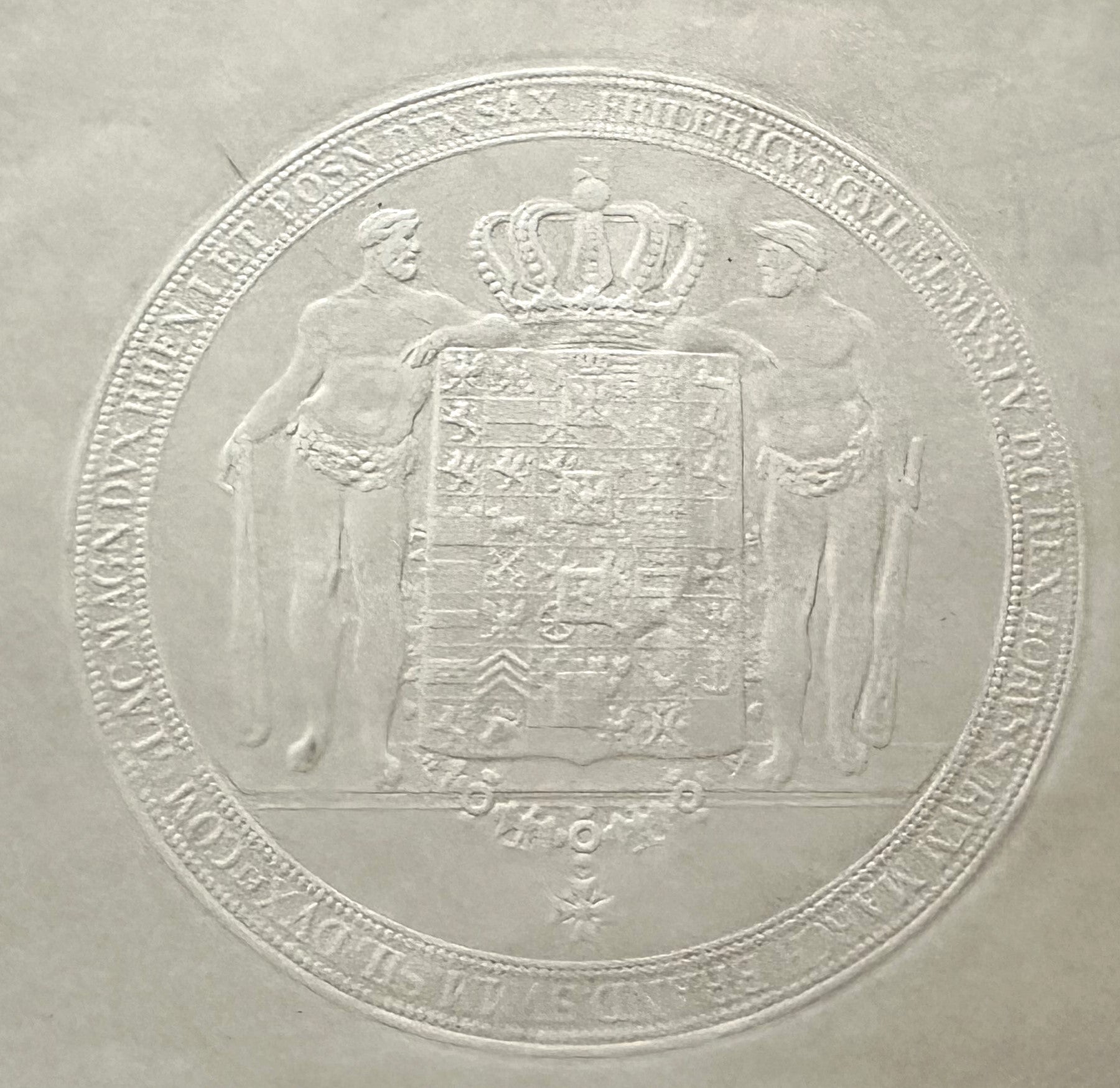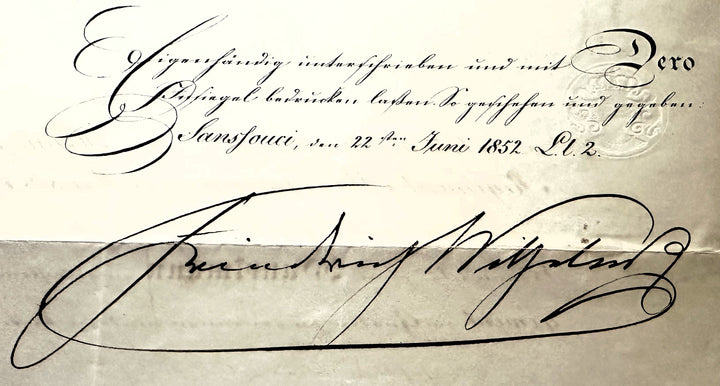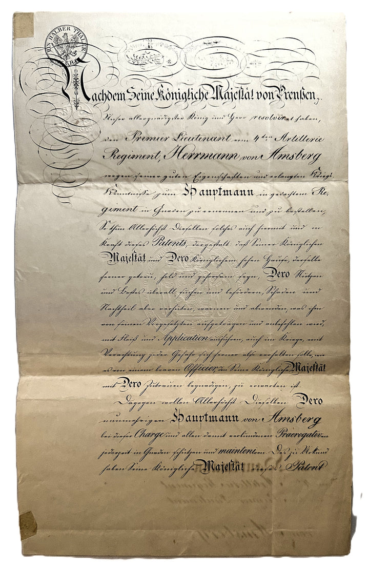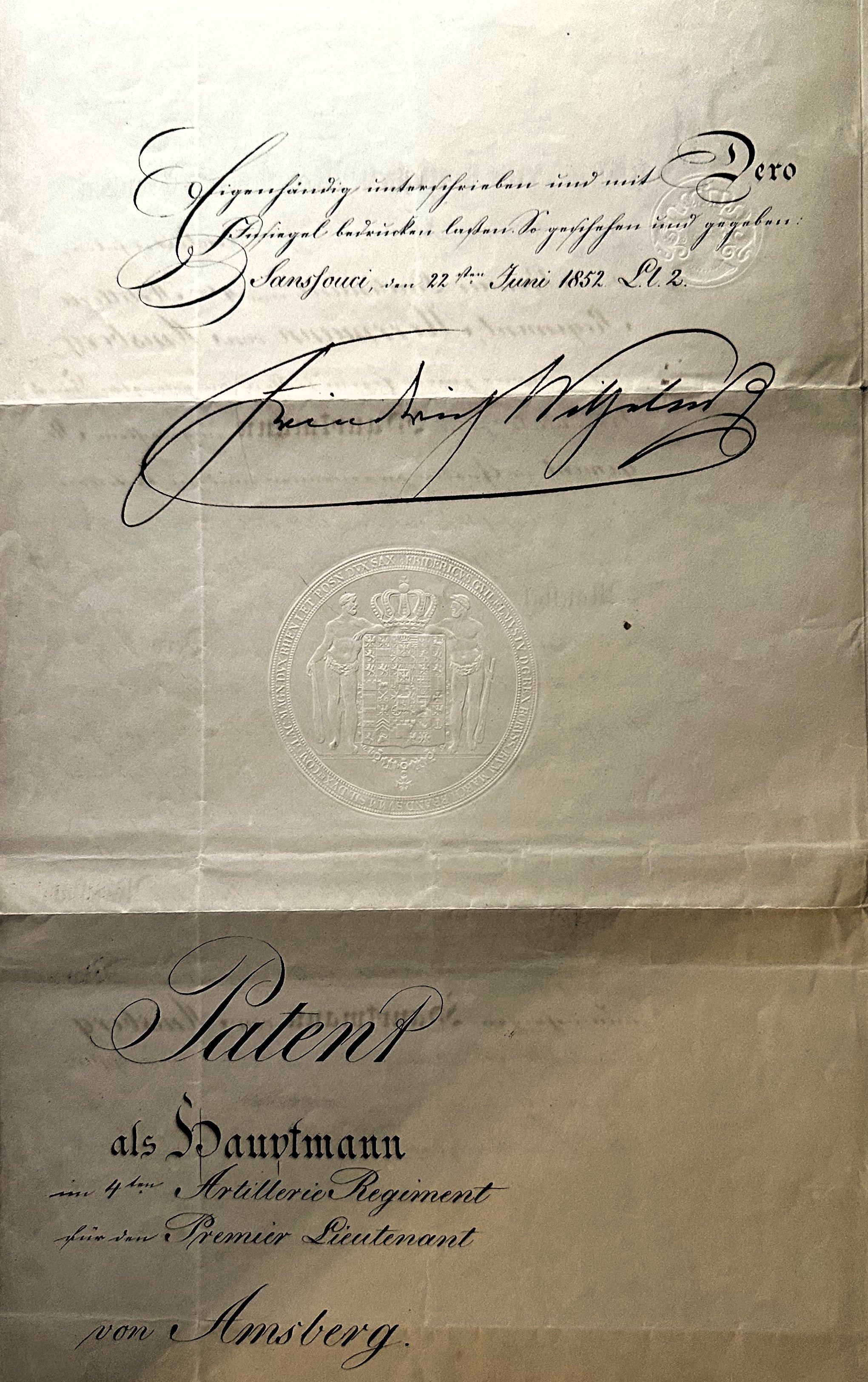 This document commemorates the promotion of Hermann von Amsberg, who served in Feldartillerie-Regiment Prinzregent Luitpold von Bayern Nr 4. He was promoted from Premier Lieutenant (later known as oberleutnant) to Hauptmann on 22 June 1852. The document was signed at Sanssouci, the Potsdam castle modeled on the French castle at Versailles. The latter was built by Frederick the Great, a great admirer of French culture. The document is boldly signed by König Friedrich Wilhelm IV (1796-1861), with the House of Hohenzollern’s embossed royal seal directly below his large signature.