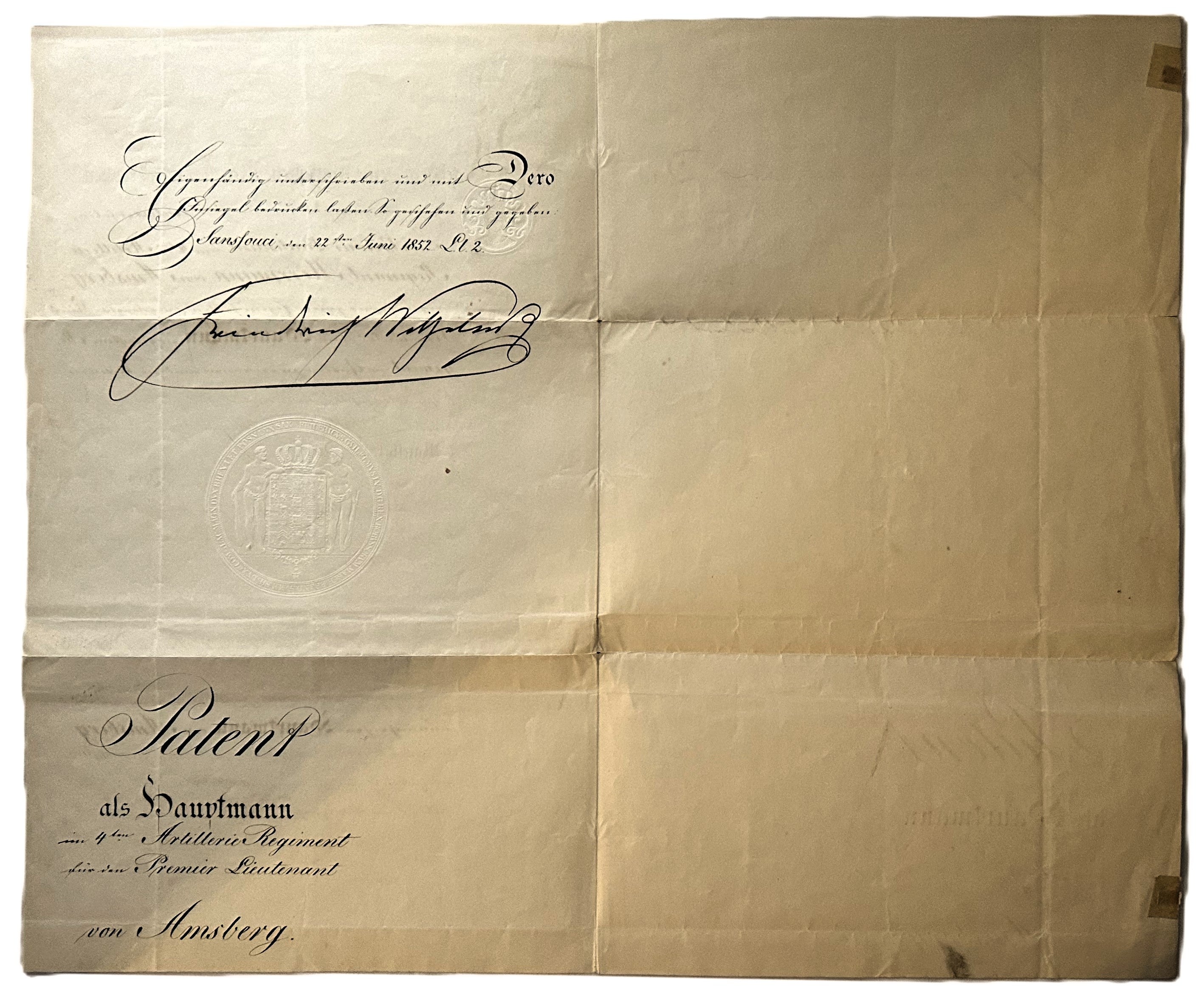 Prussia – Patent – Hauptman Promotion – Signed by Prussia’s König Friedrich Wilhelm IV