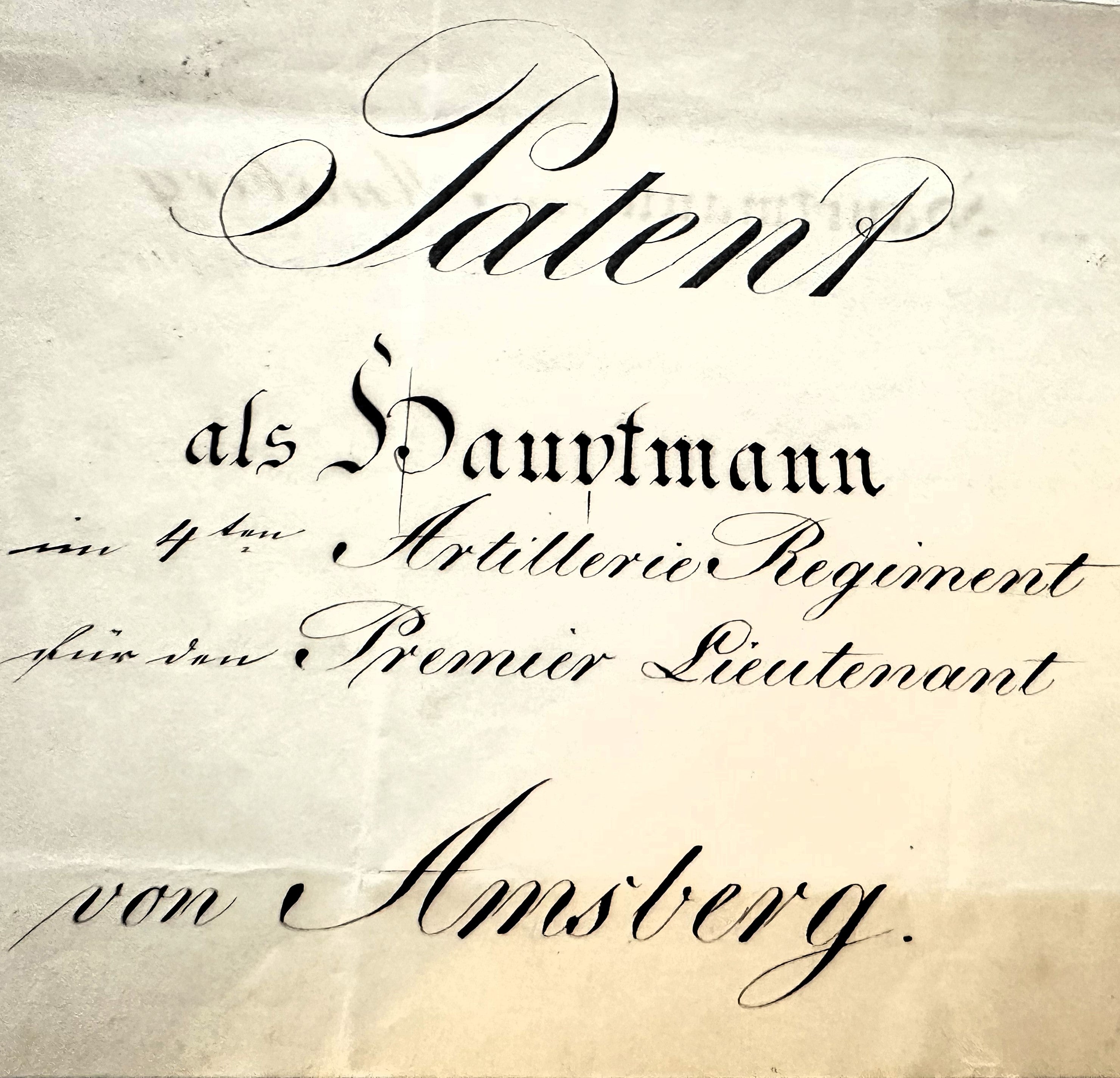 "After His Royal Majesty of Prussia, My Faithful Premier Lieutenant of the 4th Artillery Regiment, Mr. Hermann von Amsberg,