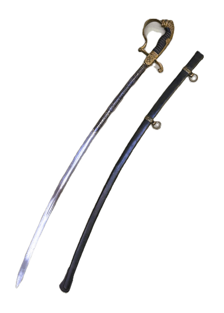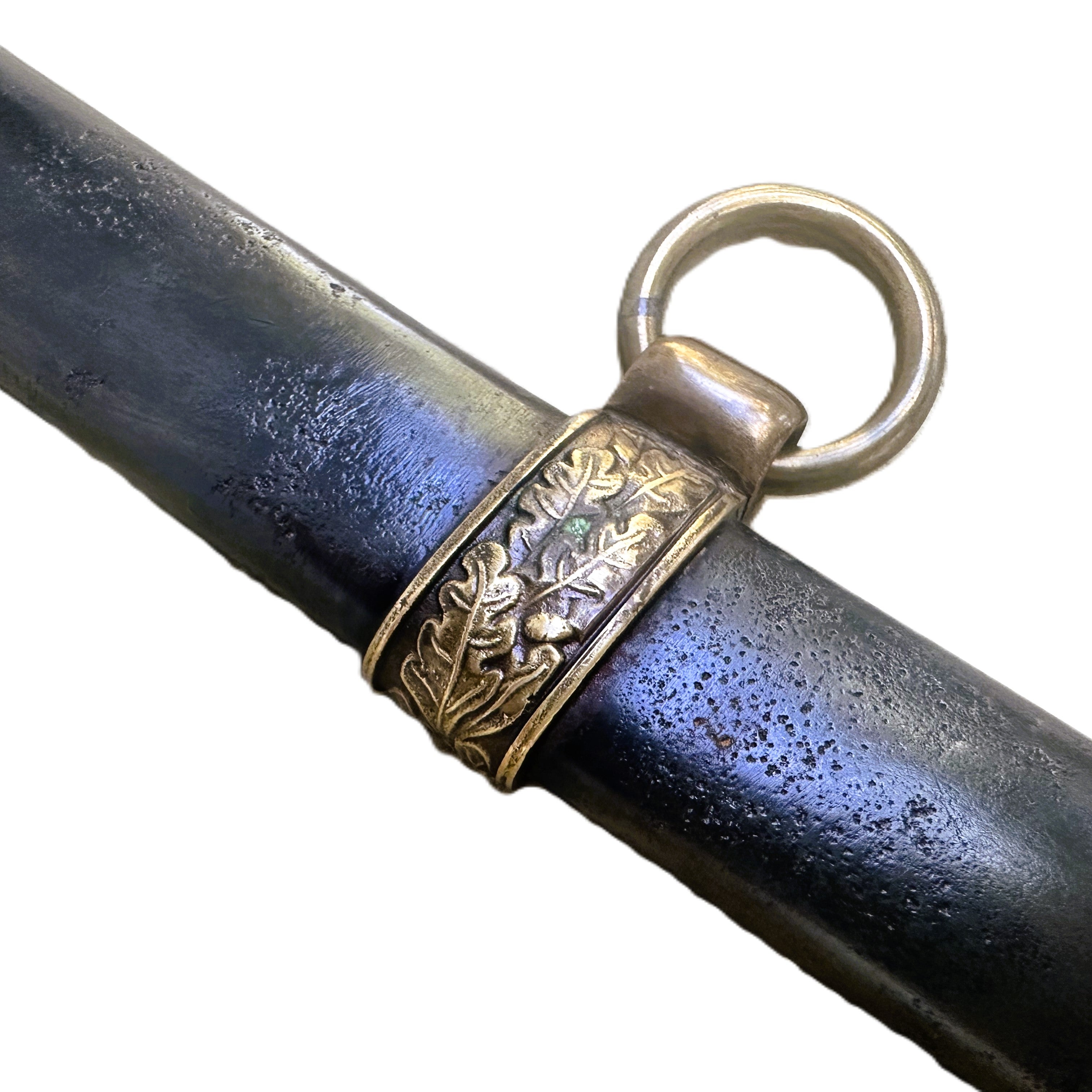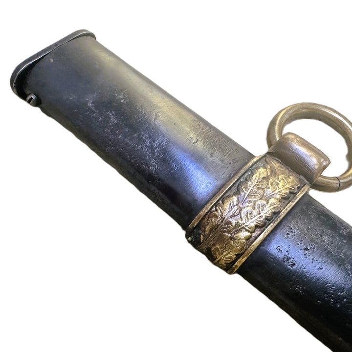 The scabbard is constructed of black leather, paired with two rings for attachment. The decorative gilt accents near the rings complement the gilding on the pommel and hilt, creating a cohesive and elegant presentation.