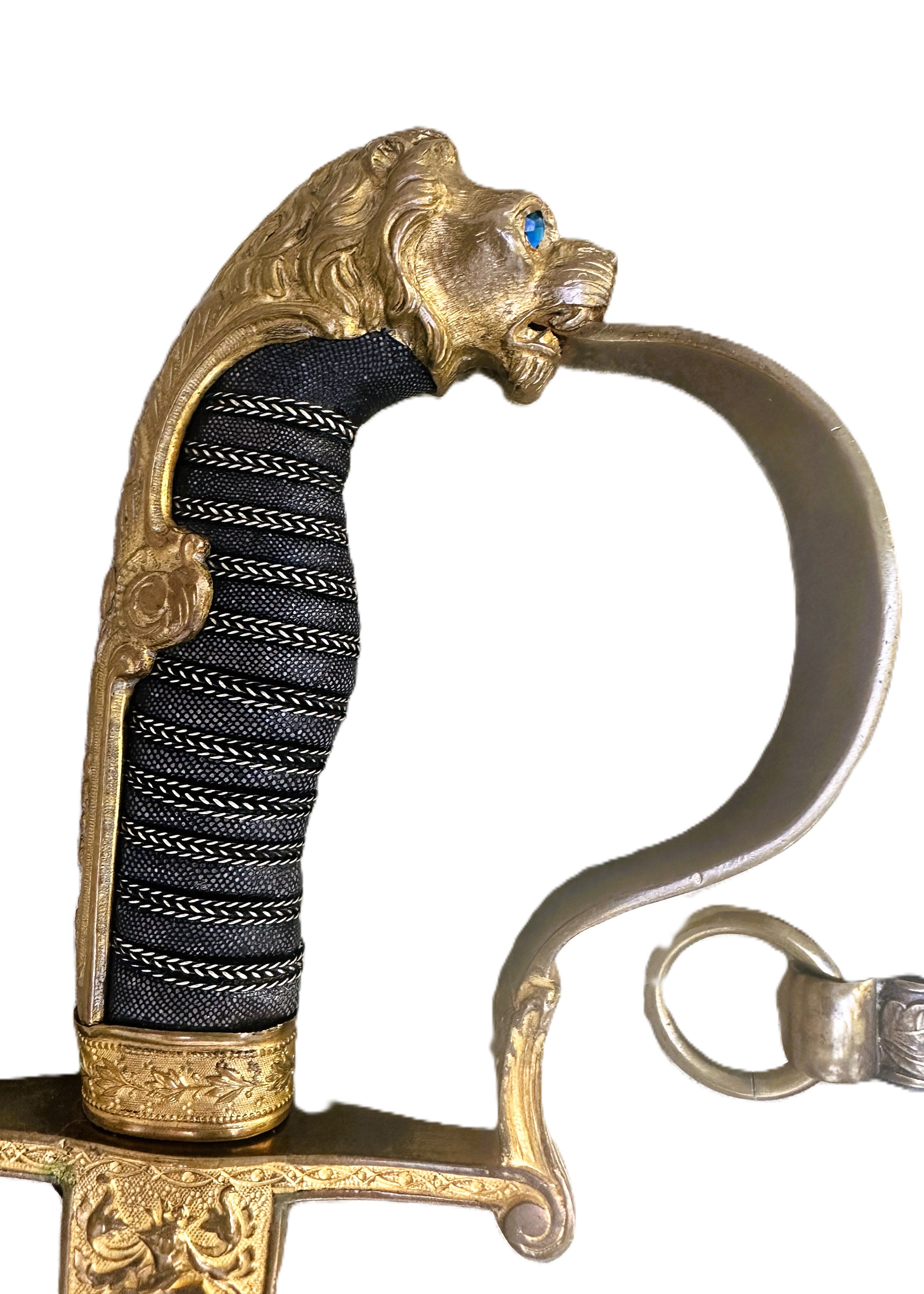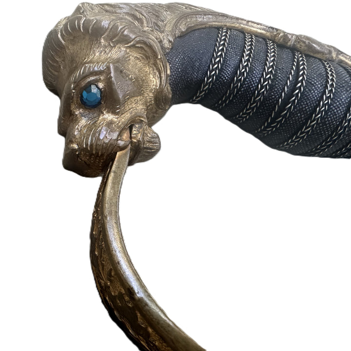 The lion's head pommel is the most striking feature, showcasing excellent gilding that has been meticulously preserved. The lion’s eyes, crafted in a rare blue, add a unique and captivating element to the sword, distinguishing it from the more common red or green-eyed variants. The handle is covered in sharkskin and triple wire-wrapped, providing a firm and luxurious grip, typical of high-quality ceremonial weapons.