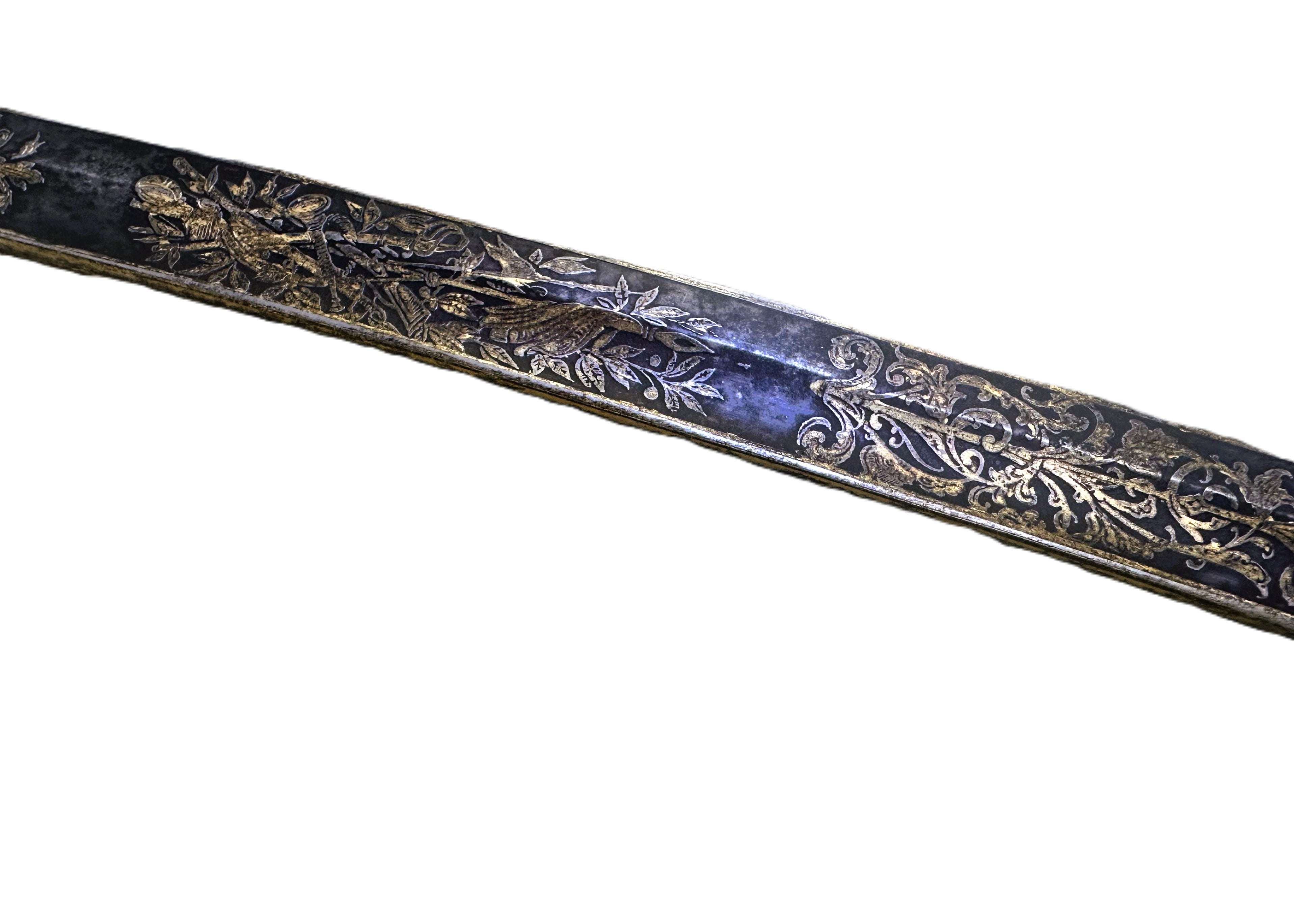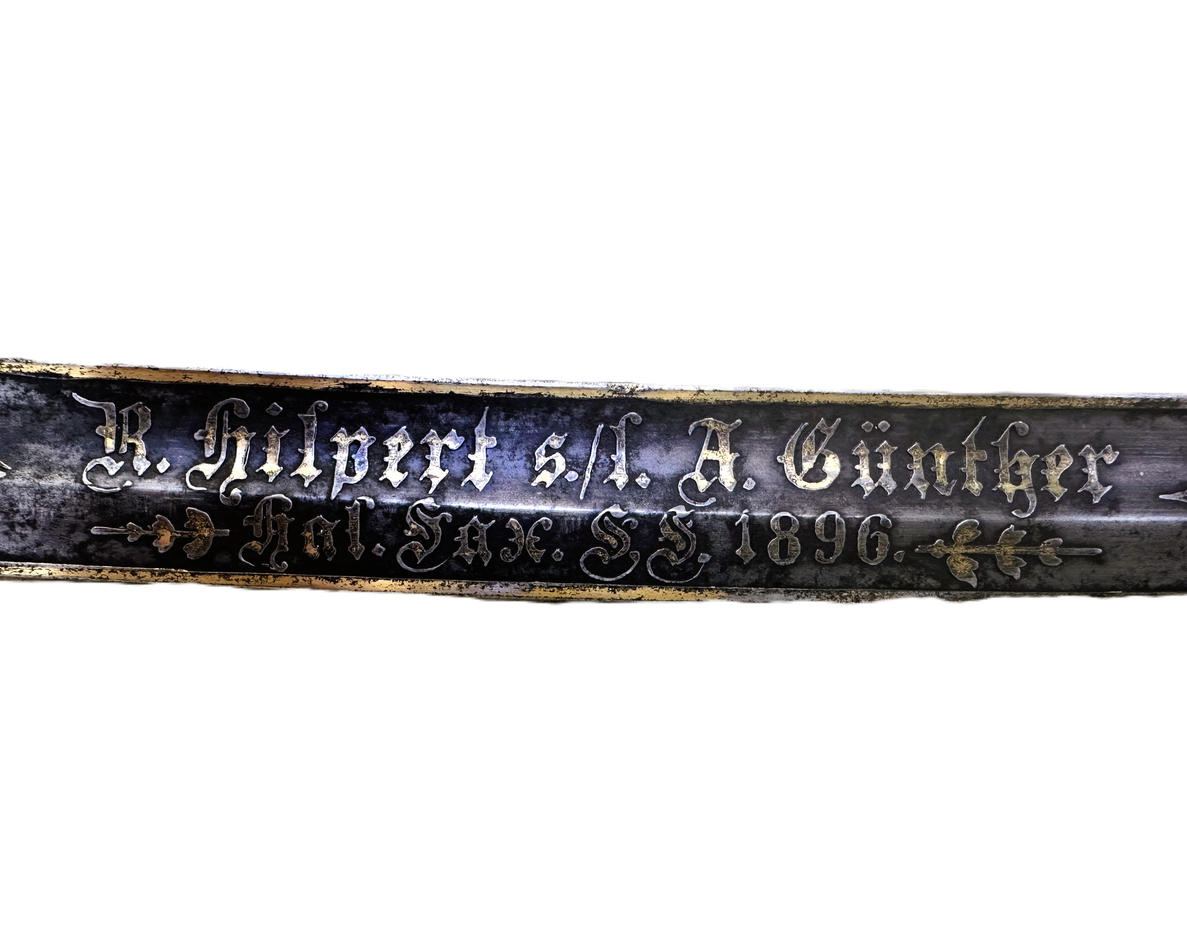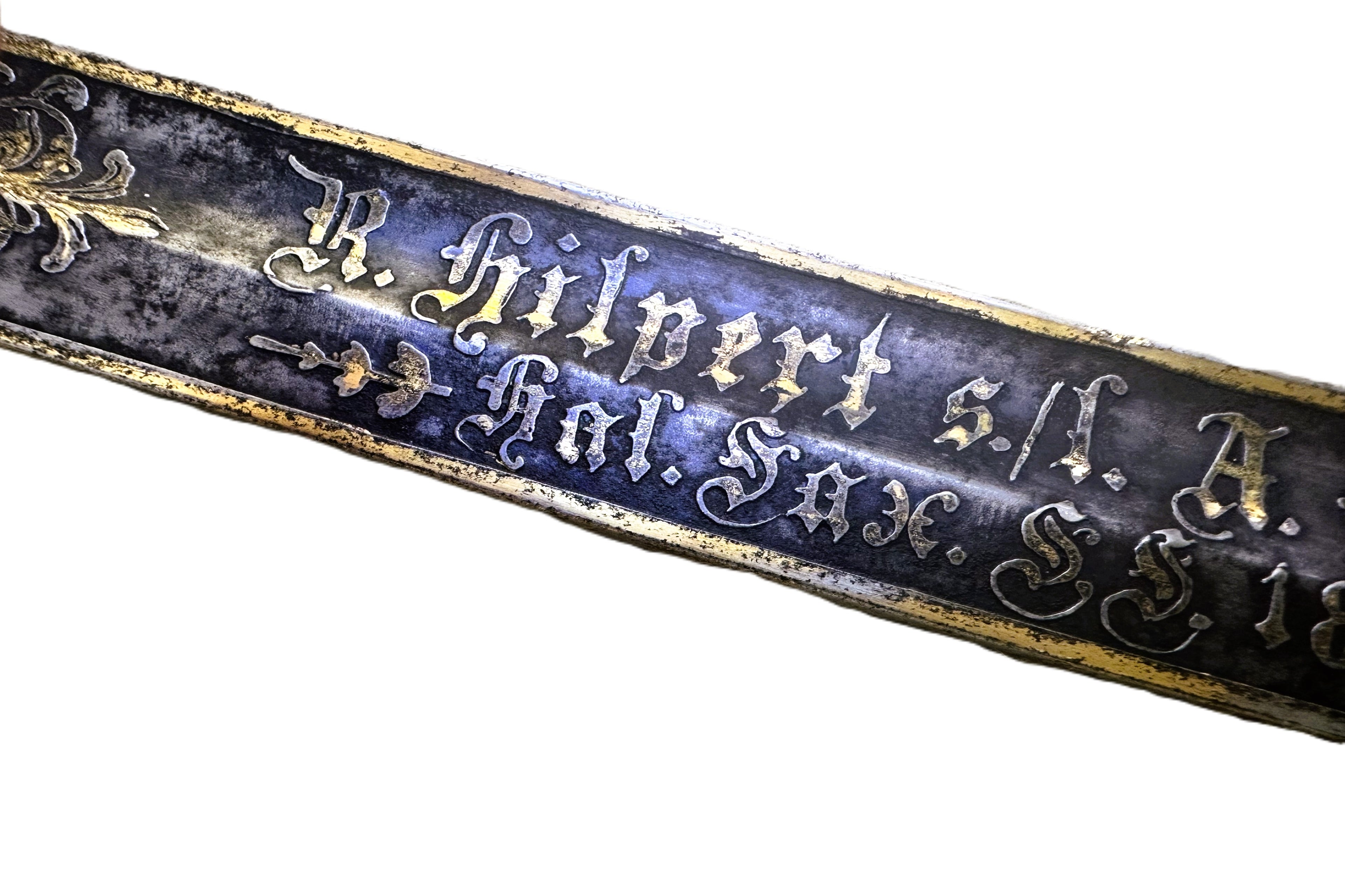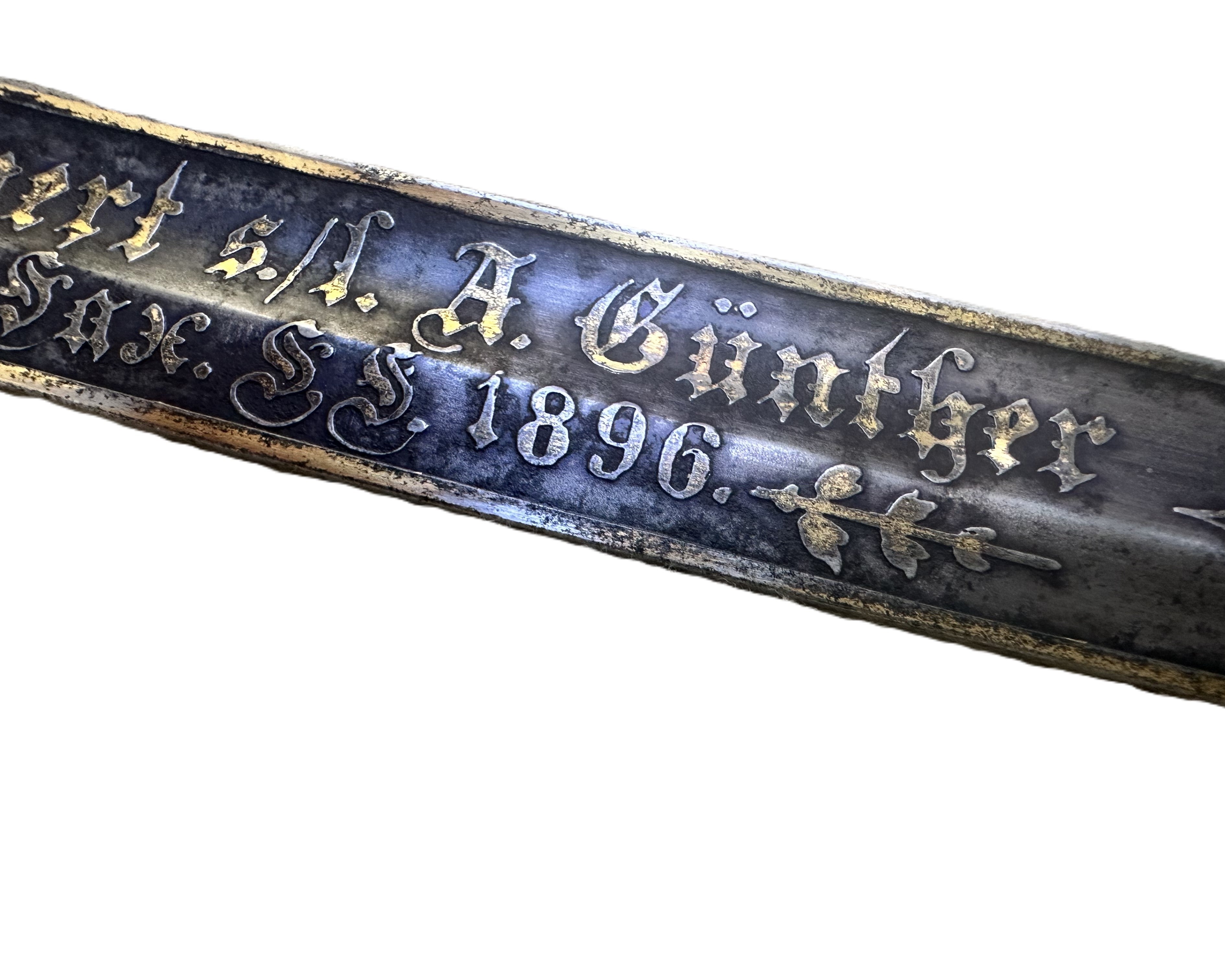 The blade, slightly curved, measures 34 inches, while the overall length of the sword is 40 inches. The blade is adorned with a black paneled design, highlighted with gilt trim, a hallmark of the finest presentation swords of the era. The engraving on one side presents a dedication to an officer named "Günther," who served in this regiment, with a history likely extending through to the end of World War I. The reverse side of the blade continues the detailed engraving in a military and floral motif.
