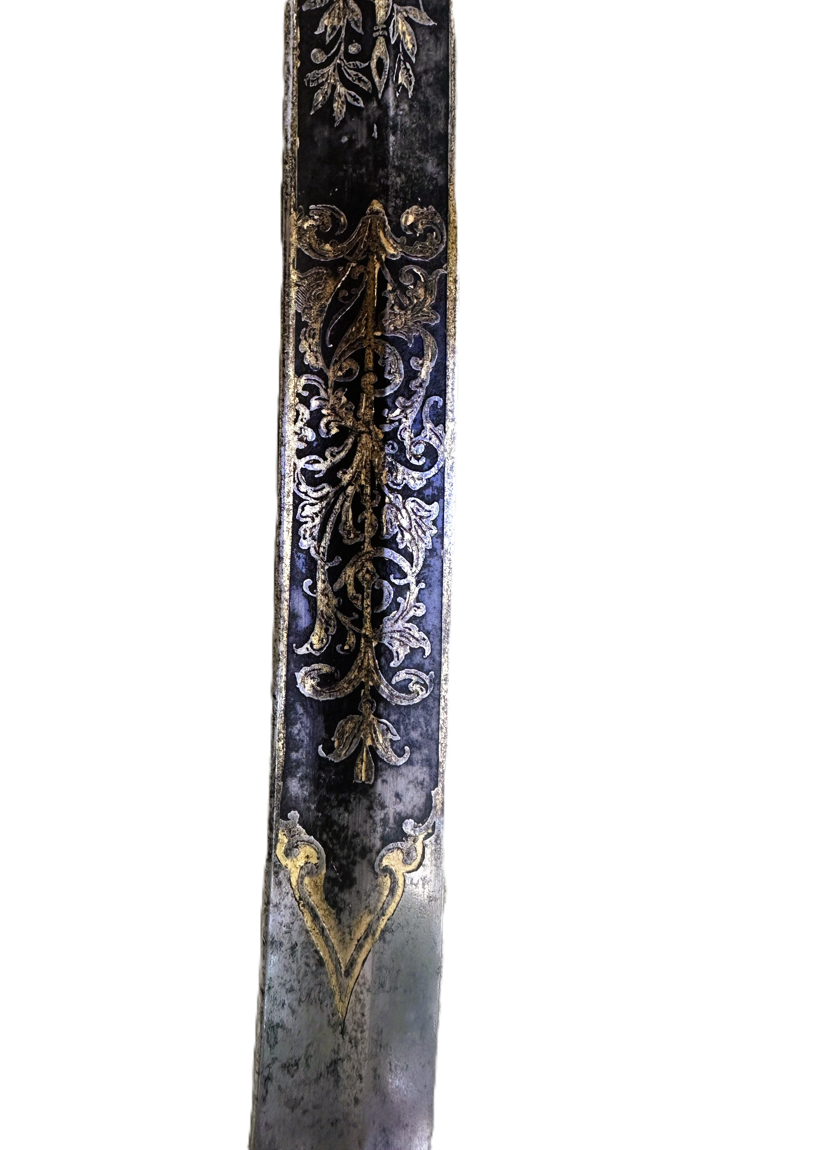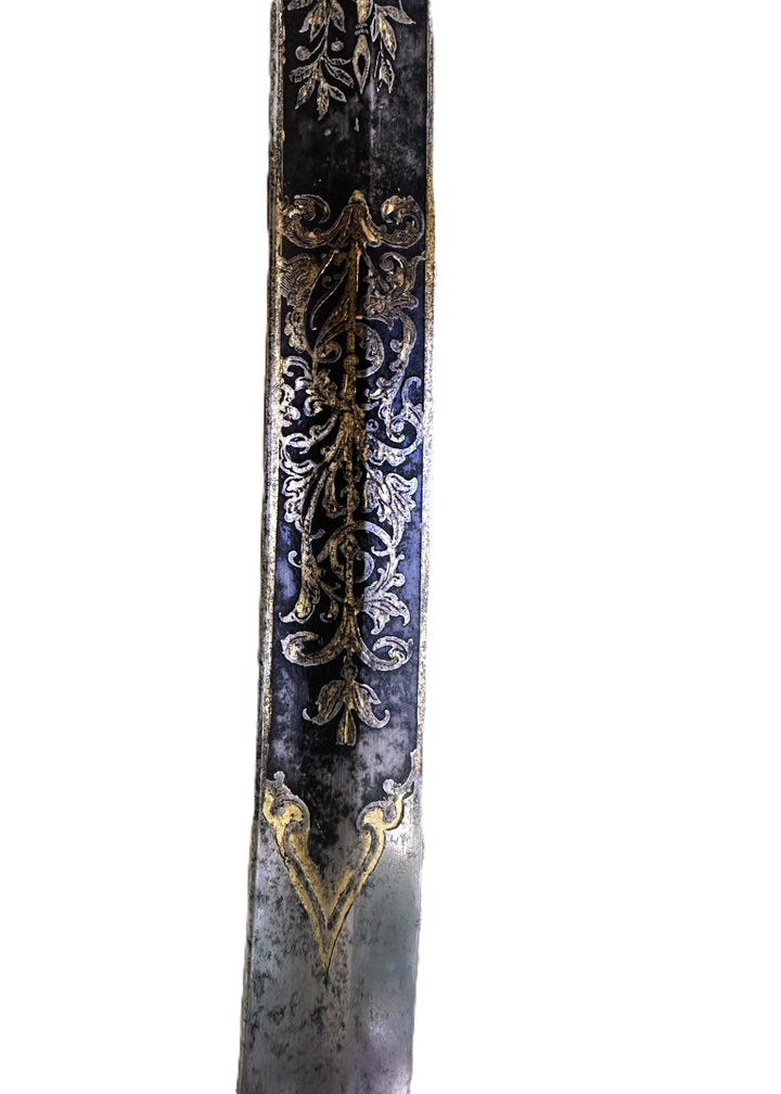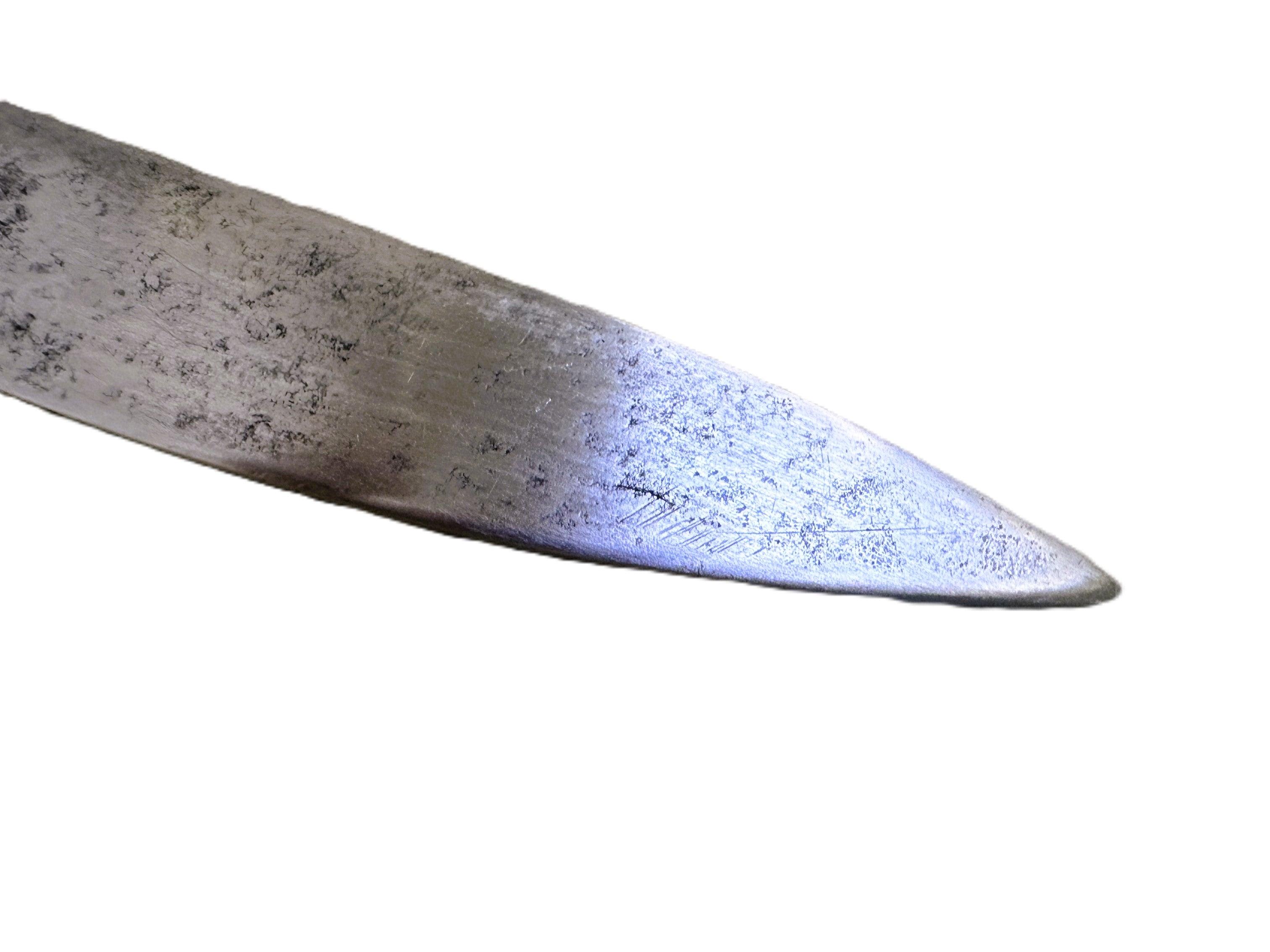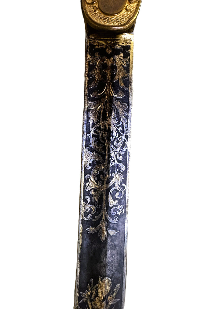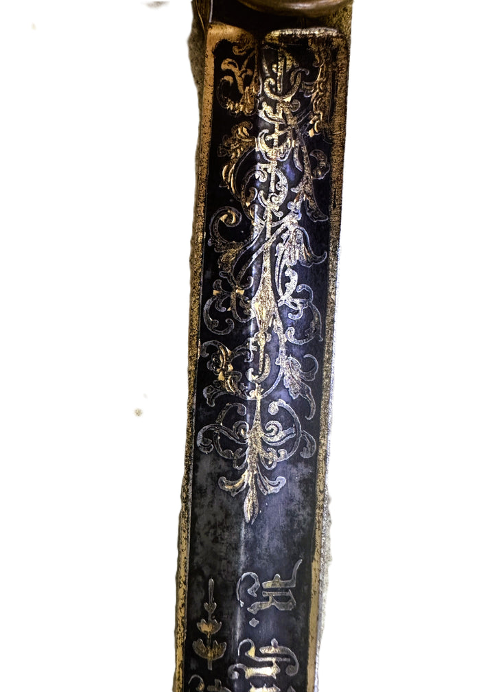 This sword has remained uncleaned for decades, maintaining a patina that reflects its age and history. However, for those inclined to clean such artifacts, a product like Simichrome© could be used to polish the metal without damaging the engravings or overall integrity of the piece.