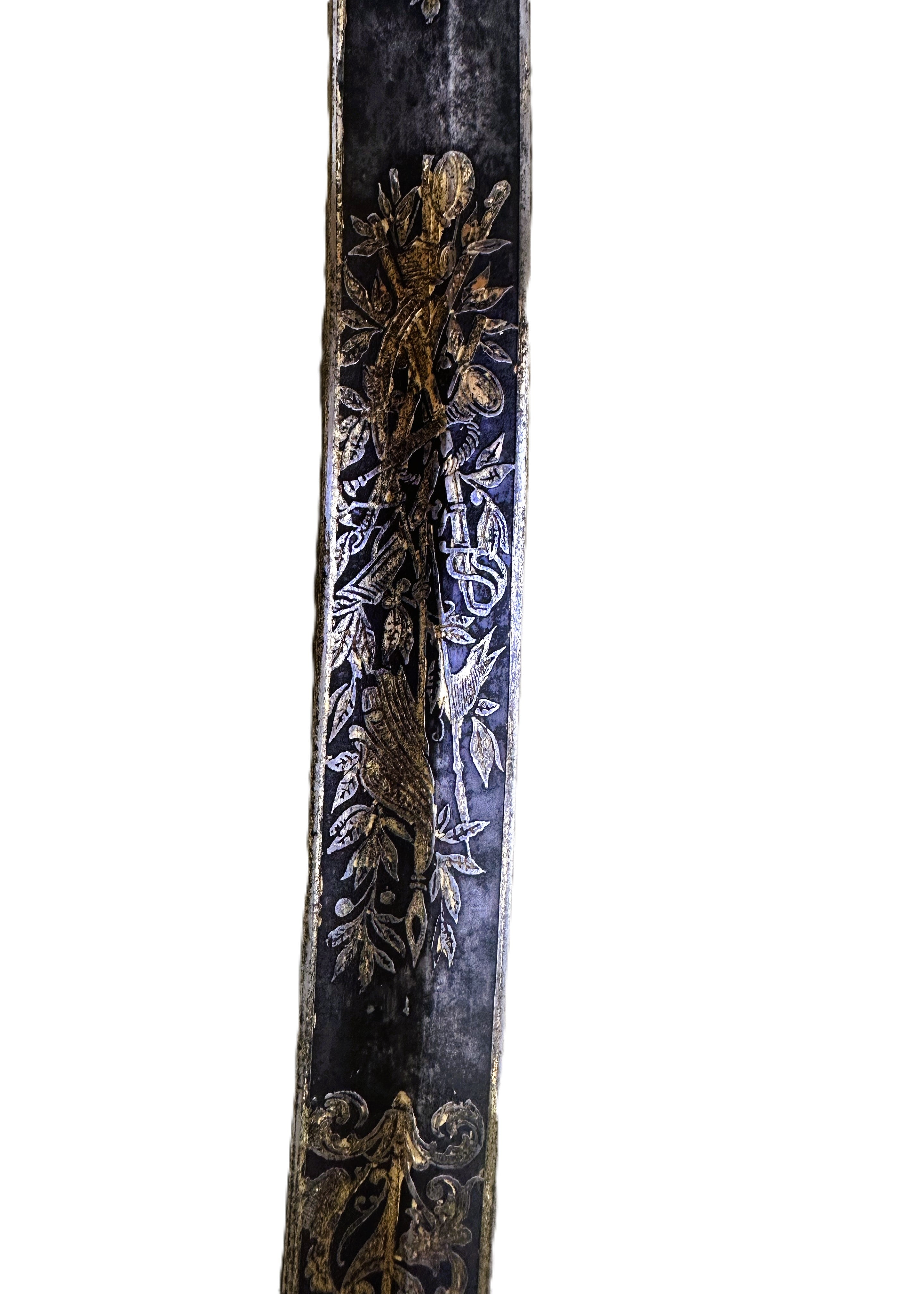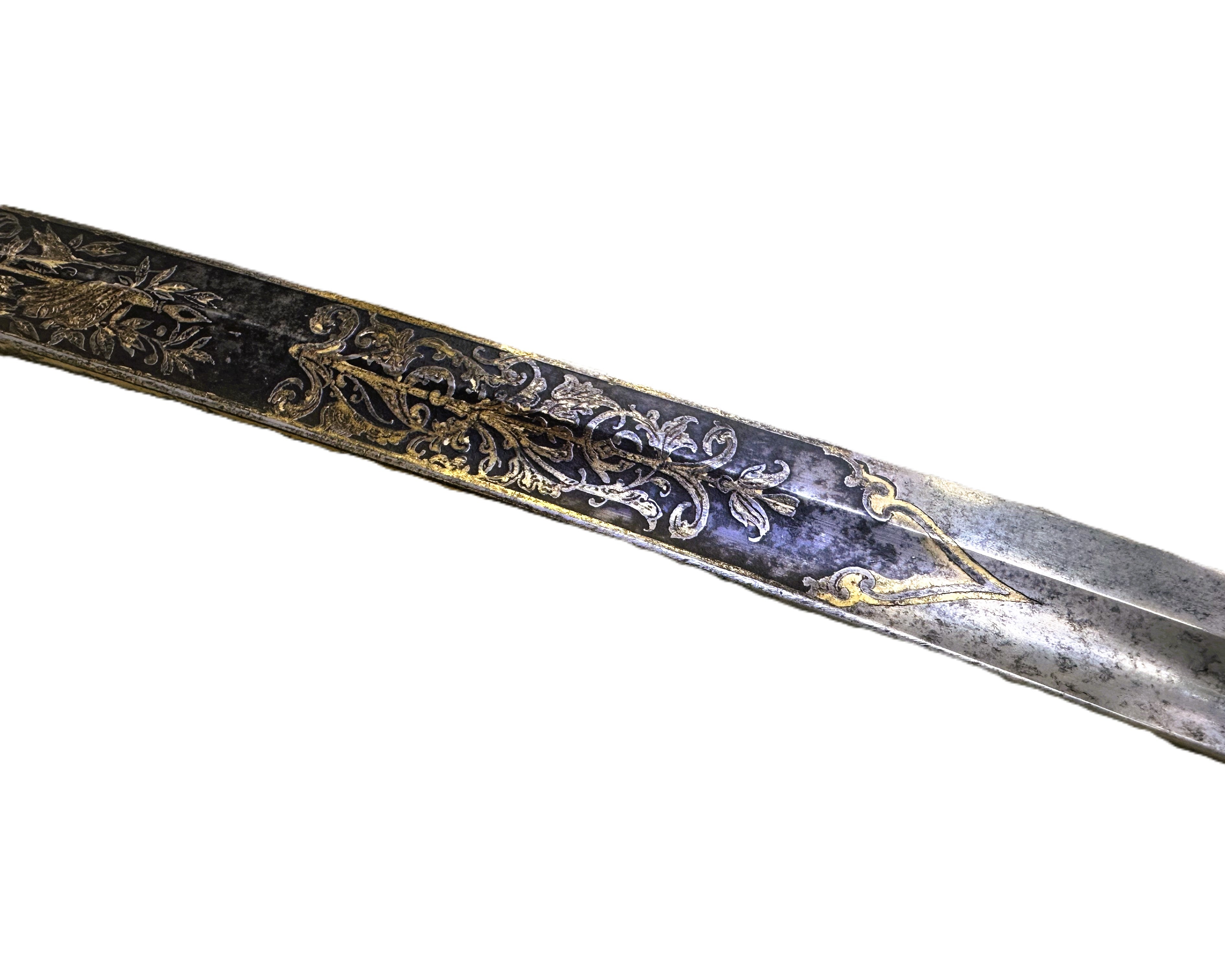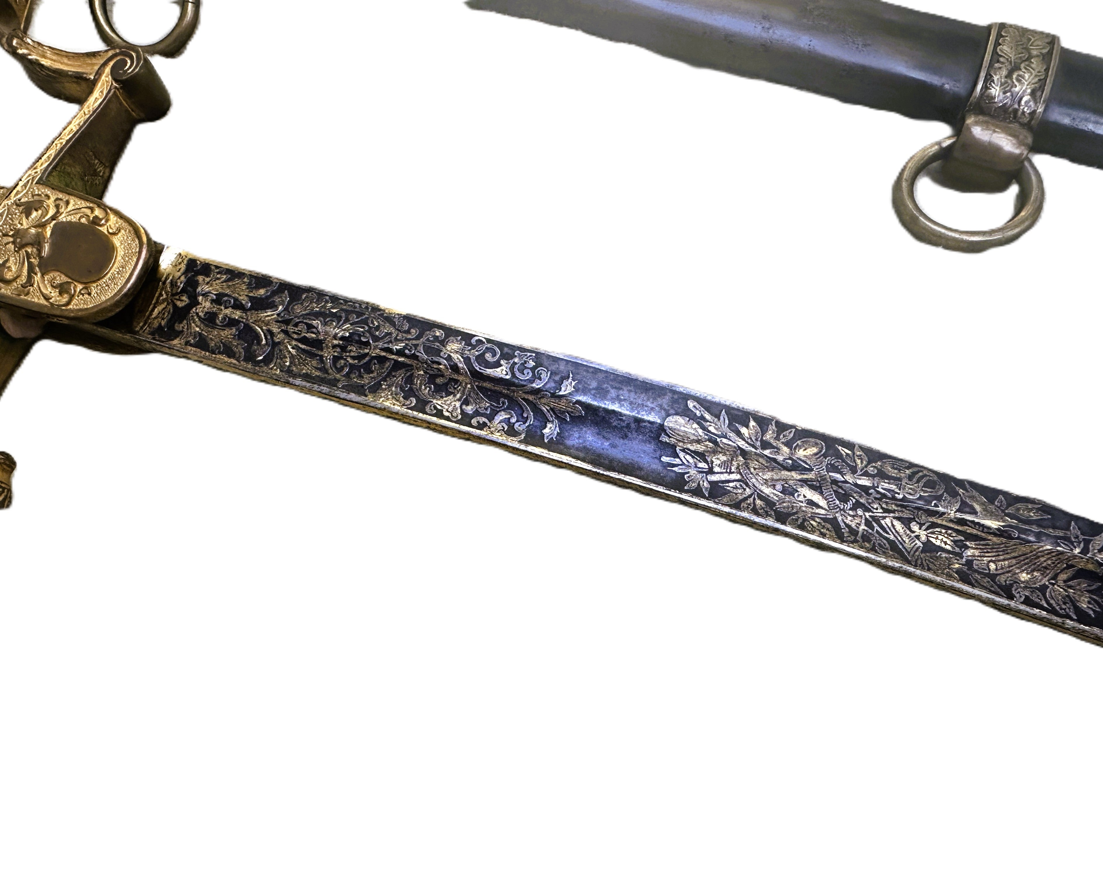 This sword has remained uncleaned for decades, maintaining a patina that reflects its age and history. However, for those inclined to clean such artifacts, a product like Simichrome© could be used to polish the metal without damaging the engravings or overall integrity of the piece.