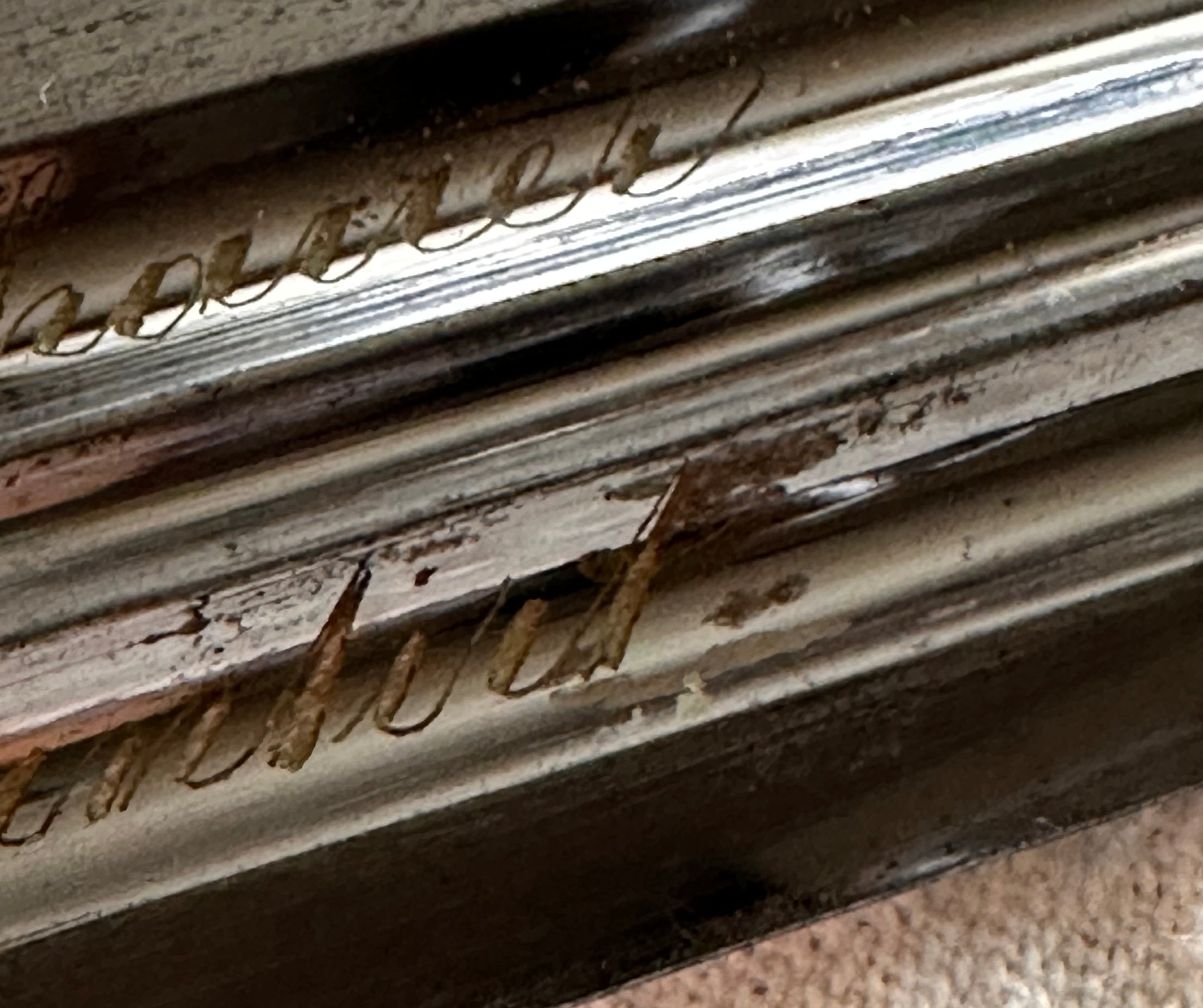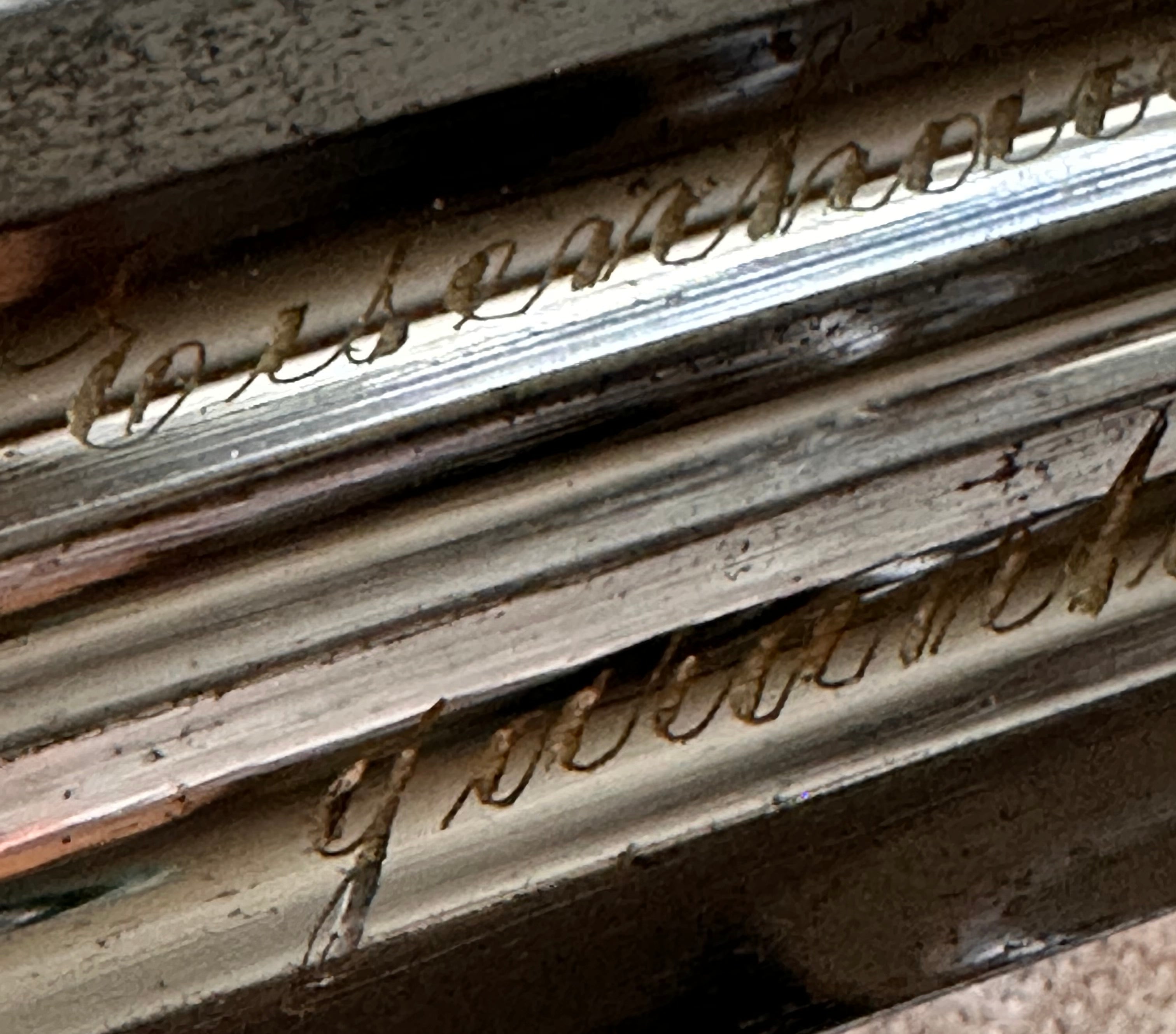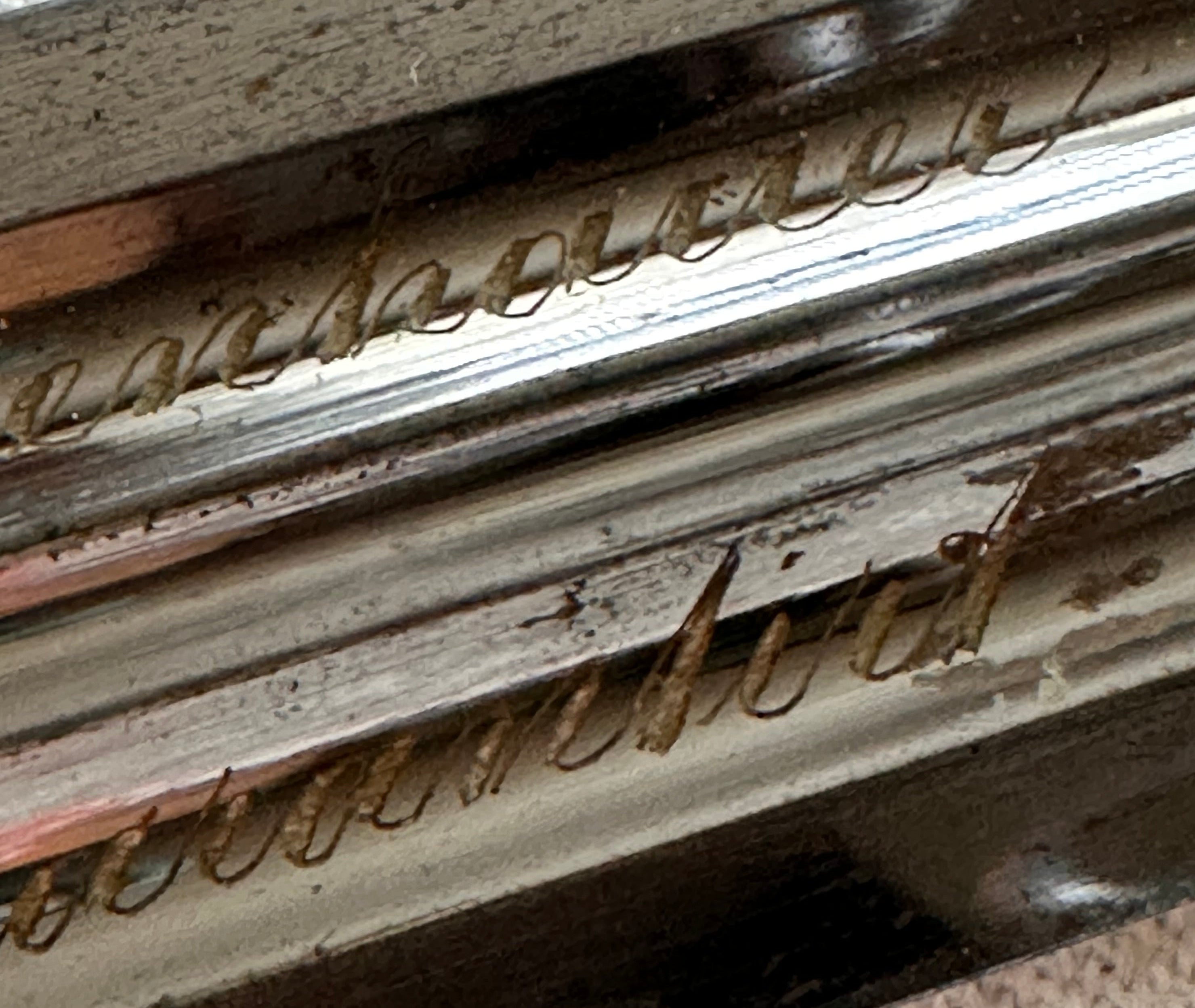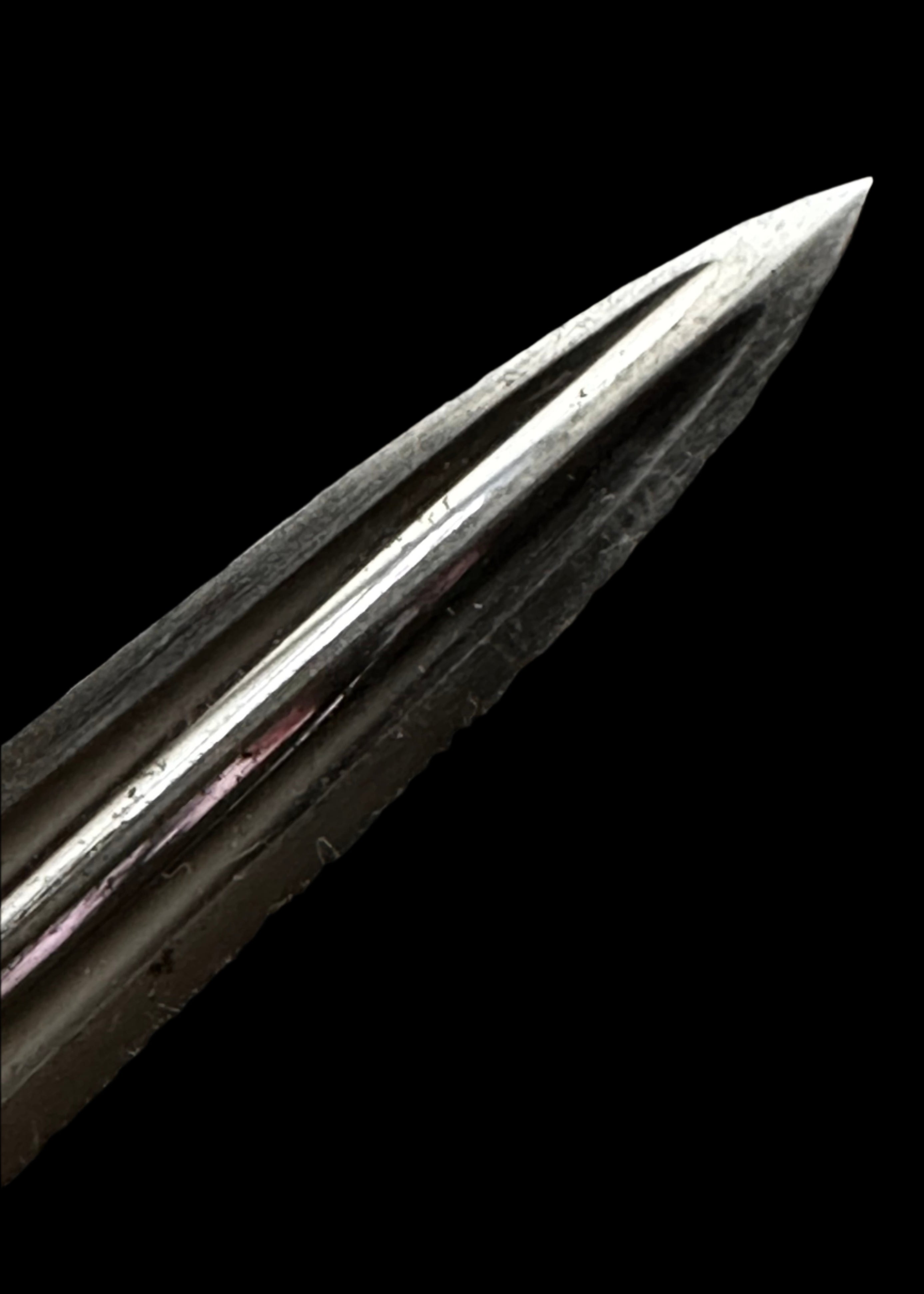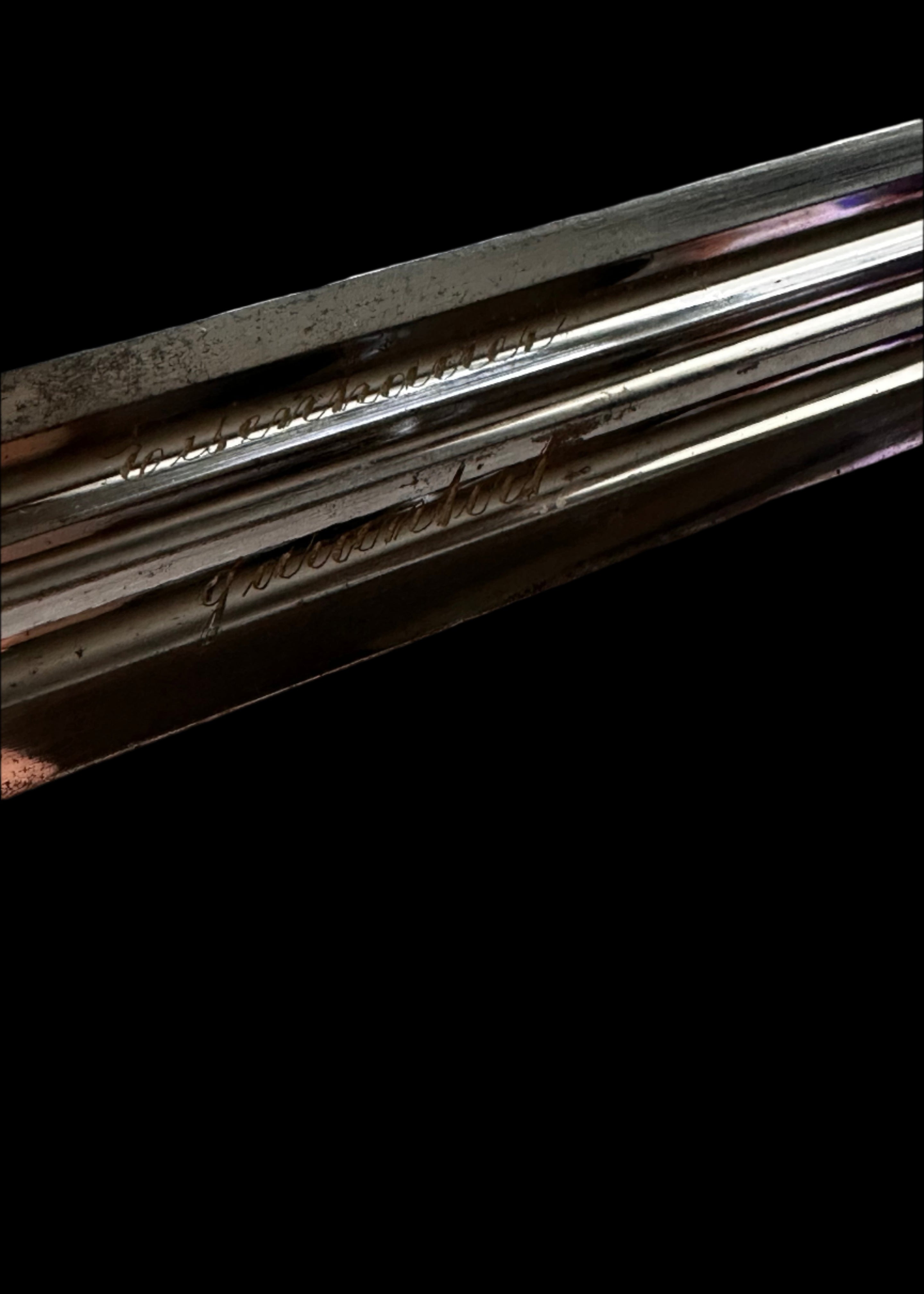 Blade: Straight, slender blade with double fullers extending much of its length. Private purchase examples of this type often carried etched mottoes such as “Eisenhauer garantiert” (iron proof) or a Leipzig/Dresden retailer’s mark; traces of etching may be visible but are partially muted by age and wear. Edge remains true, with no significant nicks or distortions.