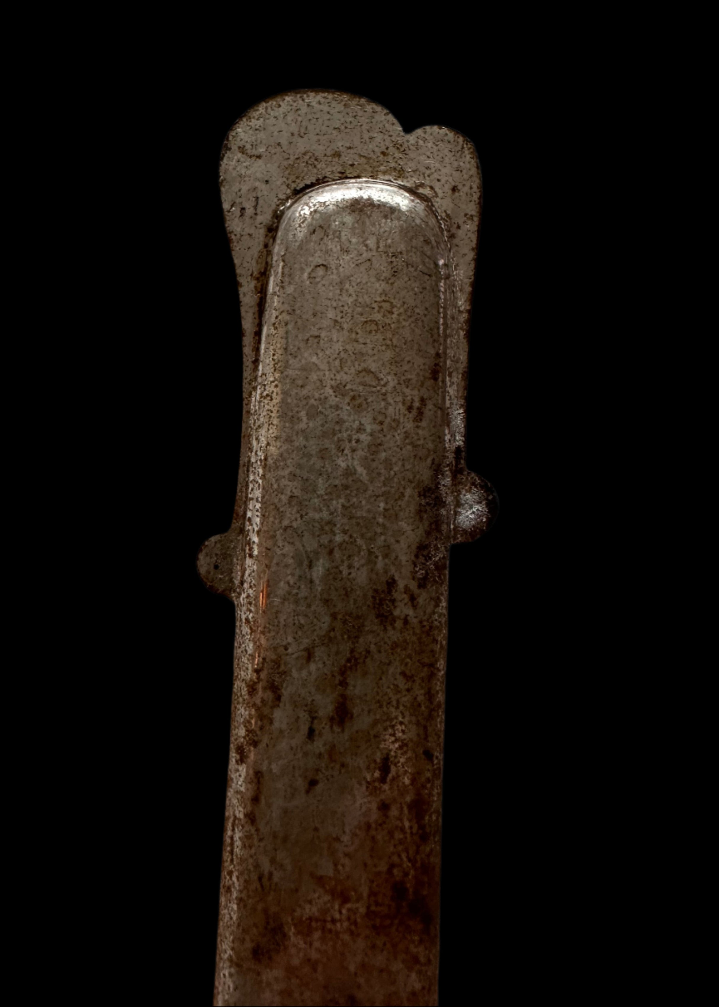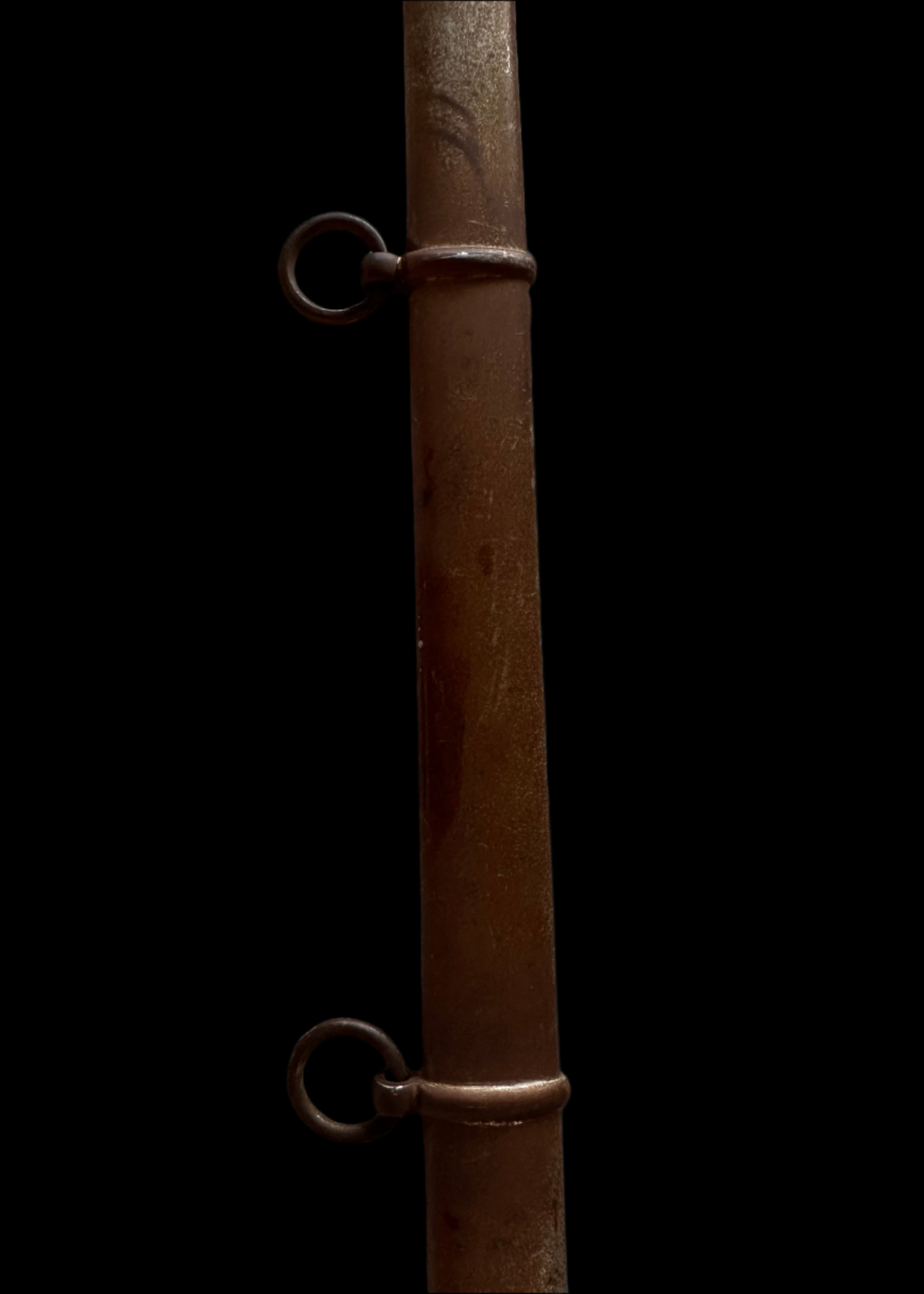 Scabbard: Steel scabbard with dual suspension rings. Finish shows honest age with areas of oxidation and surface spotting, yet remains structurally sound and free of major dents. Blade fits securely.