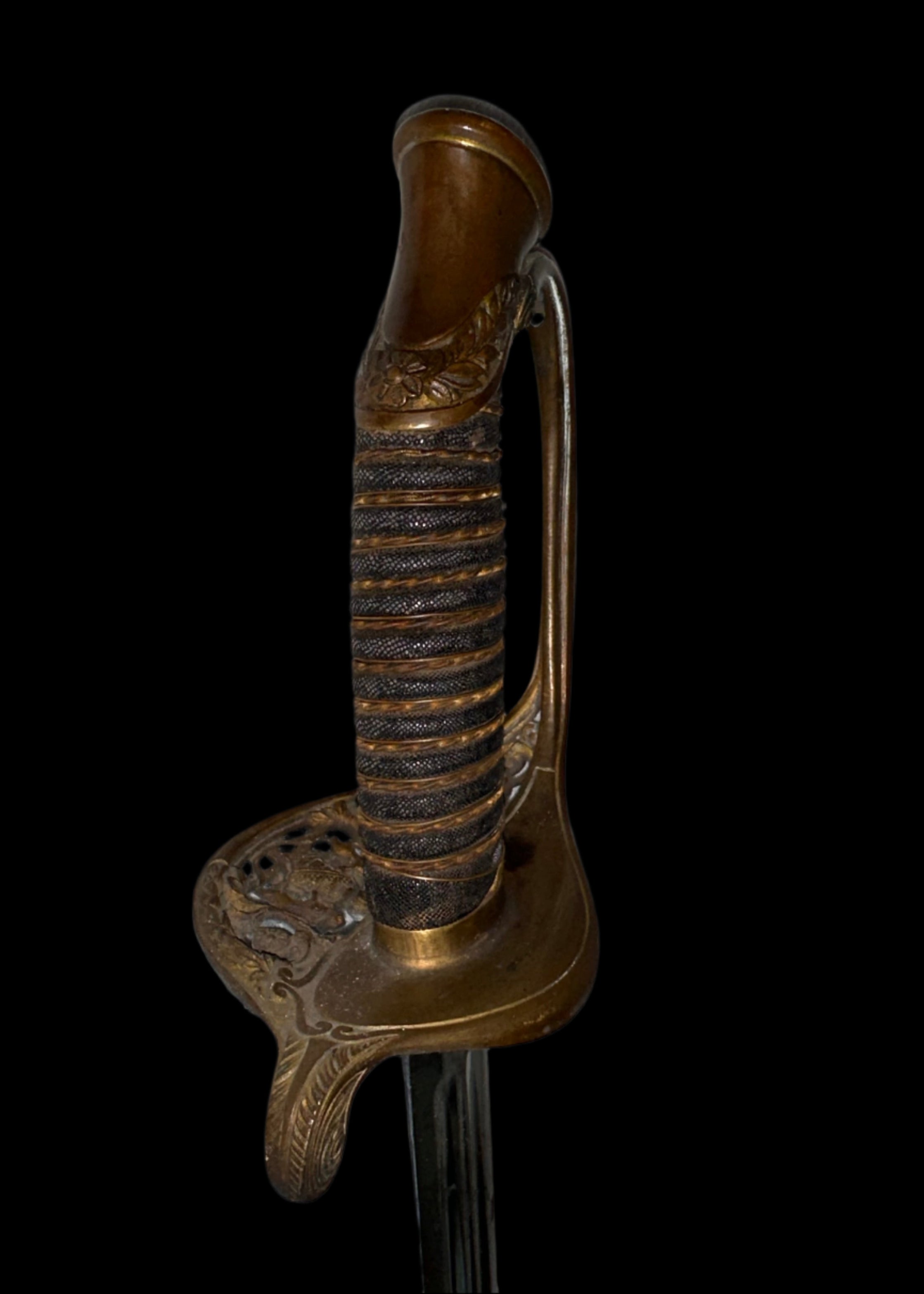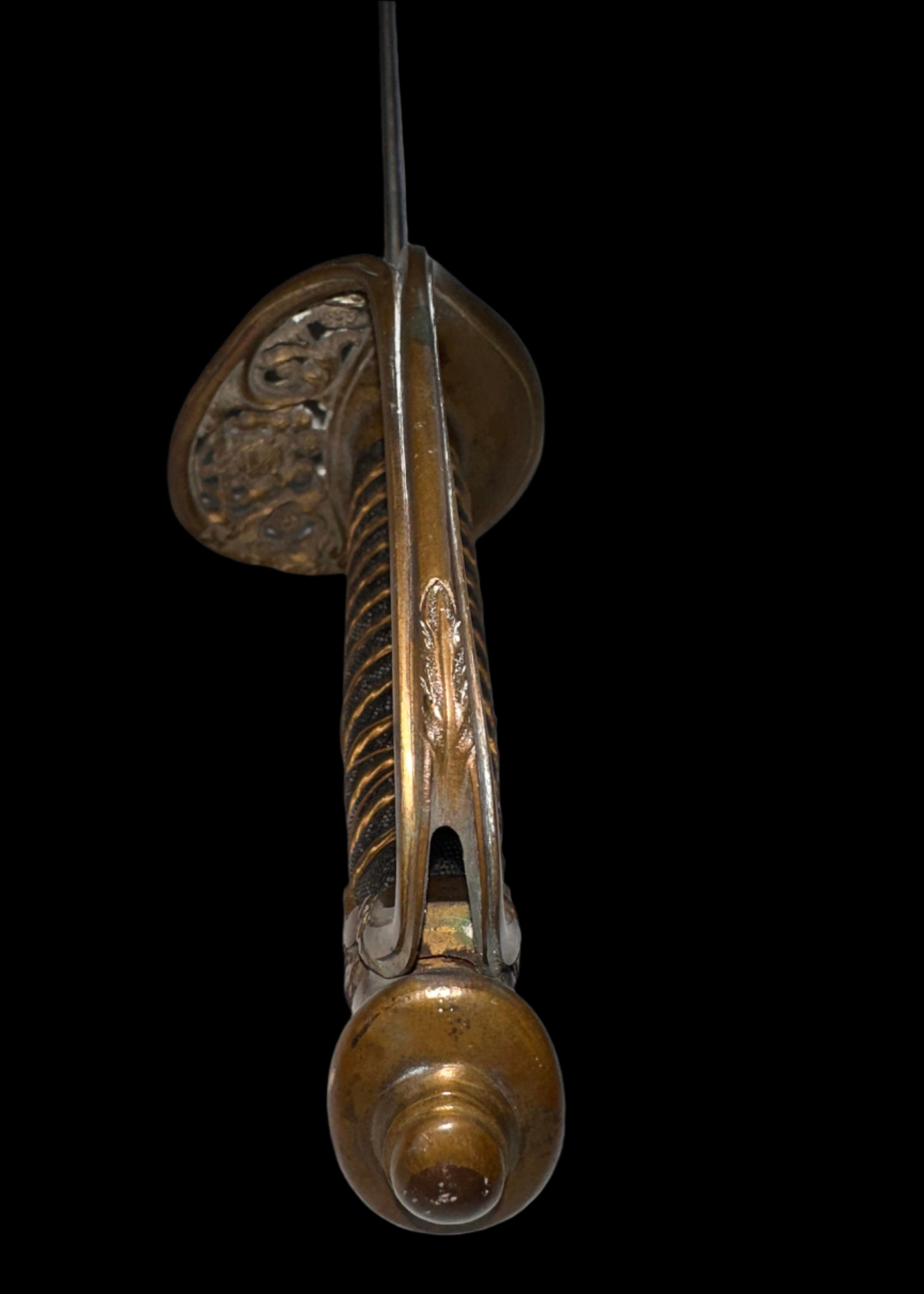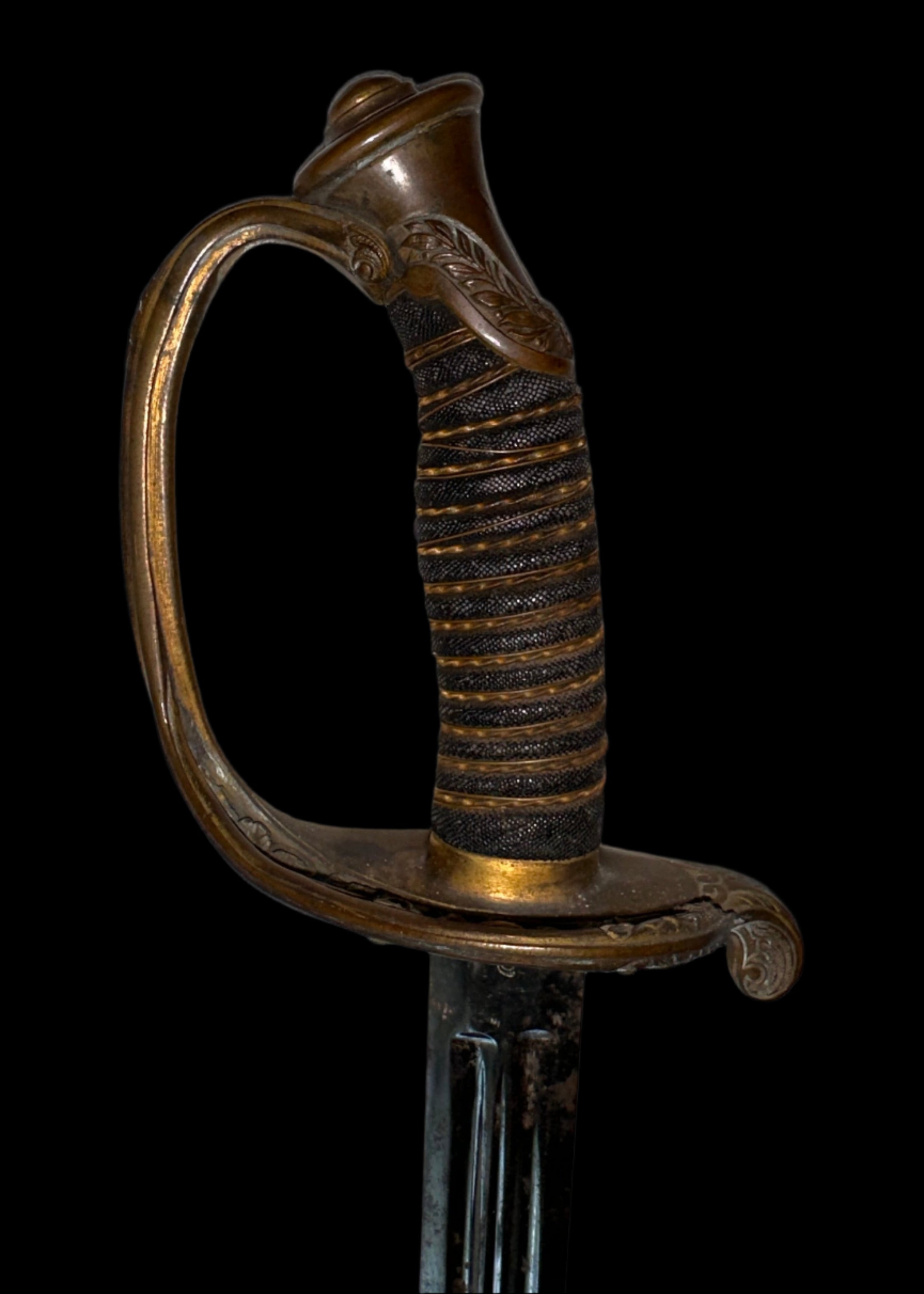 This is a fine and well-preserved example of the Saxon Infantry Officer’s Degen (Infanterie-Offizier-Degen, M1867), a regulation sidearm carried by officers of the Kingdom of Saxony during the late 19th and early 20th centuries. While closely modeled on the French officer’s épée design, the Saxon version is distinguished by its straight, double-fullered blade and the incorporation of the Saxon state arms on the guard.