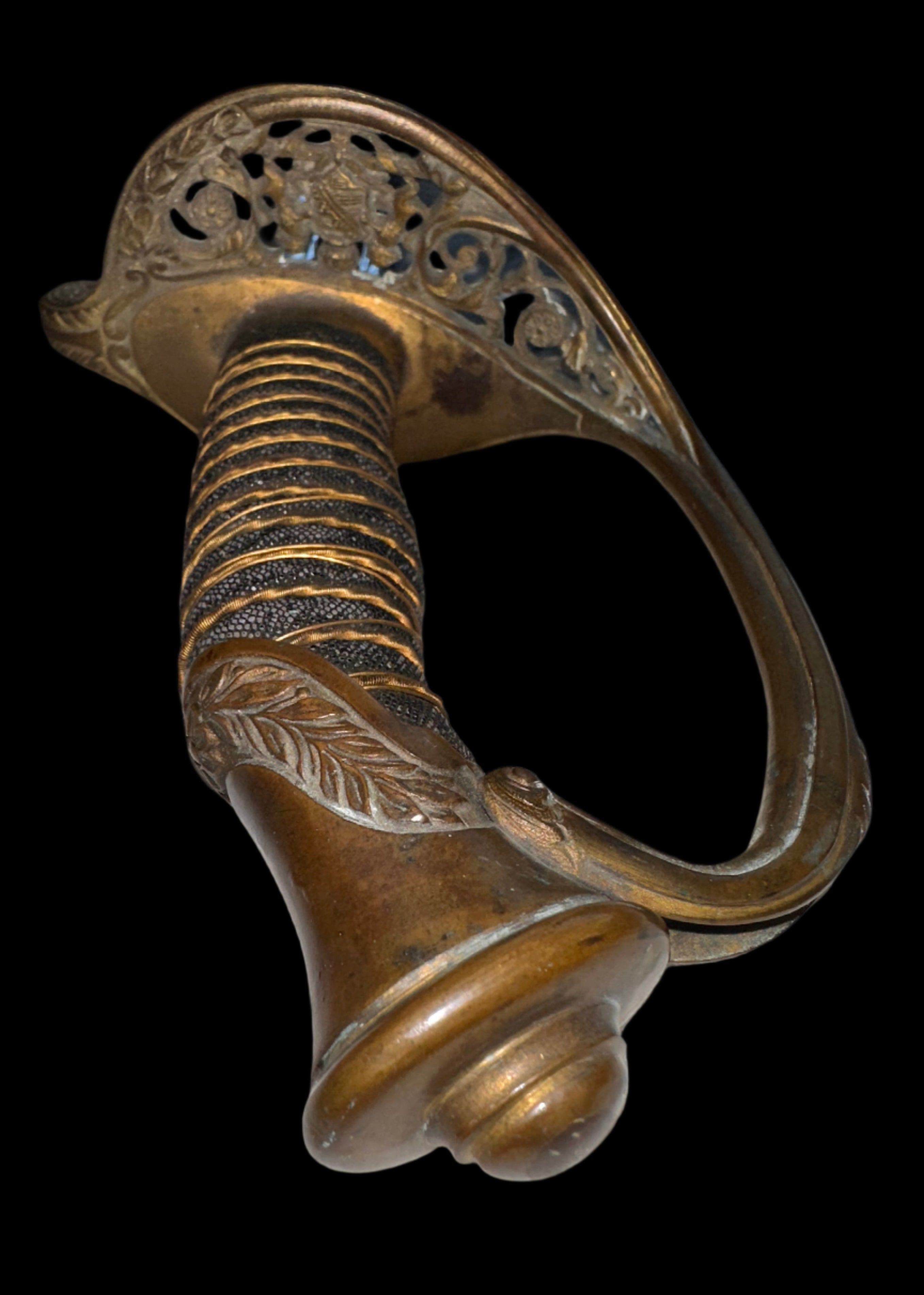 Hilt: Brass guard with openwork design, pierced to display the crowned Saxon coat of arms with diagonal striped shield and oak-leaf scrolls. The brass has developed an attractive patina consistent with age. The grip is wrapped in shagreen (sharkskin) and bound with twisted brass wire, all intact and without structural loss. Pommel is barrel-shaped with stepped tang nut, typical of officer’s degen construction.