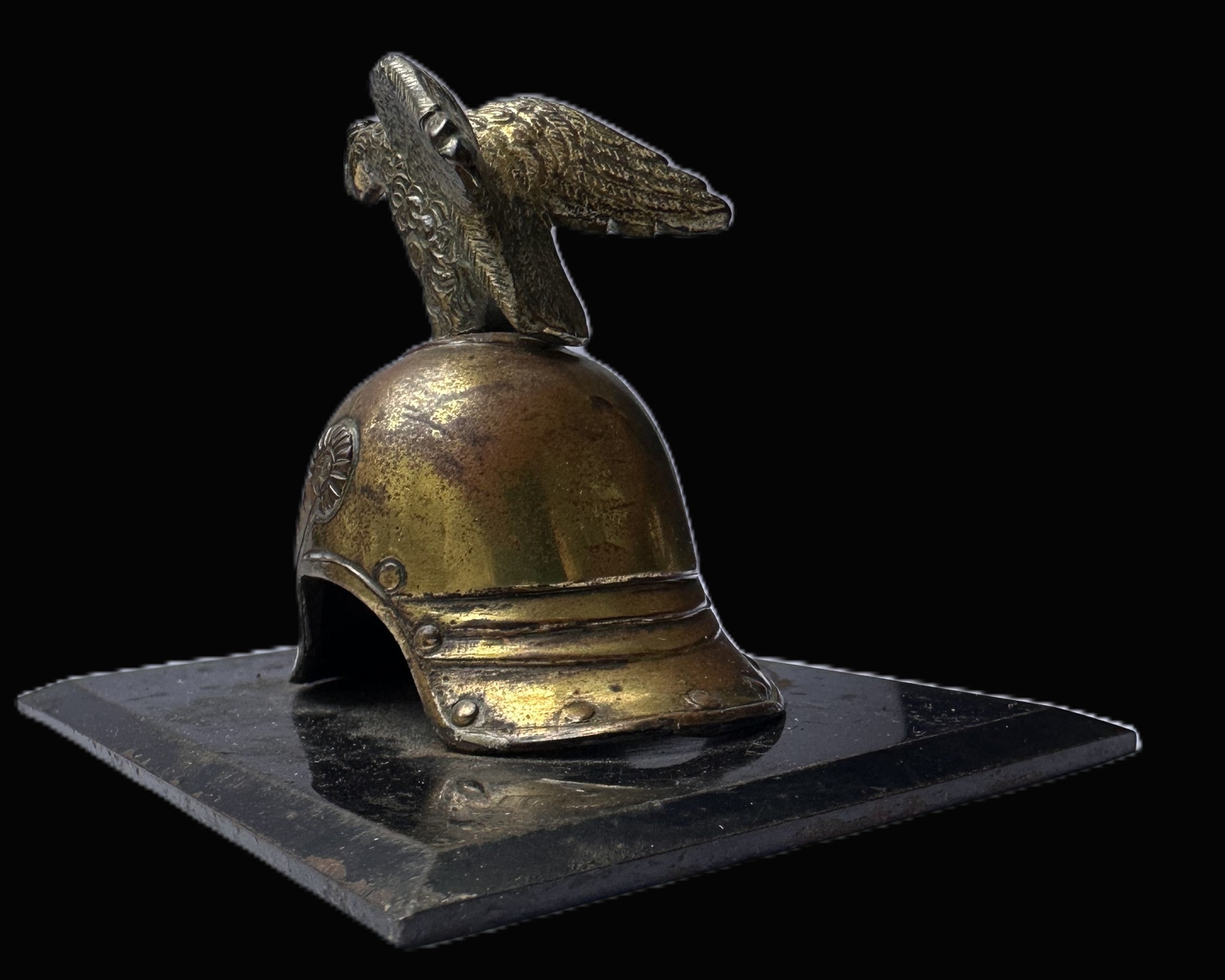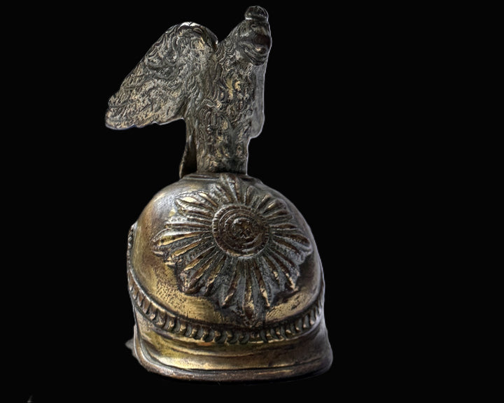 On the side is a small rosette and strap detail in relief, again consistent with a cuirassier/guard helmet aesthetic where cockade and side hardware are defining visual cues even when rendered as a miniature. Above, the helmet is topped by an eagle finial with wings spread, sculpted with heavy feather and body detail. The eagle is finished in a darker tone than the helmet bowl, either from oxidation, intentional contrast, or accumulated age, which adds depth and makes the piece photograph well. The eagle’s stance and overall presentation read as Prussian in spirit, and the combination of eagle finial, brilliant-metal helmet form, and prominent burst motif is exactly the kind of shorthand that miniature makers used when referencing Prussia’s guard and cuirassier traditions.